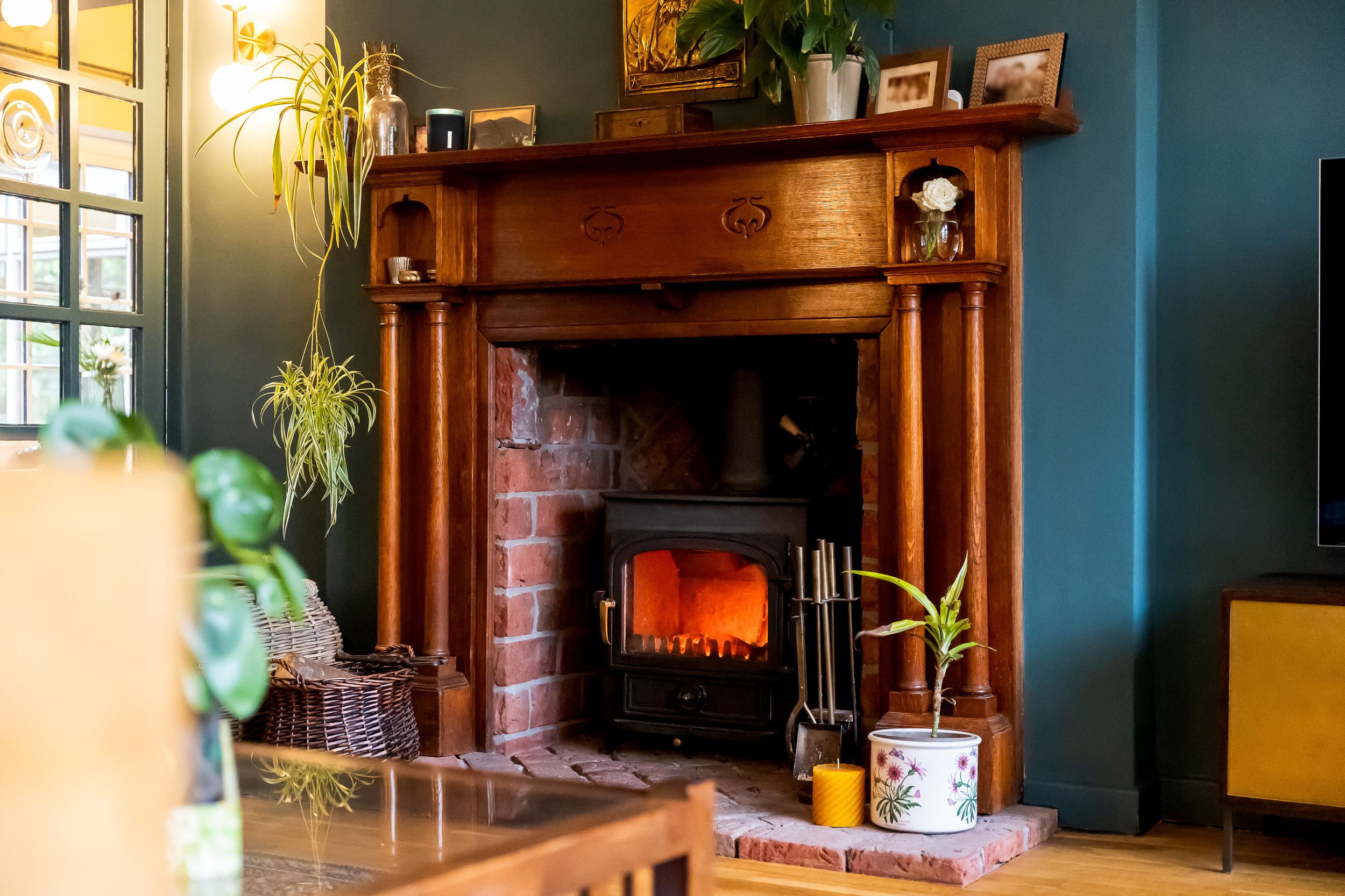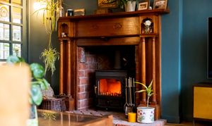 The lounge, set beyond glazed double doors to the left, with its fantastic size and height, carries these darker hues with confidence. Naturally saturated with light from a large bow window to the front and another window to the rear, wooden flooring flows through from the hallway, while a handsome wooden fire surround houses a log-burning stove. Now a warm and cosy evening room, this room was once part of the original stable block.