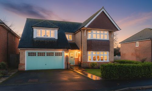 Pull onto the driveway, where there is plentiful parking for multiple cars on the driveway itself, with additional space for two cars in front of the double garage, furnished with lighting. An electric vehicle charging point is also available to the front outside the study.