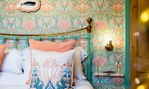 A serene sanctuary, a peaceful palette of mint green and peach lends a Victorian elegance to the master bedroom, where there is ample space for a super king bed.