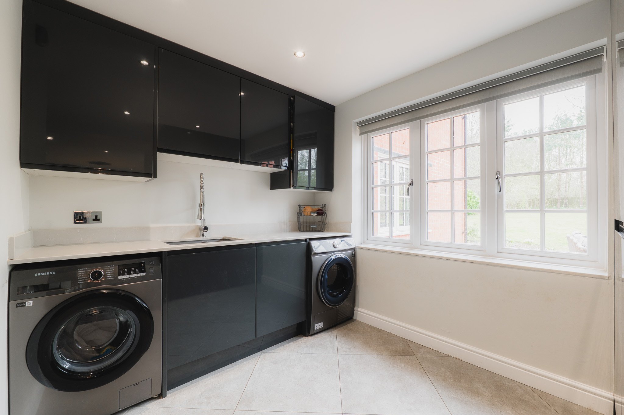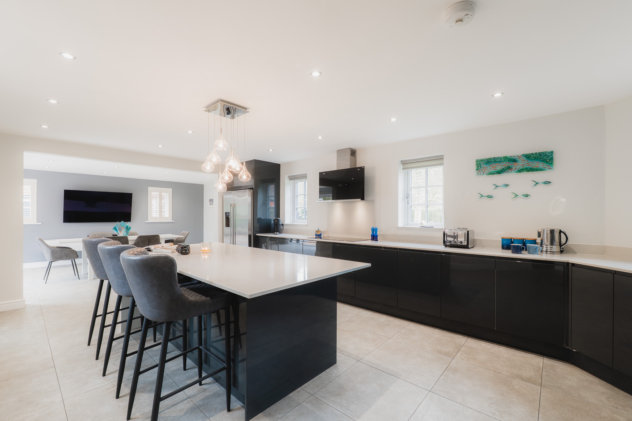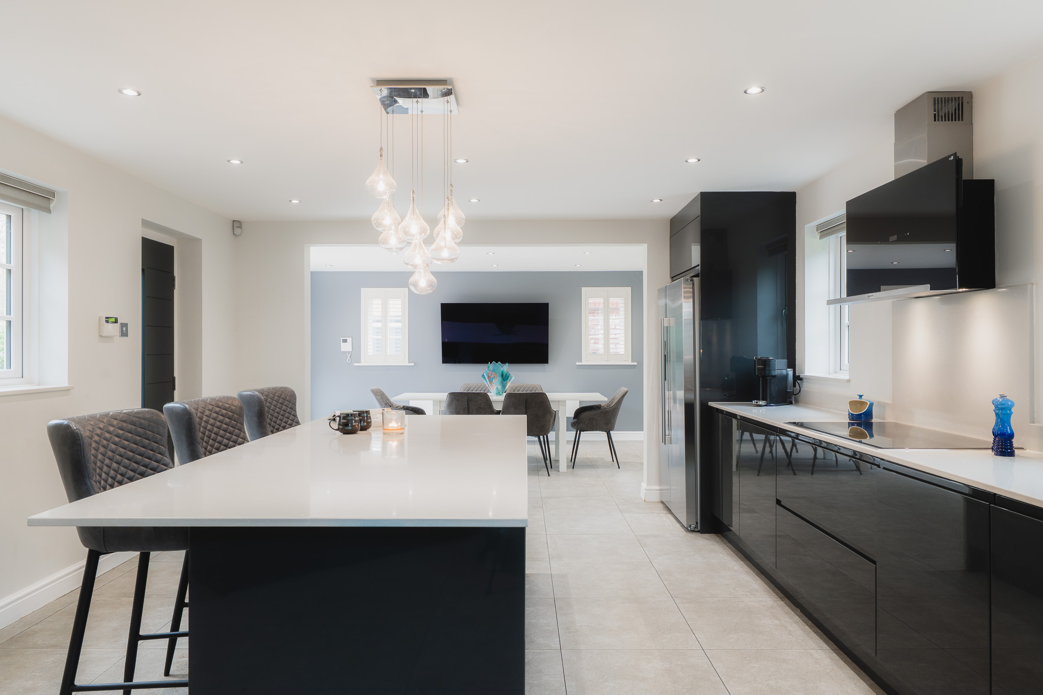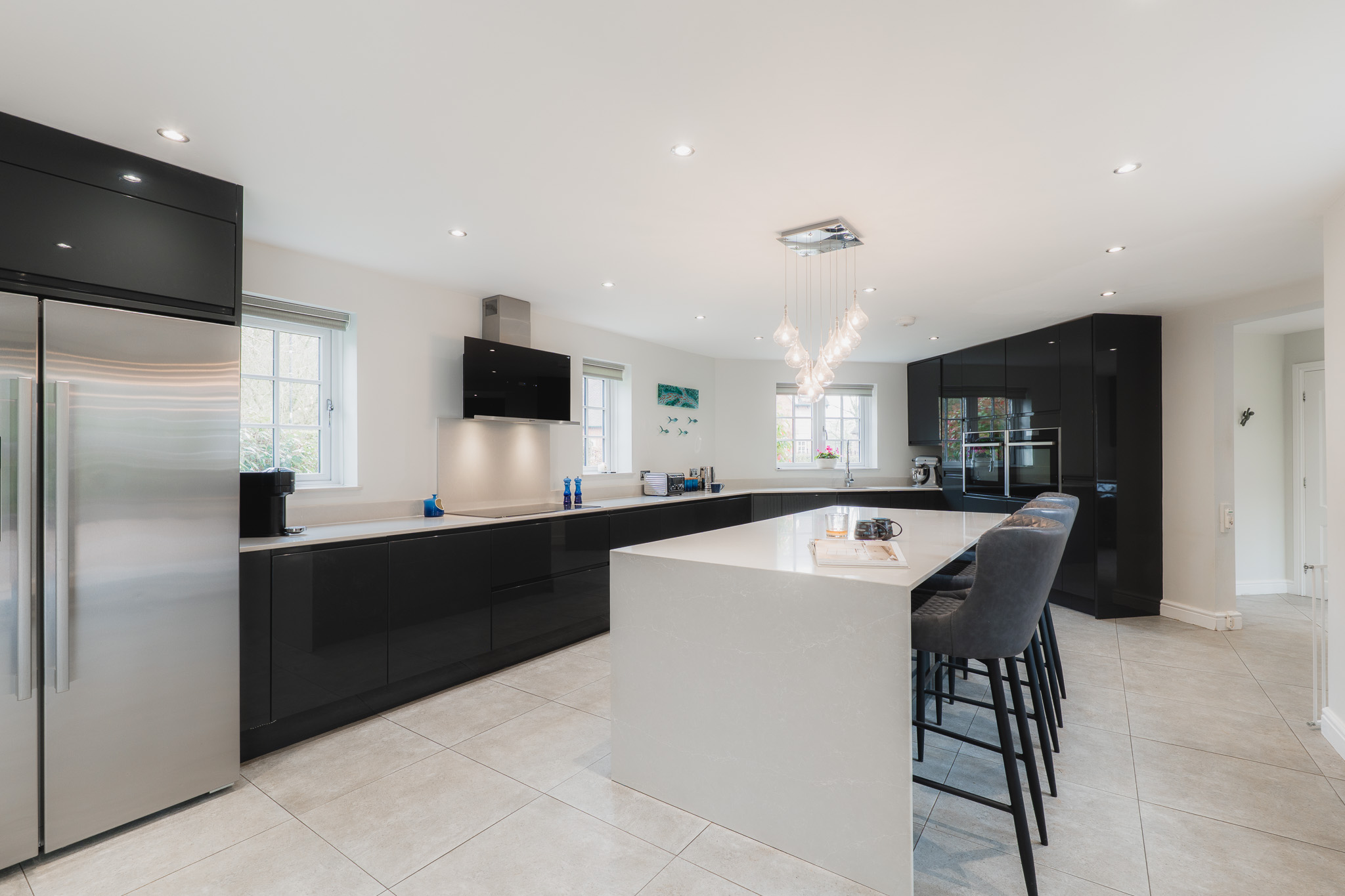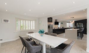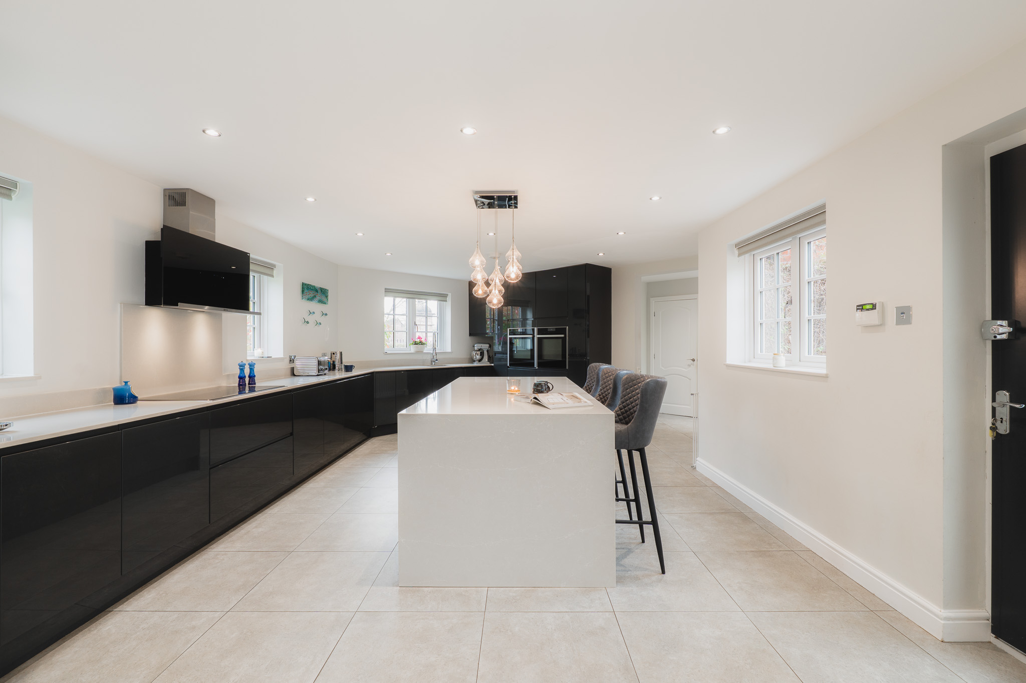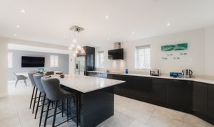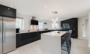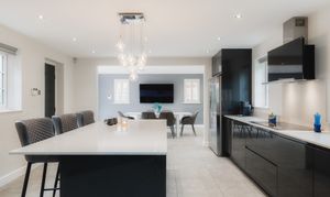 Beyond the utility room, the vast dining kitchen awaits. Tiled underfoot, warmed by underfloor heating, and resplendent in monochrome, the kitchen is the sociable hub of the home.