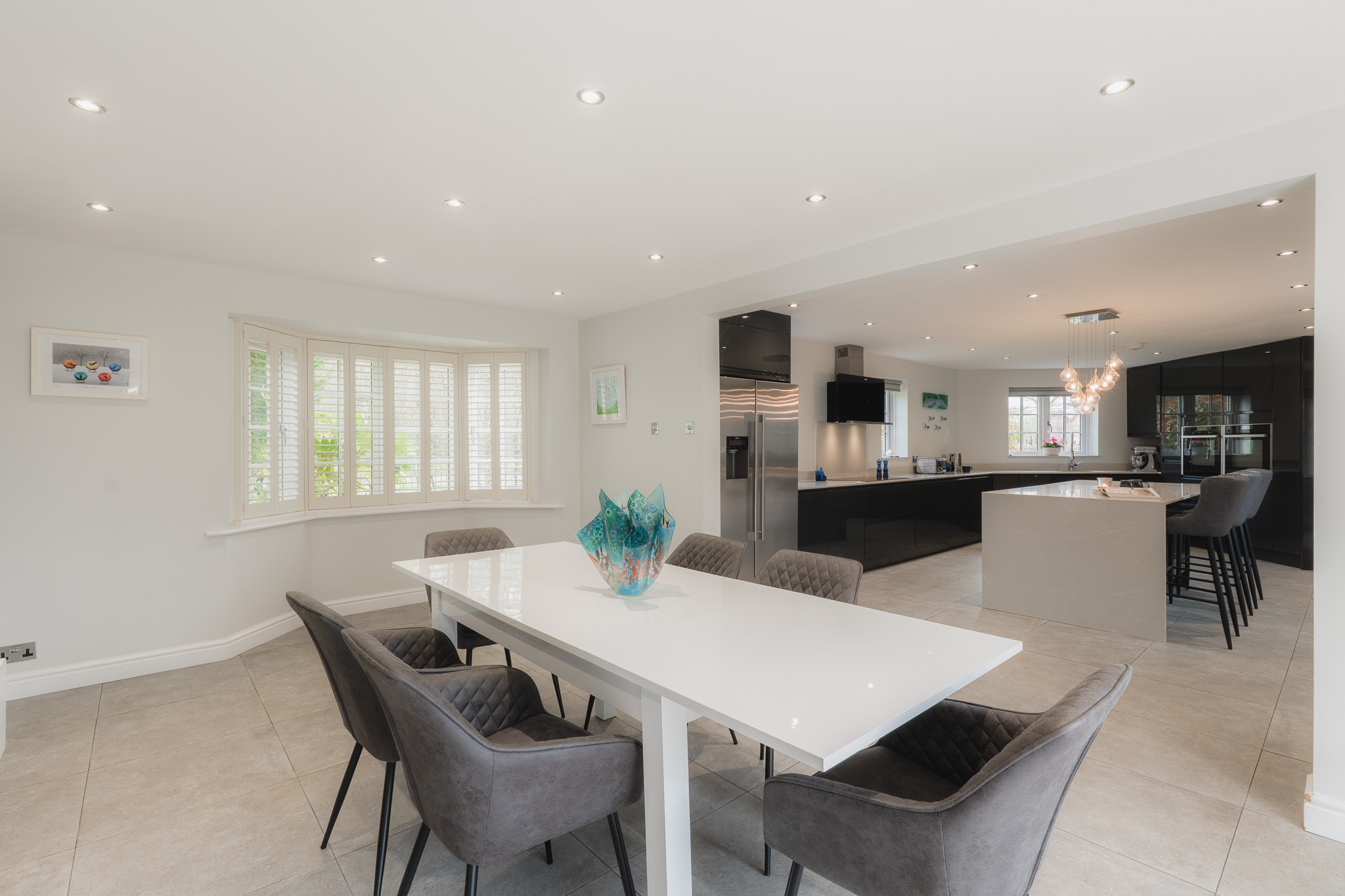Storage is prevalent, with plenty of surface space, while electric blinds offer ease and privacy at the touch of a button. Open and light, the reworked layout offers an easy flow perfectly attuned to modern family life.