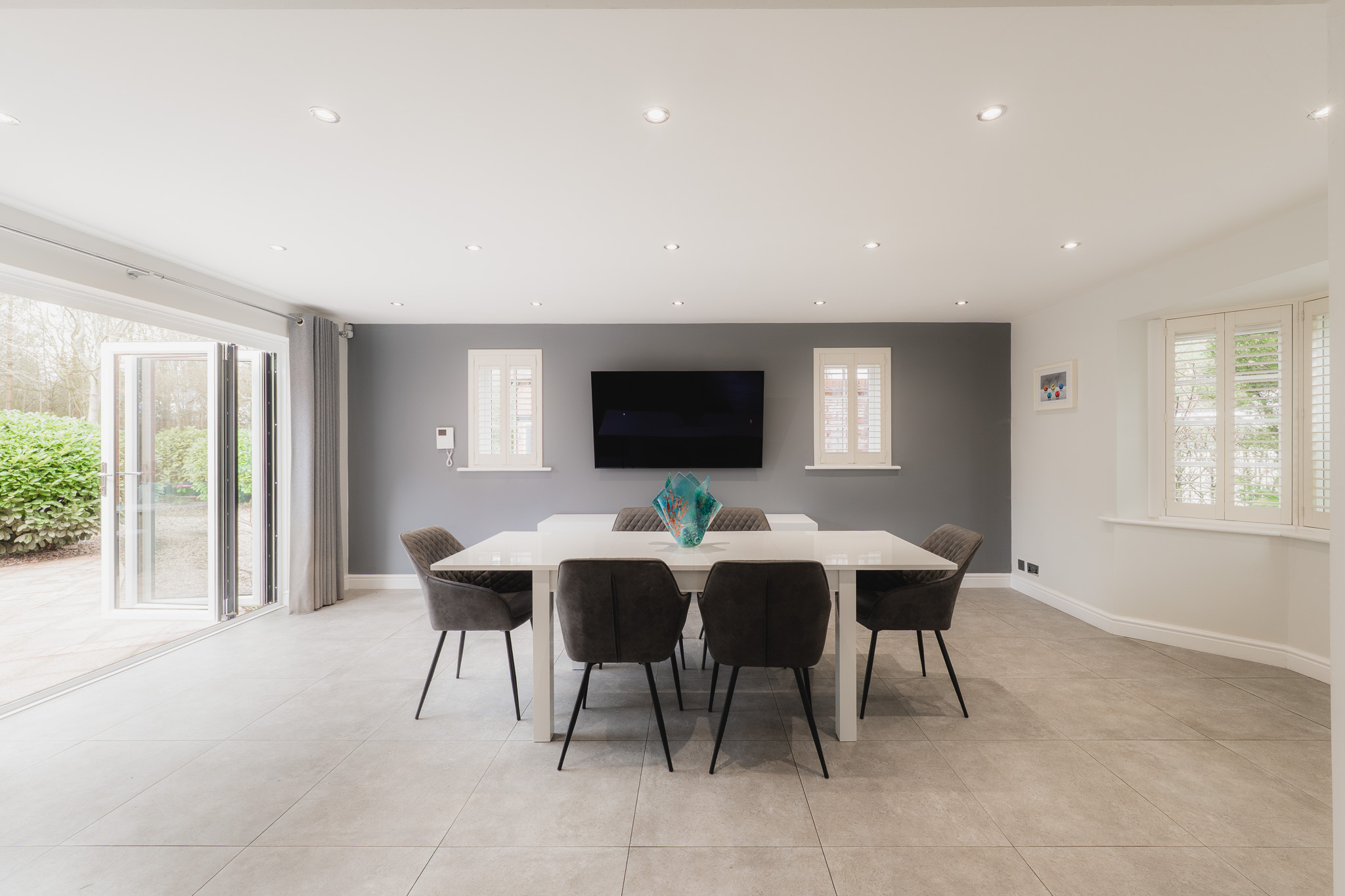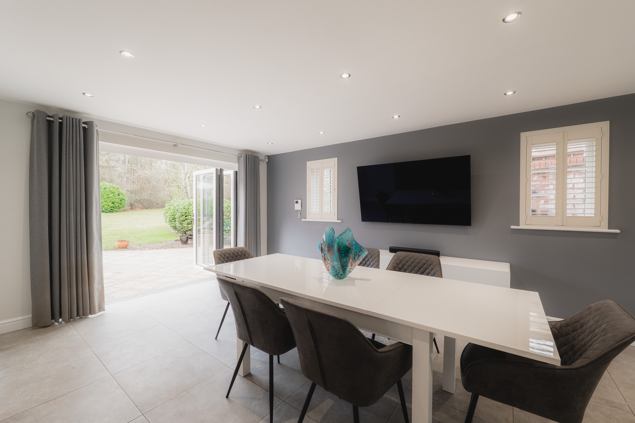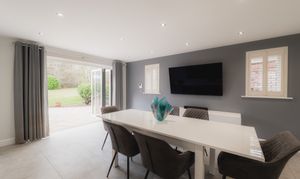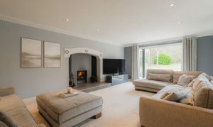 Throughout the home, minimal, soft décor creates a fresh and open feel, allowing the setting to take centre stage, nowhere more so than in the main lounge, positioned directly ahead from the entrance hall. Peace pervades in shades of soft grey, whilst a modern log burner snuggles back within the feature fireplace, emanating warmth on crisp winter nights. In the height of summer, doors open wide onto the patio and up into the garden beyond. Views stretch not only across the lawn but also toward the driveway, garaging and annexe to the right. In winter, with the glow of the fire against the garden backdrop, watch for visiting wildlife passing at the edge of the lawn; the occasional fox at dusk or birds gathering along the boundary.