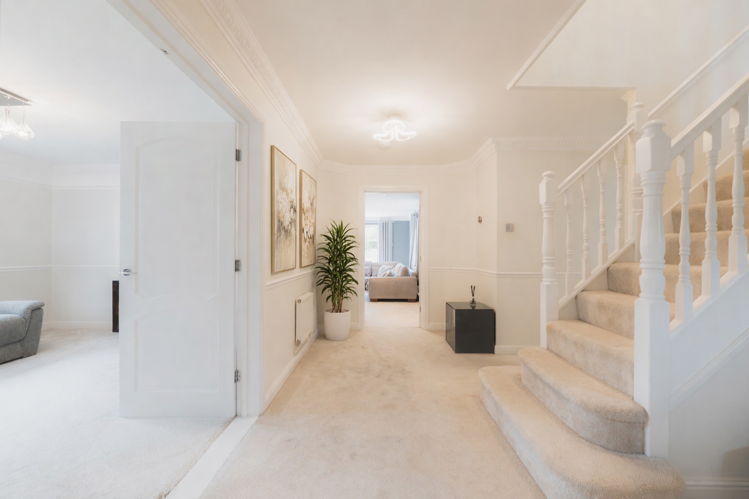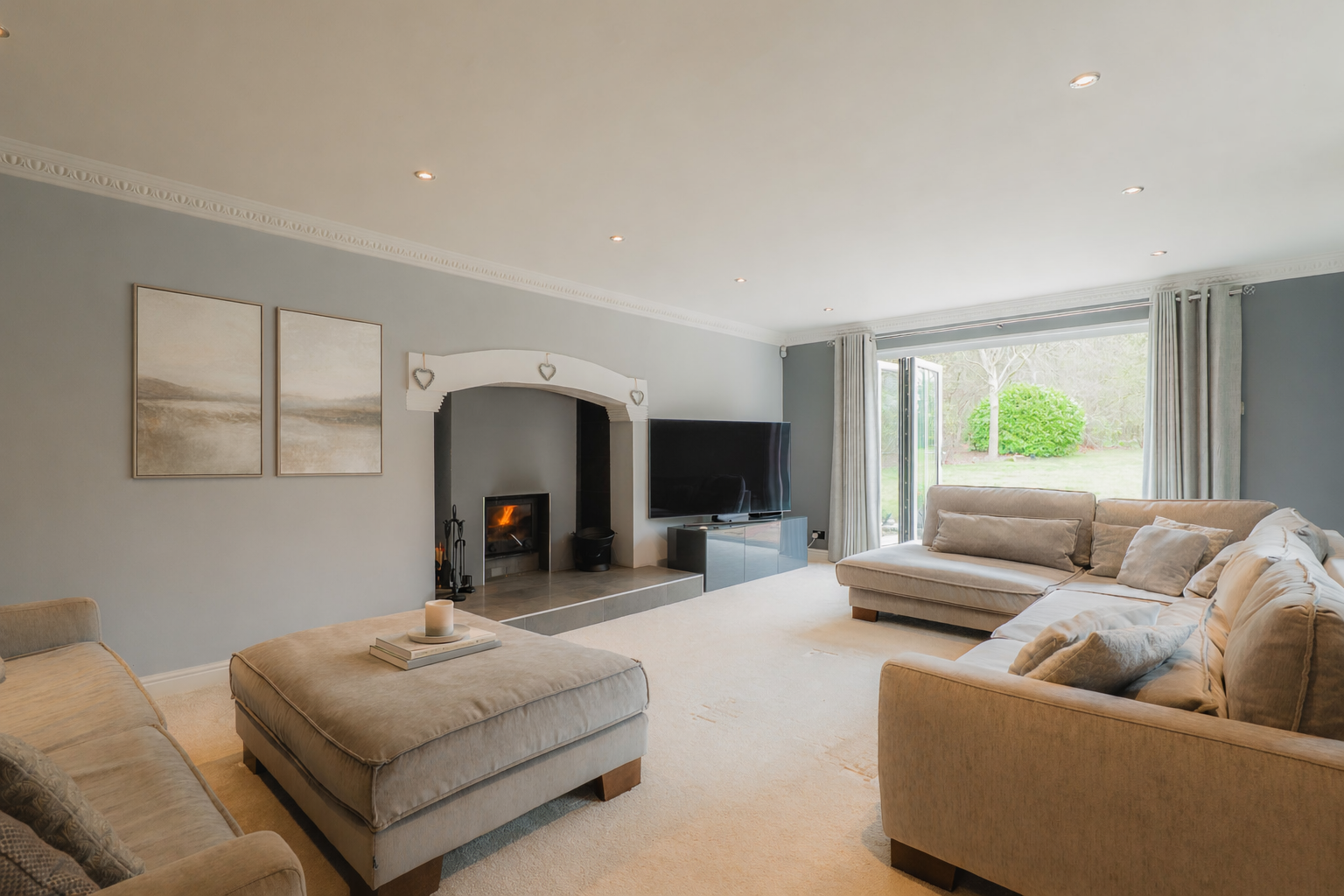 Also to the left, double doors open into a spacious snug. Previously arranged as a dining room, it offers easy flexibility, adapting to the needs of family life, whether as a playroom, games room or an additional sitting room.