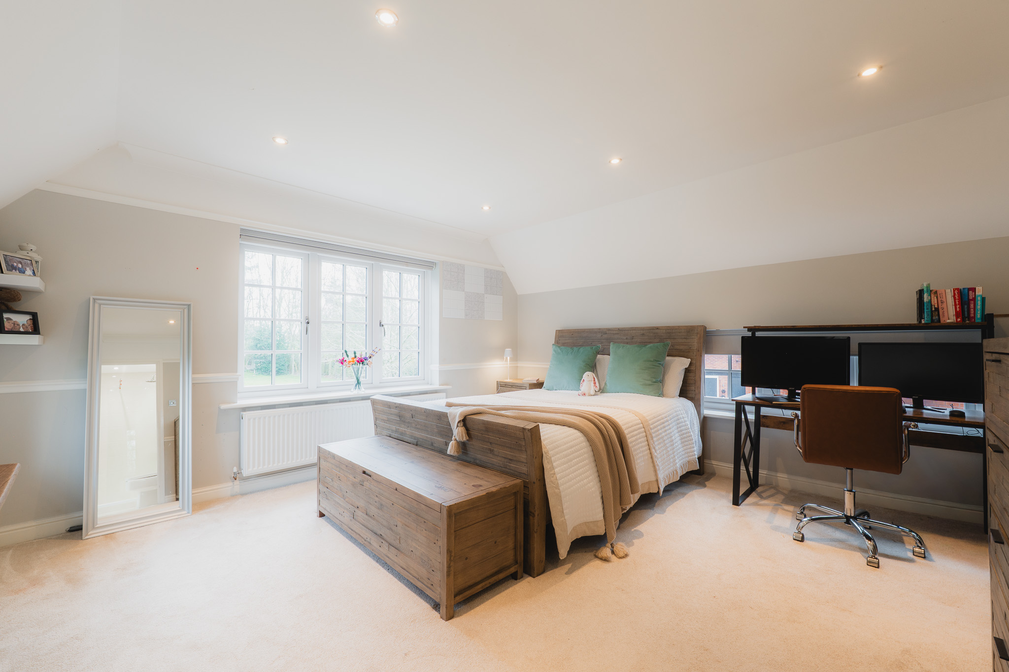 With views out over the lake, the neighbouring bedroom is another spacious retreat, replete with fitted wardrobes and its own shower room en suite.