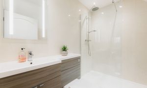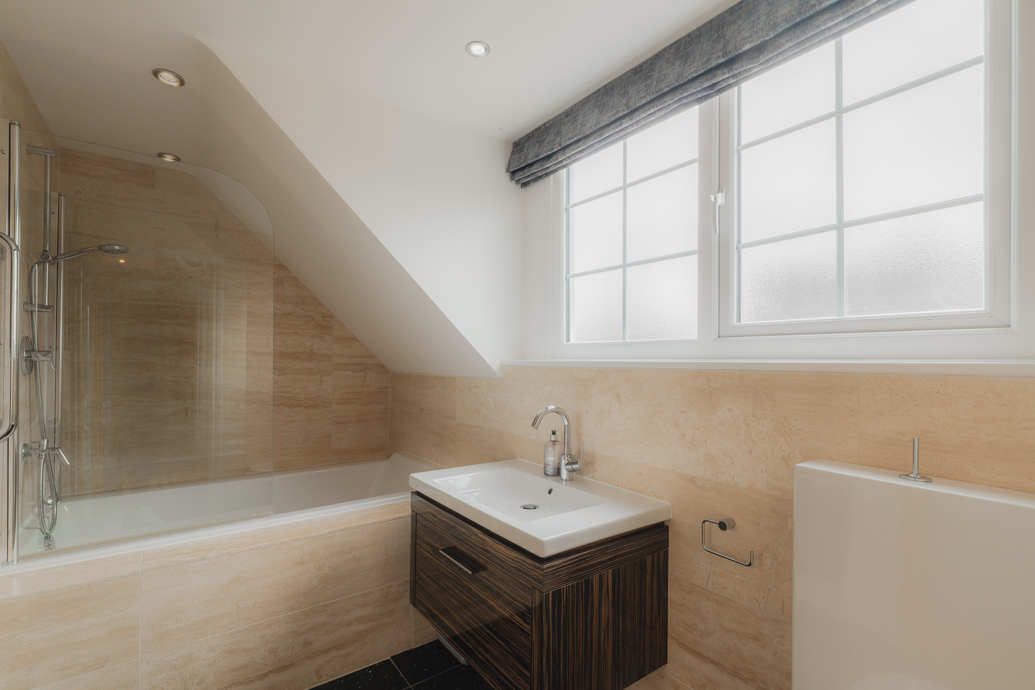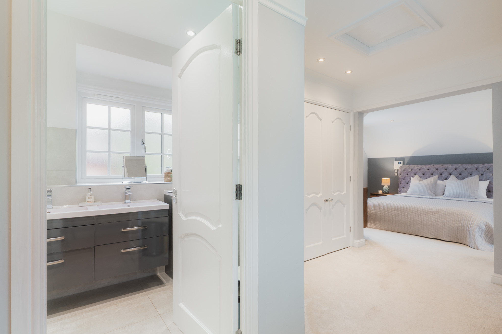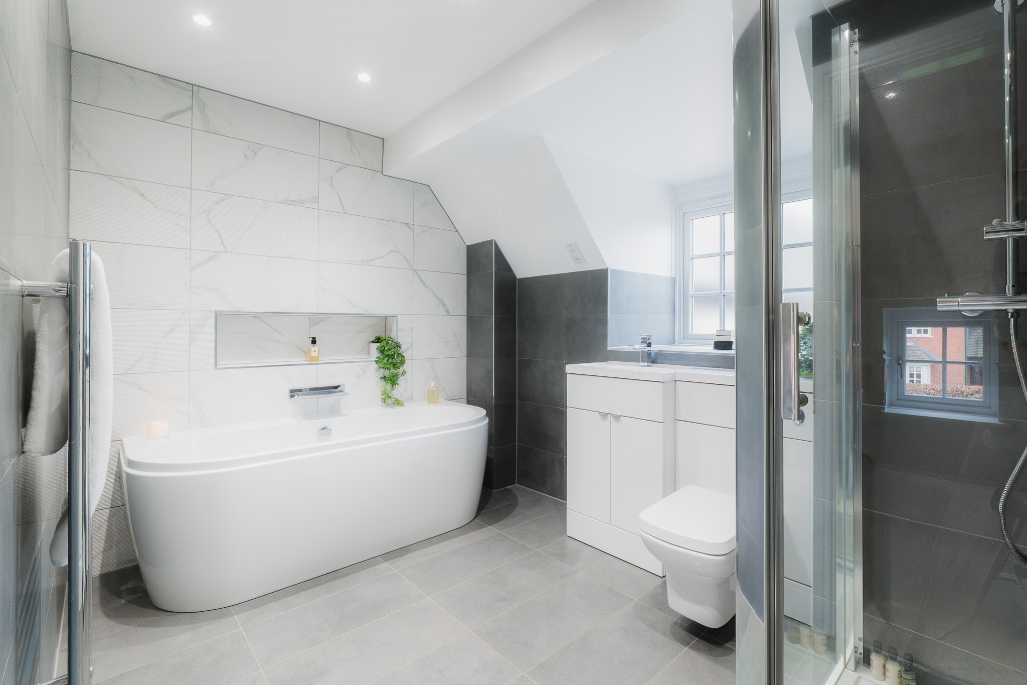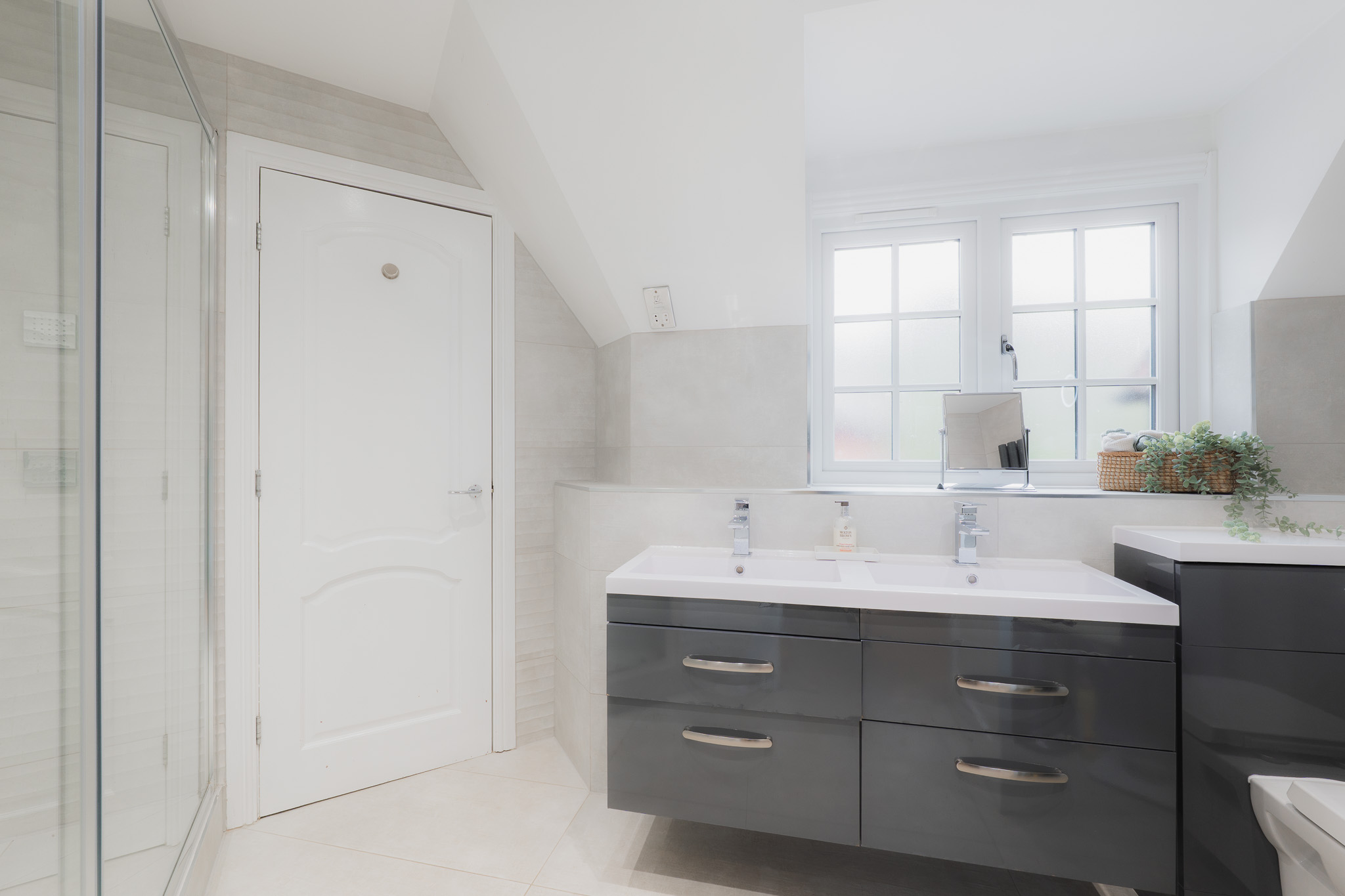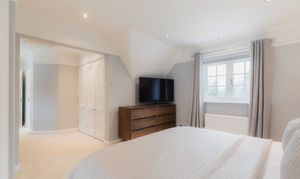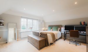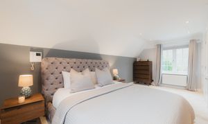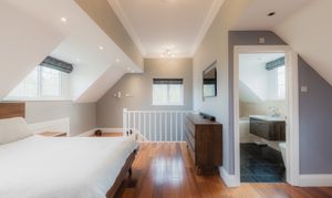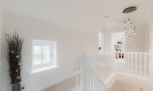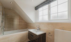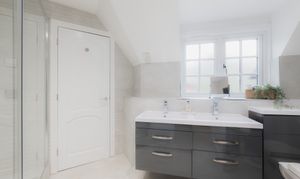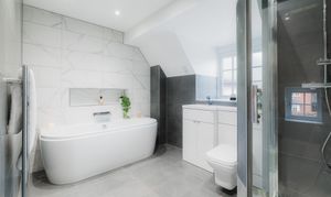 Soothe your senses in the spacious family bathroom, to the left of the landing, where a medley of tiles in a palette of white and tonal greys continue the feeling of contemporary luxury. A double ended bath invites leisurely soaks, with a separate shower for morning spritzes.