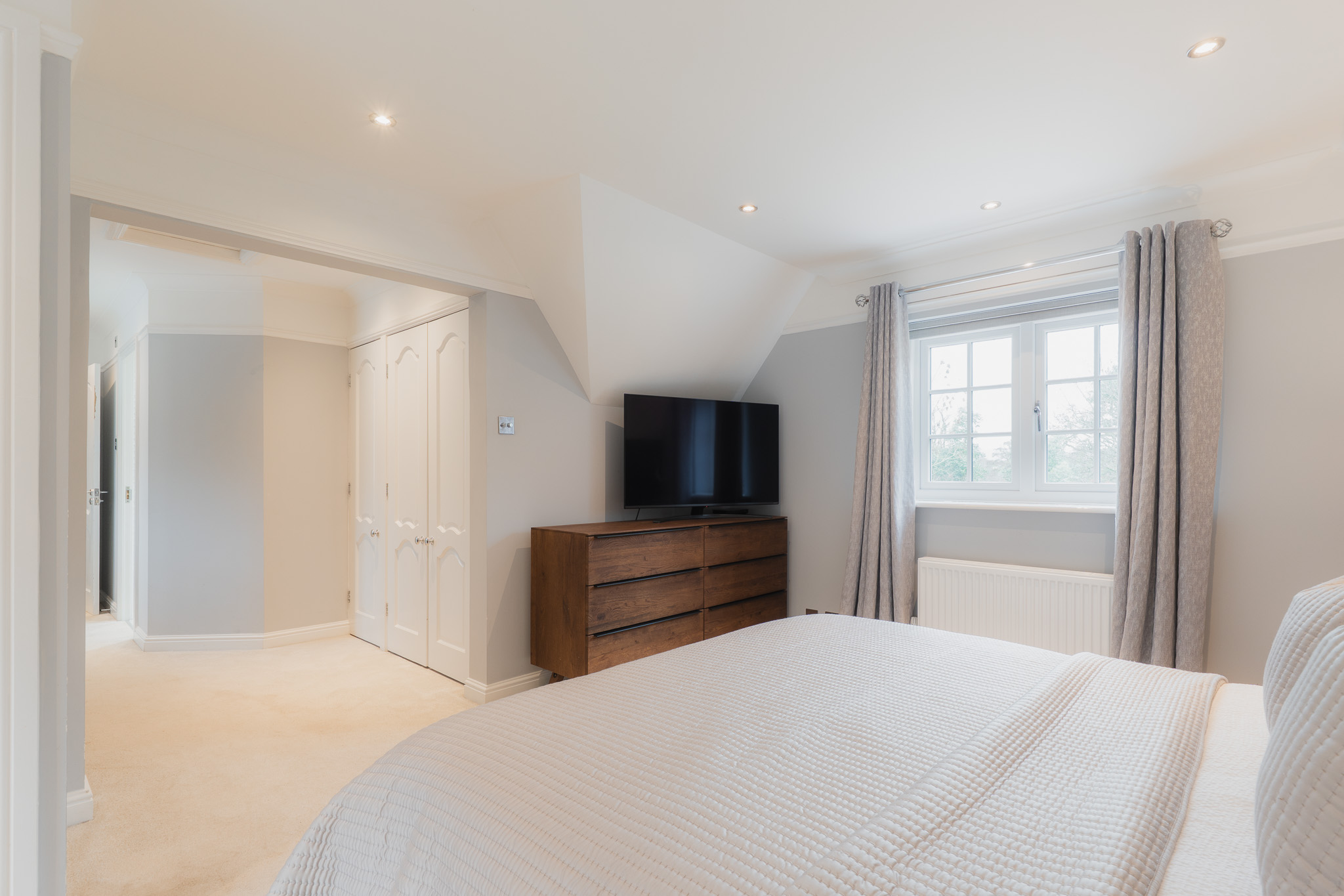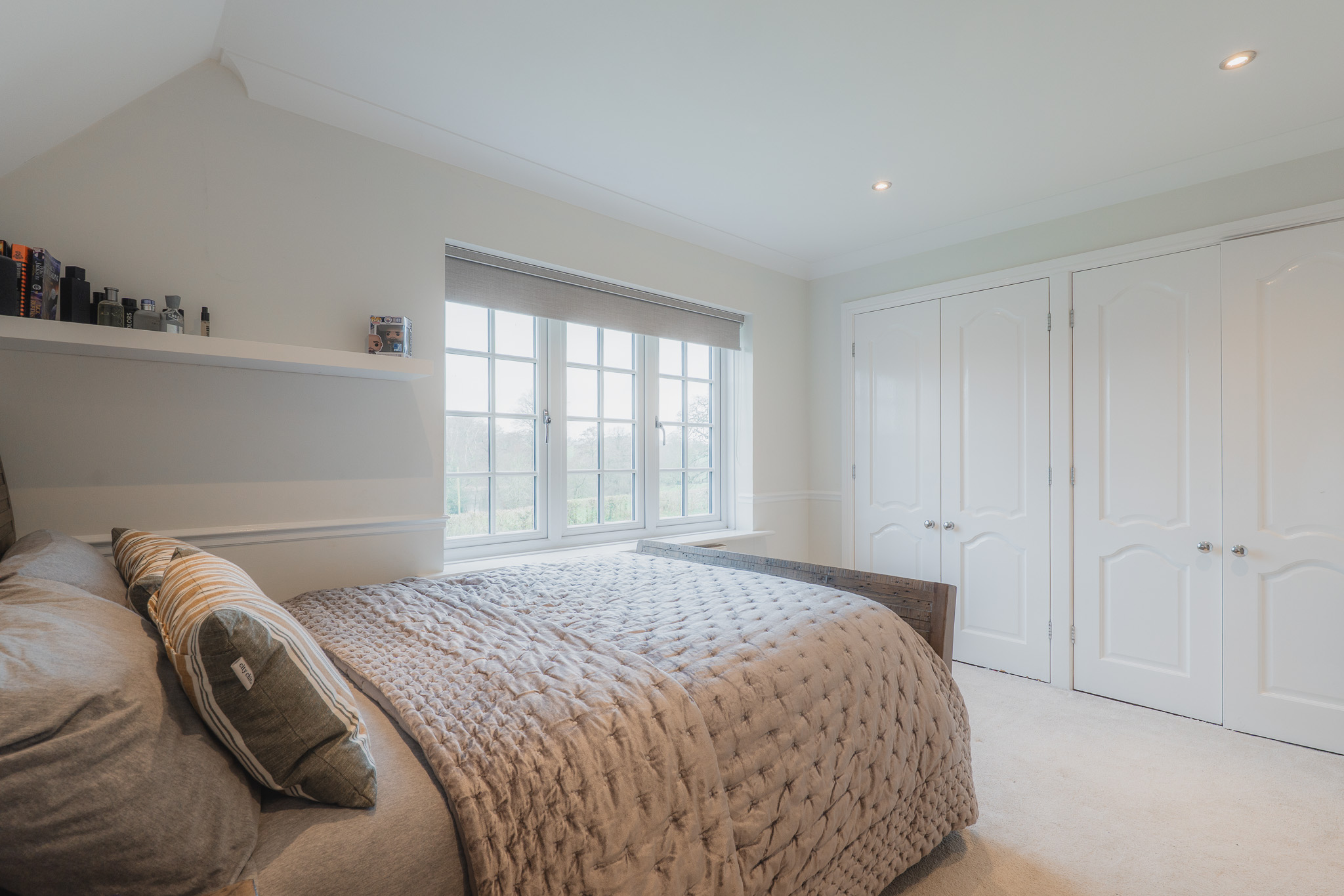 Peacefully set back along a long inner hallway-dressing area lined in fitted wardrobes, and preceded by a spacious en suite, the master bedroom is a hidden haven, ideal for winding down and sinking into sleep. Spacious, light, and furnished with even more fitted wardrobes,electric blinds control light flow as you wake up to tranquil views out over the fishing lake.