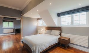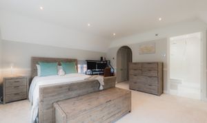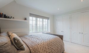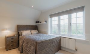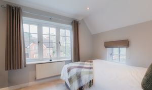 Offering an alternative option to the master suite, the guest bedroom mirrors the privacy and seclusion of the principal, sequestered along an inner landing lined with fitted wardrobes offering glorious views over the garden, with space to freshen up in the shower room en suite.
