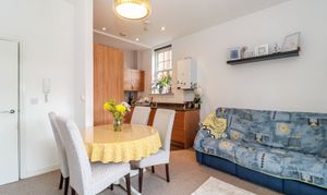 The accommodation is bright and airy throughout, with an open-plan kitchen/living room offering French doors that lead directly out to the communal gardens. High ceilings are present throughout, and the master bedroom boasts fitted wardrobes and an en-suite shower room. Additionally, there is a second bedroom and family bathroom.