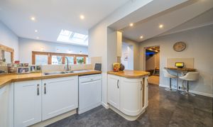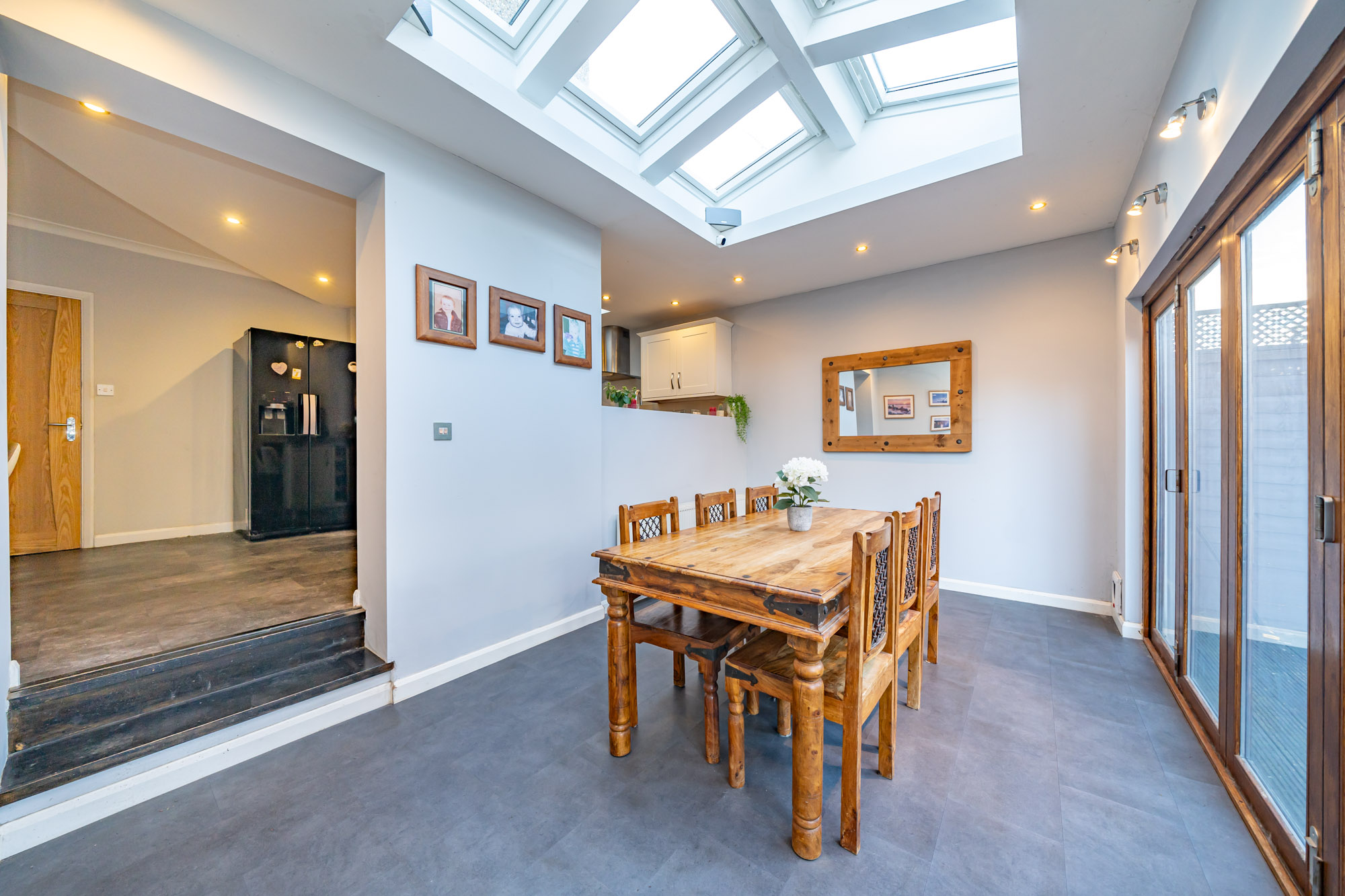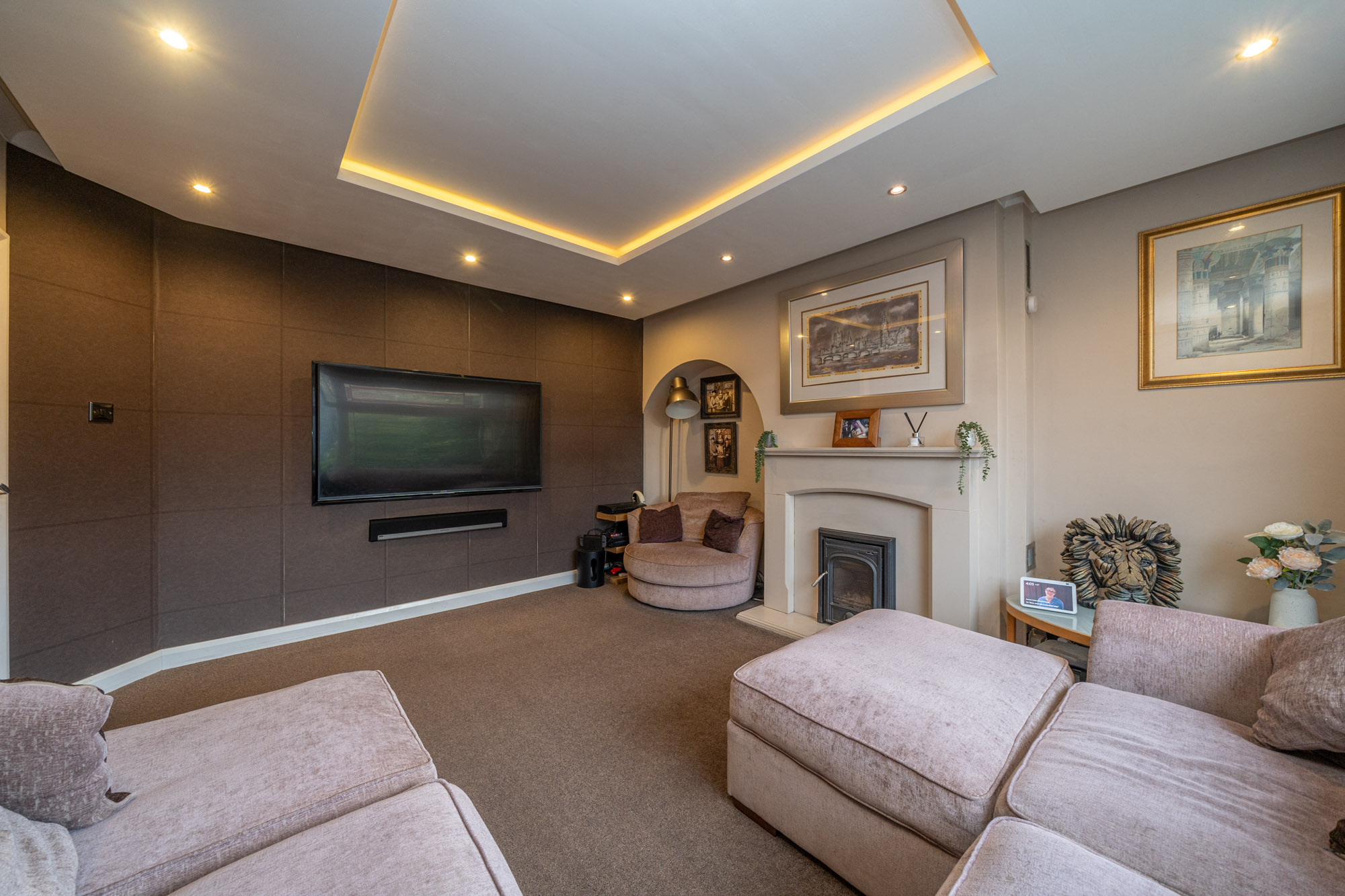 Inside, the welcoming entrance hall leads to a cosy snug or home office, while the front reception room features a beautiful fireplace, creating a warm and inviting space. To the rear, a generous 24ft reception room has been thoughtfully designed as a home cinema and family area—perfect for film lovers. The stylish kitchen flows into a bright and airy dining space, complete with skylights and bi-fold doors that open directly onto a decked area and garden. A separate utility room provides additional convenience.