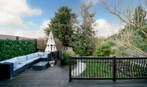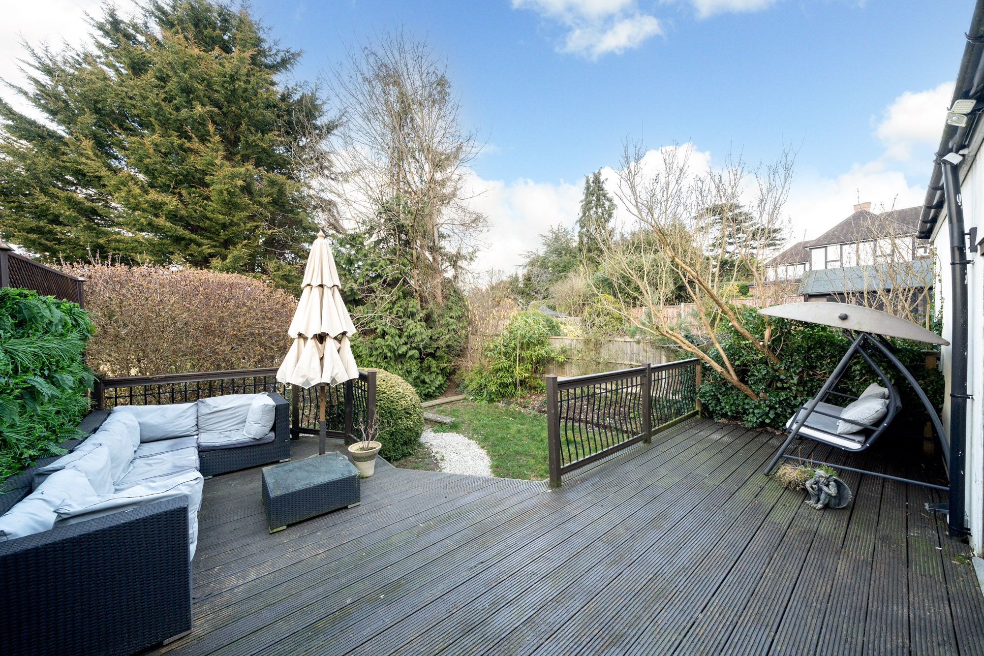The private rear garden is an ideal setting for both relaxation and entertaining. A large decked area provides plenty of space for outdoor dining, while the fully equipped garden bar offers the perfect spot for hosting summer gatherings.