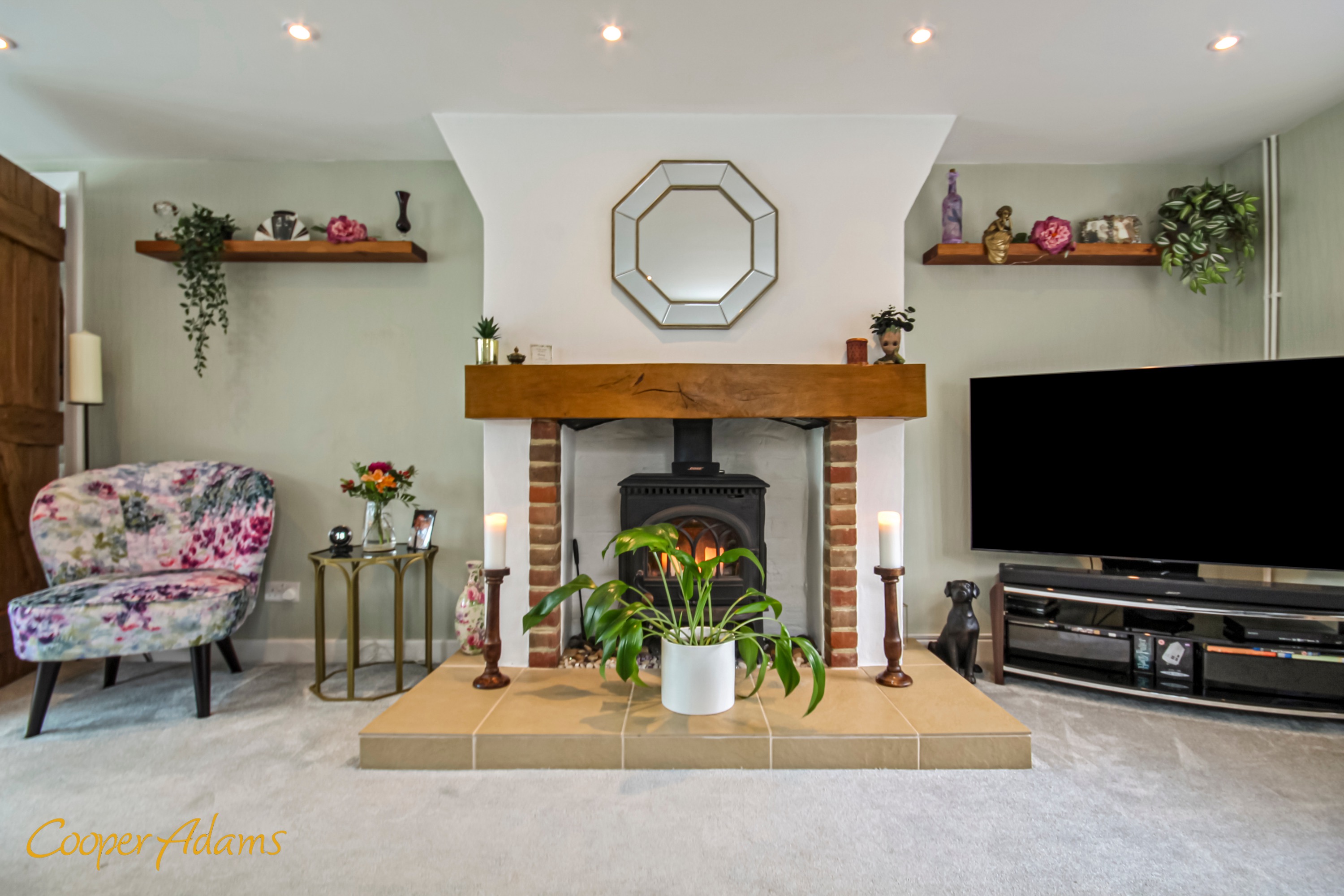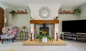 You enter through a conservatory set up as a place to sit and look out over the garden, which leads into the main living room with a log burner at its centre. There are electric blinds between the two spaces for when you want to close it off.