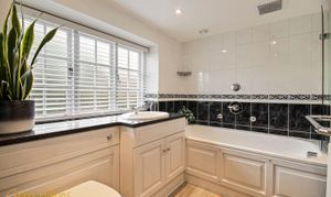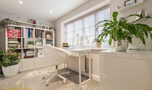 Upstairs, the main bedroom has windows on two sides and fitted wardrobes. The second bedroom is also a good size with storage, and the third is currently used as a study with views over the garden. The bathroom includes underfloor heating and a shower over the bath.