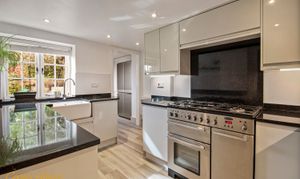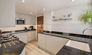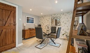 The kitchen is fitted with granite worktops and includes a larder and utility area, along with a cloakroom. Stable doors open straight onto the garden. There is also a separate dining room with a bay window.