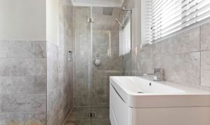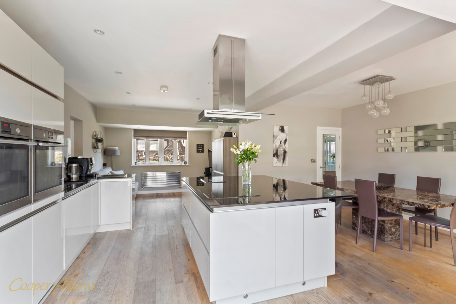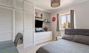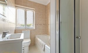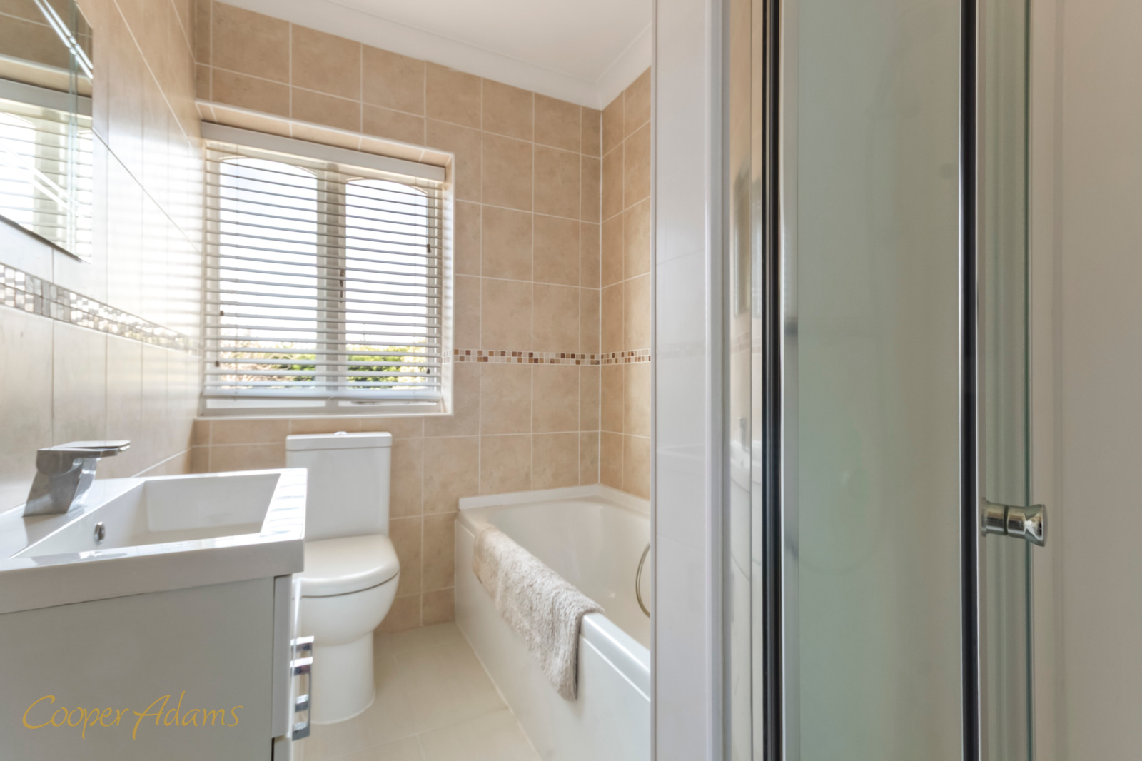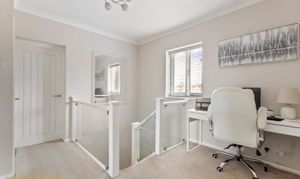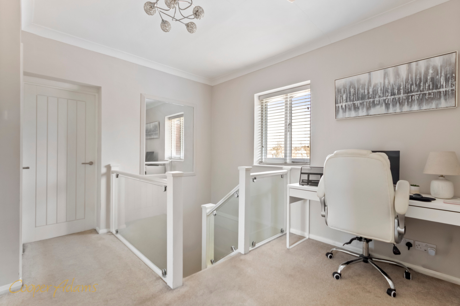Upstairs, the landing has room for a study area. The main bedroom includes fitted wardrobes and an updated shower room. Two further double bedrooms also have built in storage, and there is a fourth room currently used as an office. The bathroom includes both a bath and a separate shower.