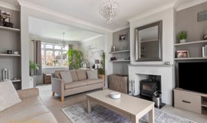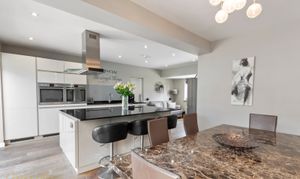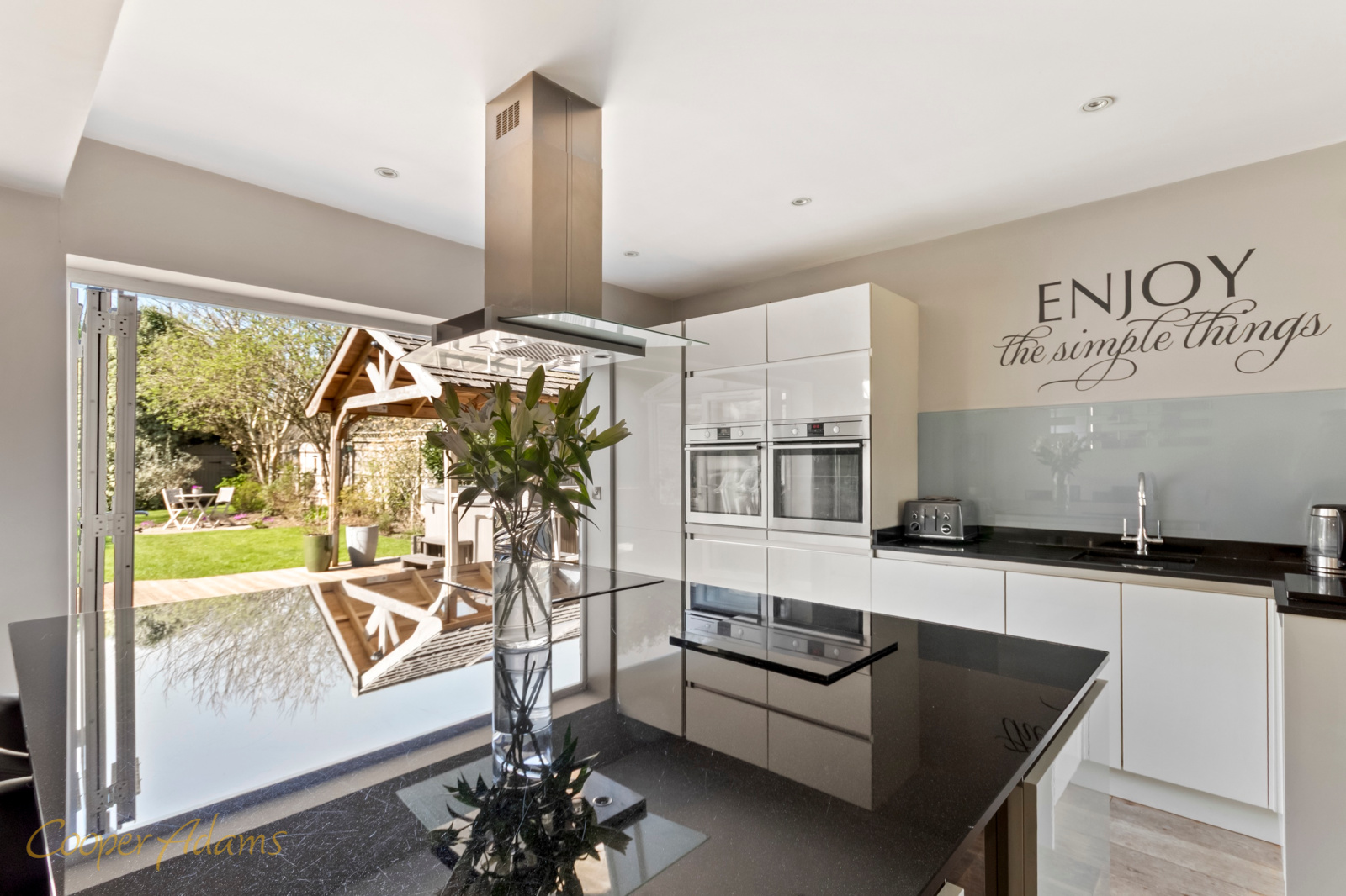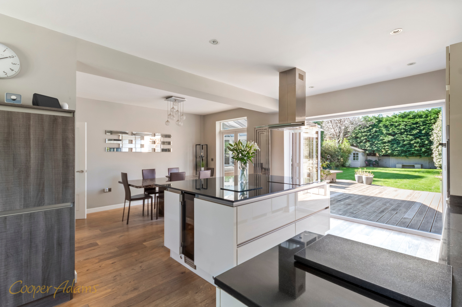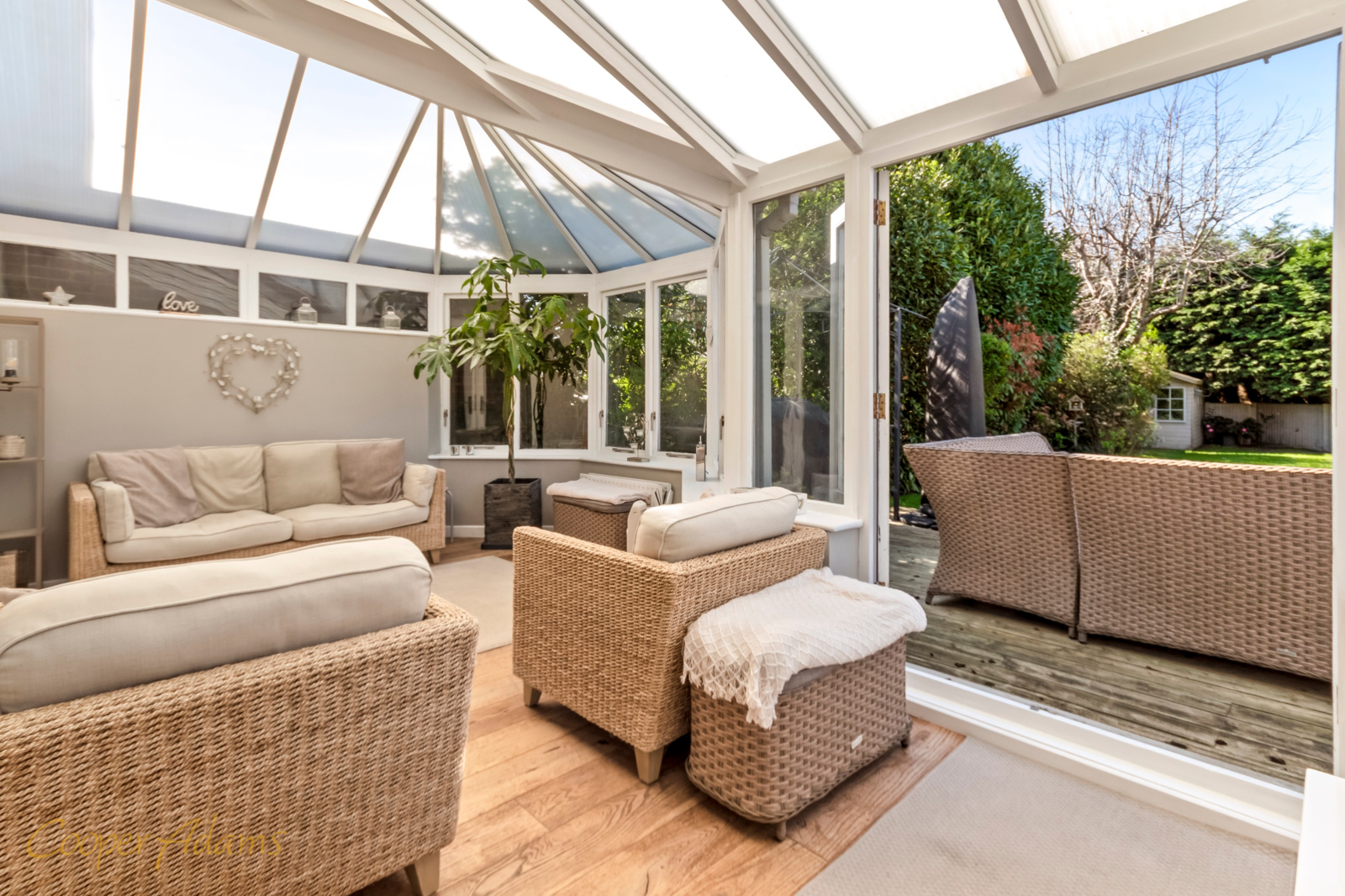 The ground floor opens into a wide entrance hall with a cloakroom. The sitting room is centred around a log burner and connects through to a conservatory. To the rear, the kitchen, dining and living space runs across the house, with integrated appliances, a breakfast bar and bifold doors opening onto the garden. The conservatory adds another area to use, with access out to a decked seating space.