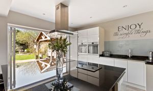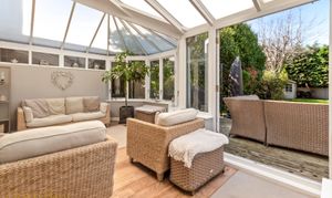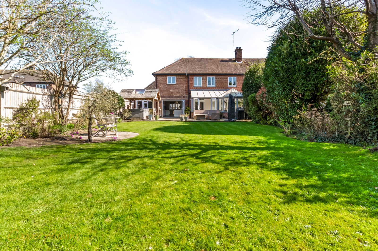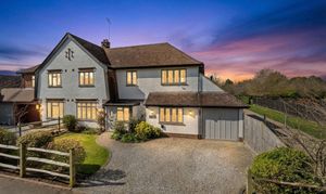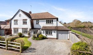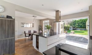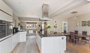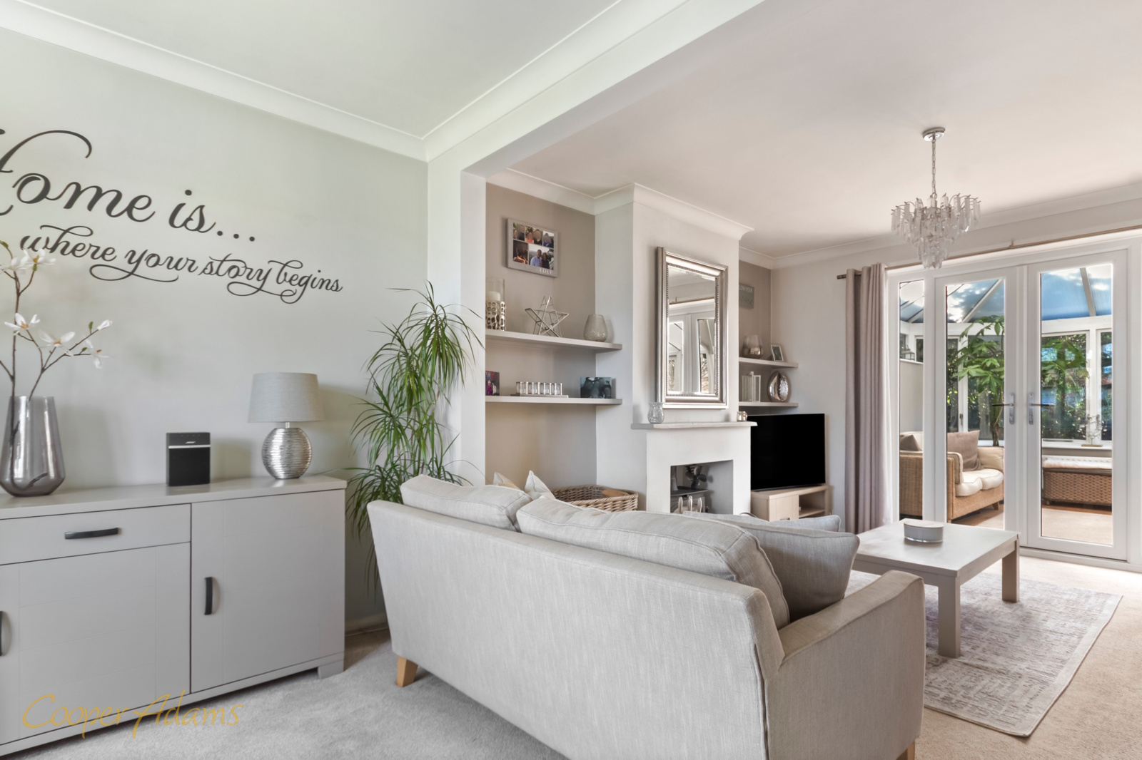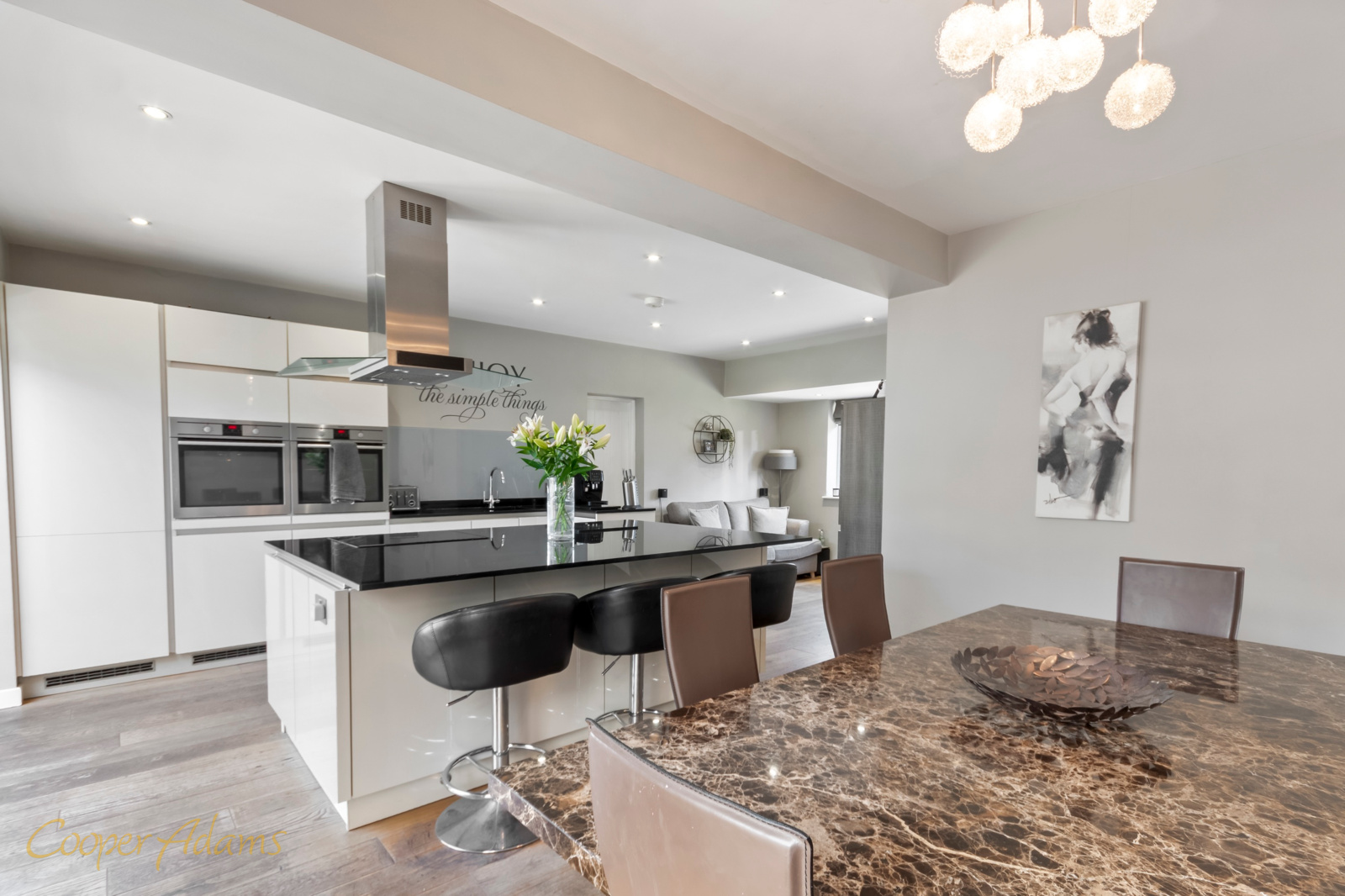 The ground floor opens into a wide entrance hall with a cloakroom. The sitting room is centred around a log burner and connects through to a conservatory. To the rear, the kitchen, dining and living space runs across the house, with integrated appliances, a breakfast bar and bifold doors opening onto the garden. The conservatory adds another area to use, with access out to a decked seating space.