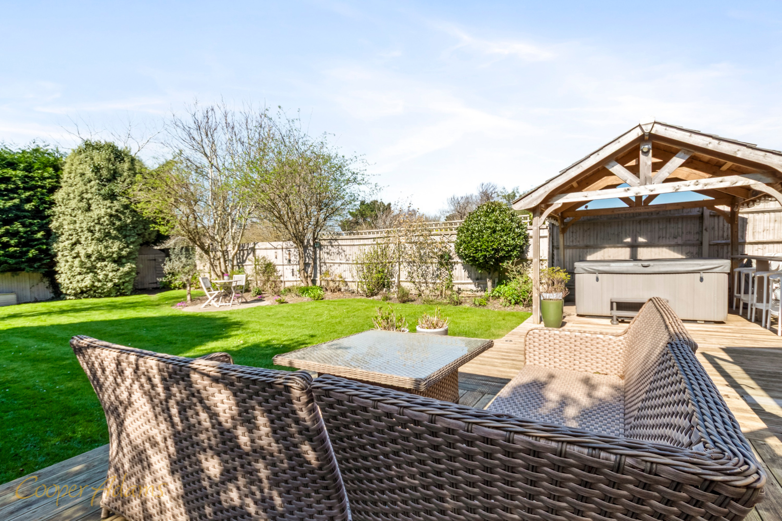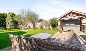 Outside, there is an integral garage with access from the kitchen and a driveway for up to three cars. The rear garden faces west, with a decked area, a covered hot tub section and a lawn bordered by established planting.