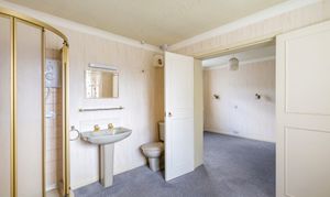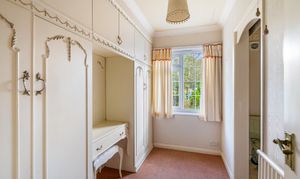 The ground floor offers two double bedrooms, including a master with its own ensuite shower room. There is also a generous dressing room with integrated wardrobes, a WC, and a separate shower. The family bathroom is fitted with a two-piece suite (sink and bath), and there’s plenty of built-in storage throughout the ground floor.