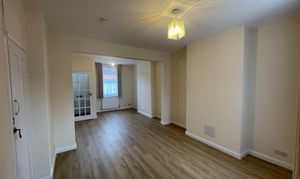 The property features a bright and spacious front reception room with stylish wood-effect laminate flooring, leading through to a contemporary fitted kitchen at the rear. The kitchen is finished with sleek white gloss units, modern white brick-style tiling, and a brand-new Lamona oven with gas hob, creating a clean and functional space. Upstairs, new carpets run throughout the first floor, which comprises a generous double master bedroom, a well-proportioned second bedroom, and a large bathroom complete with a shower over bath and modern white gloss vanity units. Neutral décor throughout enhances the light and airy feel of the home.