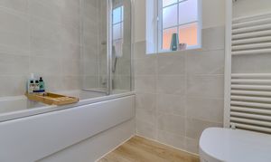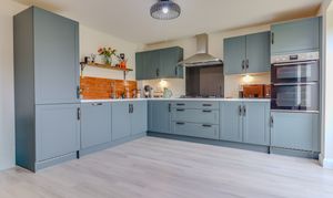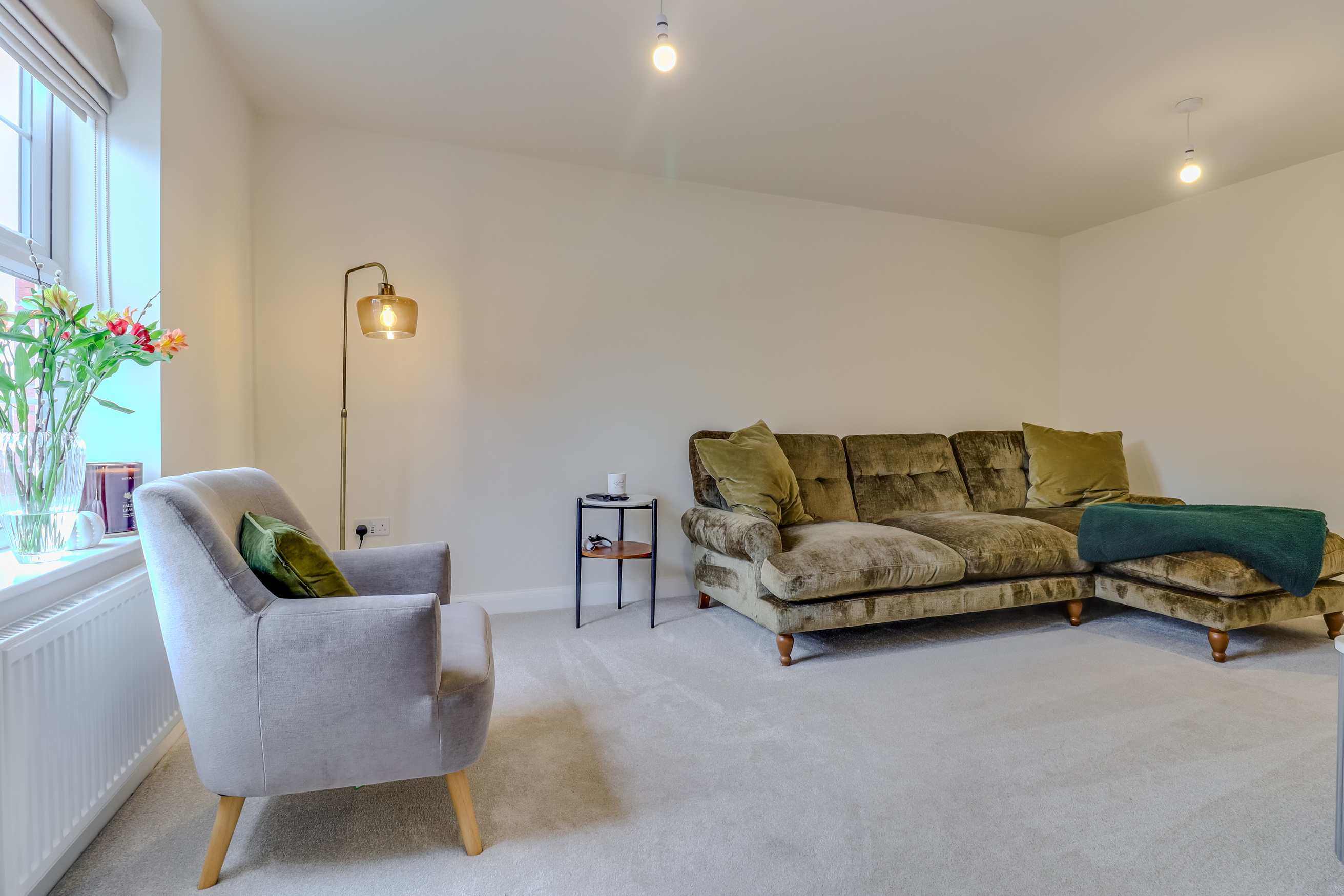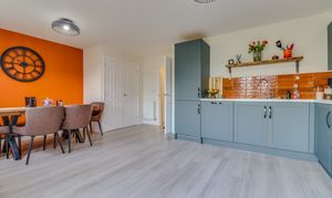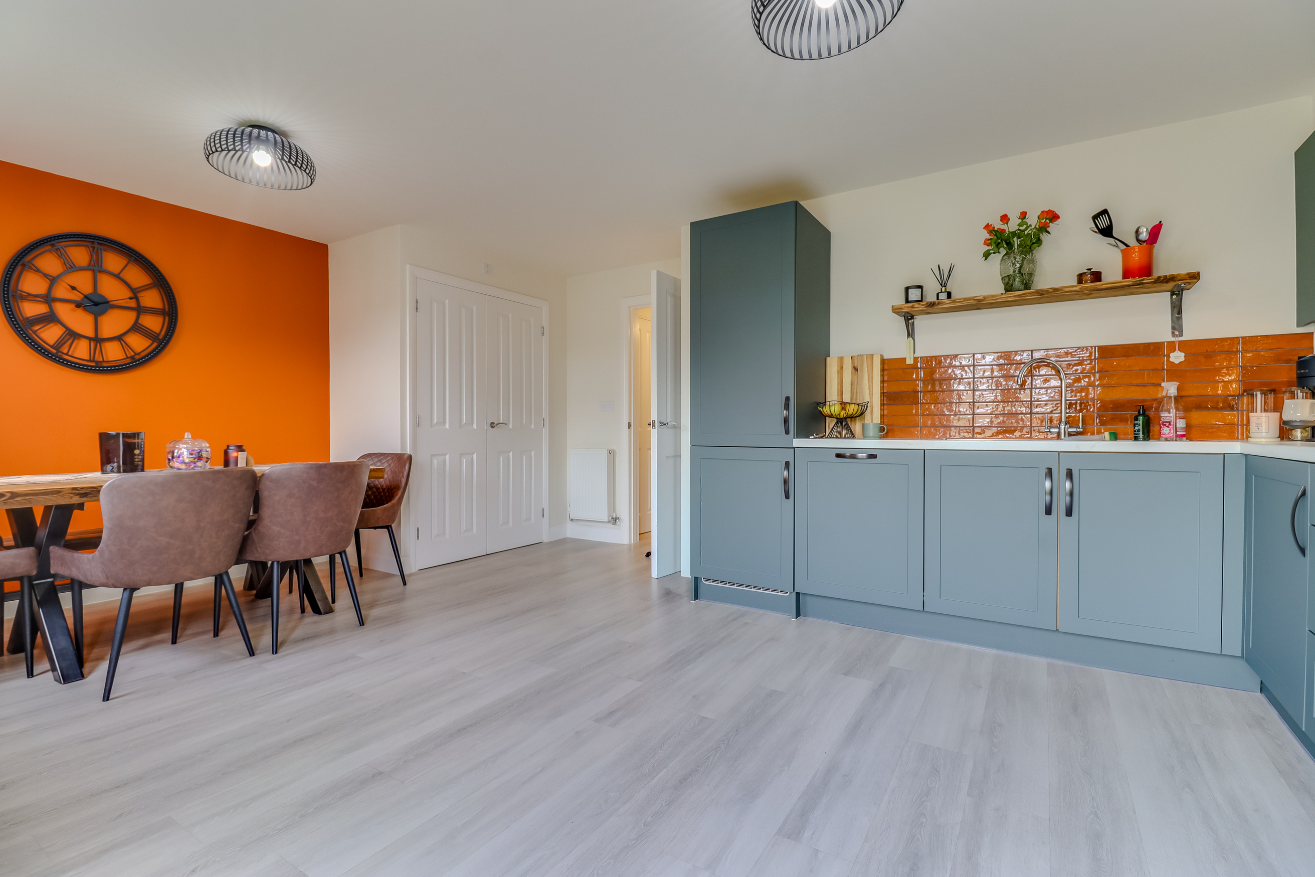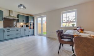 The internal accommodation comprises in brief; a welcoming entrance hall with a staircase rising to the first floor landing and a half tiled downstairs WC off. A door leads into a spacious lounge with a pleasant aspect over open space. The centerpiece of the home is undoubtedly the fantastic dining kitchen which spans the full width of the property and is superbly fitted with a range of Shaker style wall and base units in forest green with contrasting worksurfaces, a selection of integrated appliances, tiled splashbacks, utility cupboard and French doors opening out to the garden.