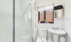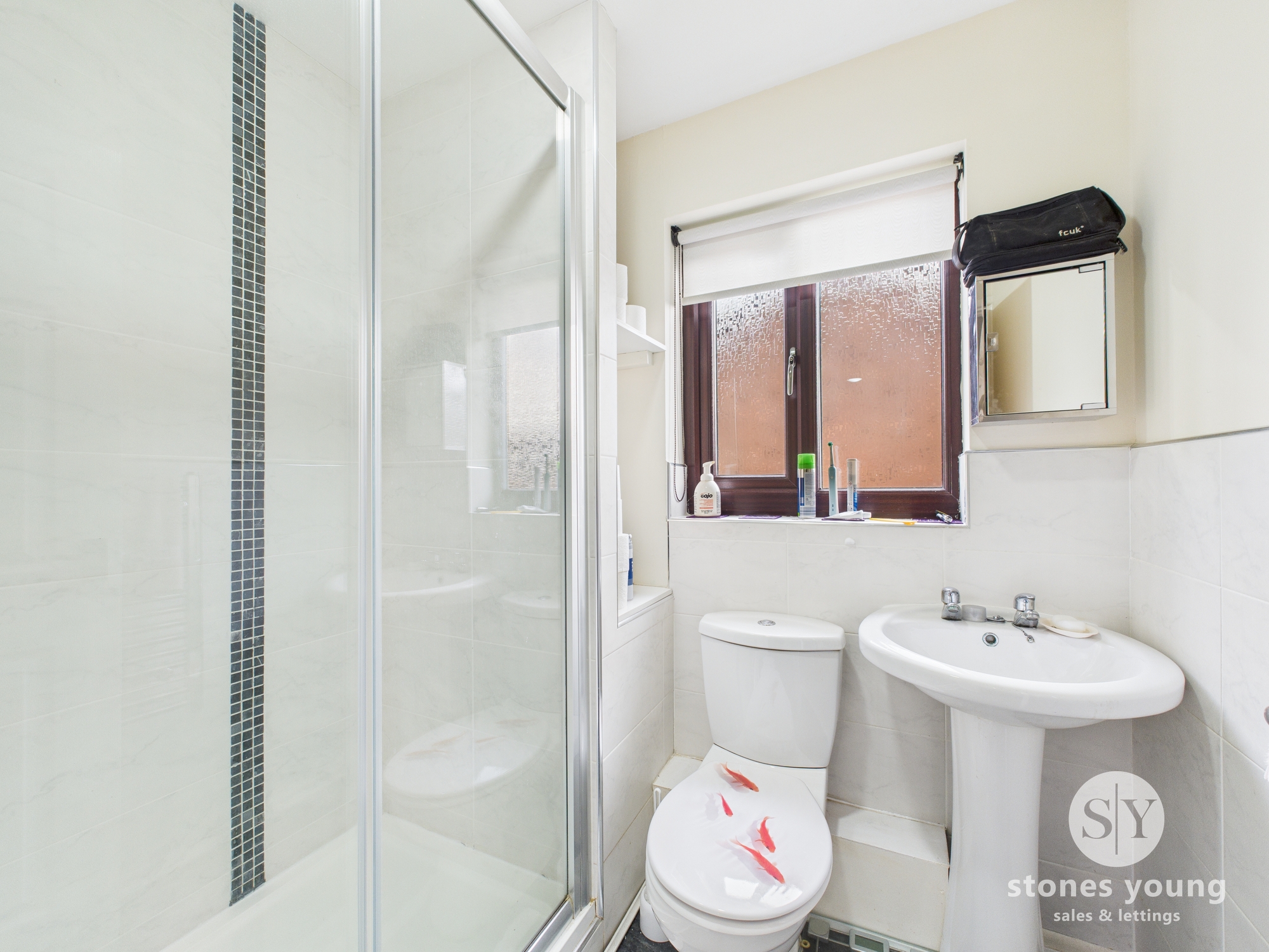 laminate flooring, three piece in white comprising of electric shower enclosure, wc and basin, tiled splash backs, frosted double glazed uPVC window, electric towel radiator.