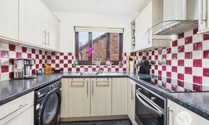 laminate flooring, fitted wall and base units with contrasting work surfaces, tiled splash backs, stainless steel sink and drainer, space for washing machine and fridge freezer, electric hob and oven, extractor fan, double glazed uPVC window.