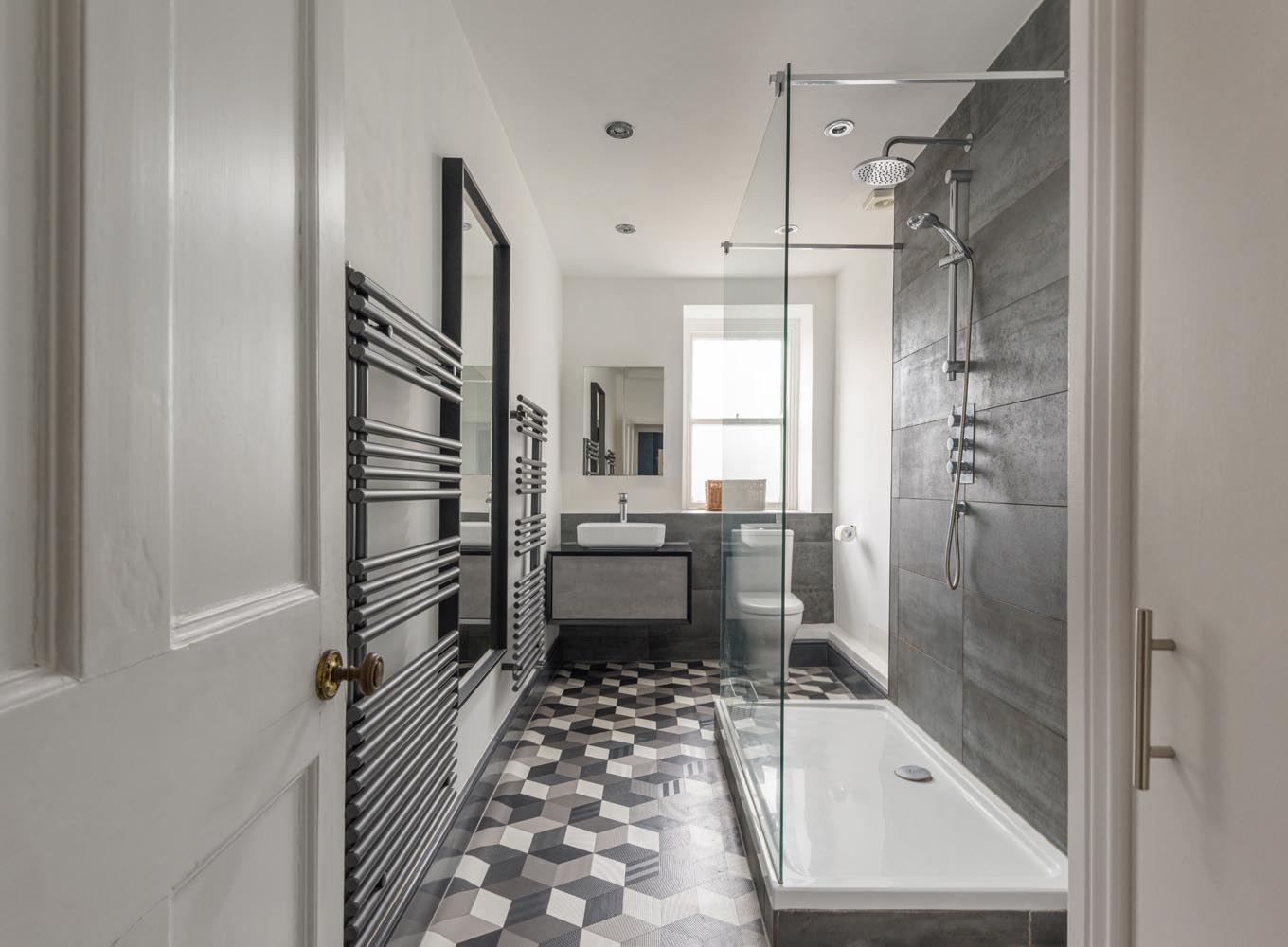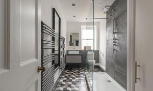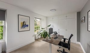 The staircase rises to a bright landing off which there are five bedrooms. The principal suite enjoys a quiet position with abundant natural light and long, leafy views through two broad sash windows. The bedroom is generously scaled, its gentle coved ceiling and calm palette giving a restful feel, with a fitted dressing room alongside, lined with full height wardrobes. The en suite bathroom is contemporary yet understated, with a freestanding bath, a large walk-in shower, heated towel rails and a modern vanity with a vessel basin. Three further bedrooms line the front and western elevations, each benefiting from the ceiling height and window scale expected of the period. A fifth bedroom offers flexibility for a nursery or additional study. The family shower room is modern in finish, with large format tiling, a walk-through shower enclosure and heated towel rails.