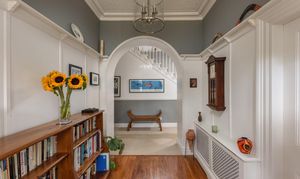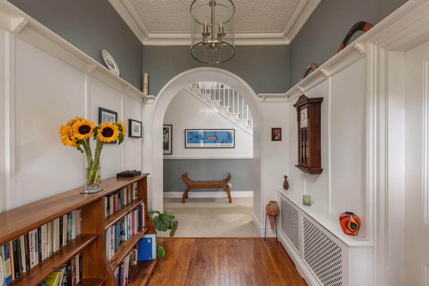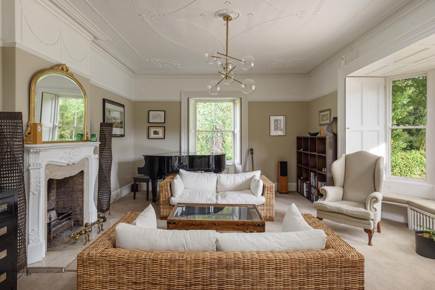 As you step through the entrance vestibule, a wide reception hall unfolds, panelled to dado height, with high cornicing and a graceful arch that draws the eye to the turned handrail beyond. To the right, the drawing room offers an easy everyday retreat, well suited to music or reading. Tall sash windows with working shutters frame a broad bay with a window seat that looks over the garden, while ornate ceiling plasterwork and a carved marble fireplace provide the natural focal point.
