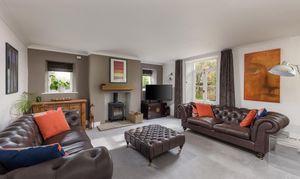 At the end of the hall, the sitting room is planned for easy family living, a generous space with a wood burning stove beneath an oak mantel, wide glazing to the garden and French doors that open directly to the terrace.