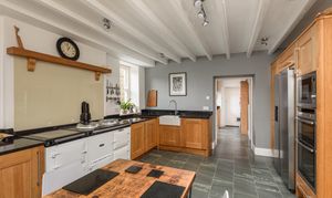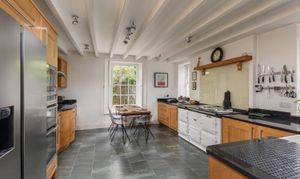 The kitchen breakfast room is arranged for efficient preparation and clear circulation with Amtico flooring and painted ceiling beams. Warm timber cabinetry is paired with granite worktops, a Belfast sink and a traditional 4 oven Aga, and dining area beside a tall sash window.