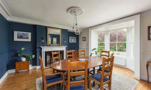 Further down the reception hall to the left, the dining room features crisp period detailing, wood flooring and a ceiling rose, its impressive bay window with views to the garden, the greenhouse and one of several seating areas.