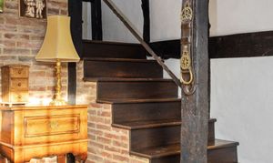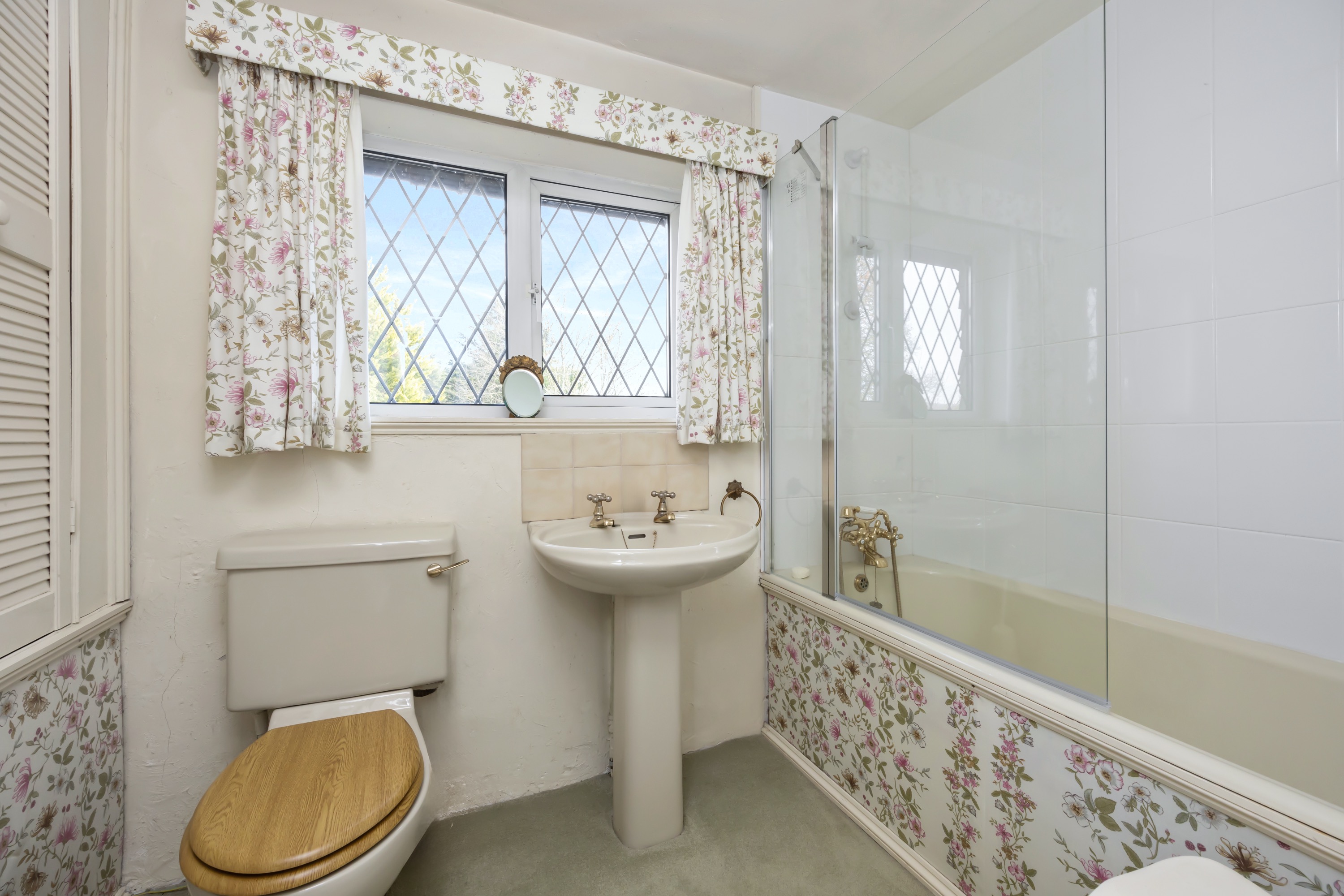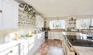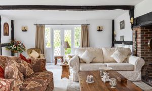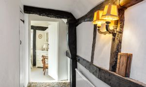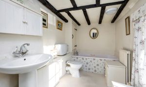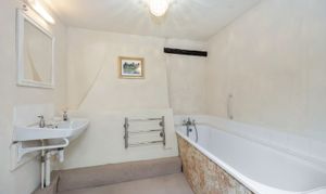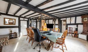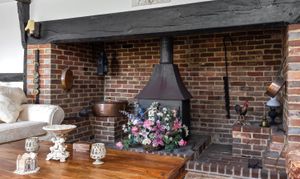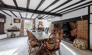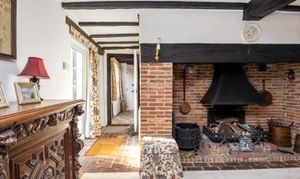 The living room is an impressive triple aspect room with double doors to the garden and a feature Inglenook fireplace with inset display shelves and a log burner. The dining room also has an Inglenook fireplace with a door to the garden and stairs to the first floor. Downstairs bathroom.