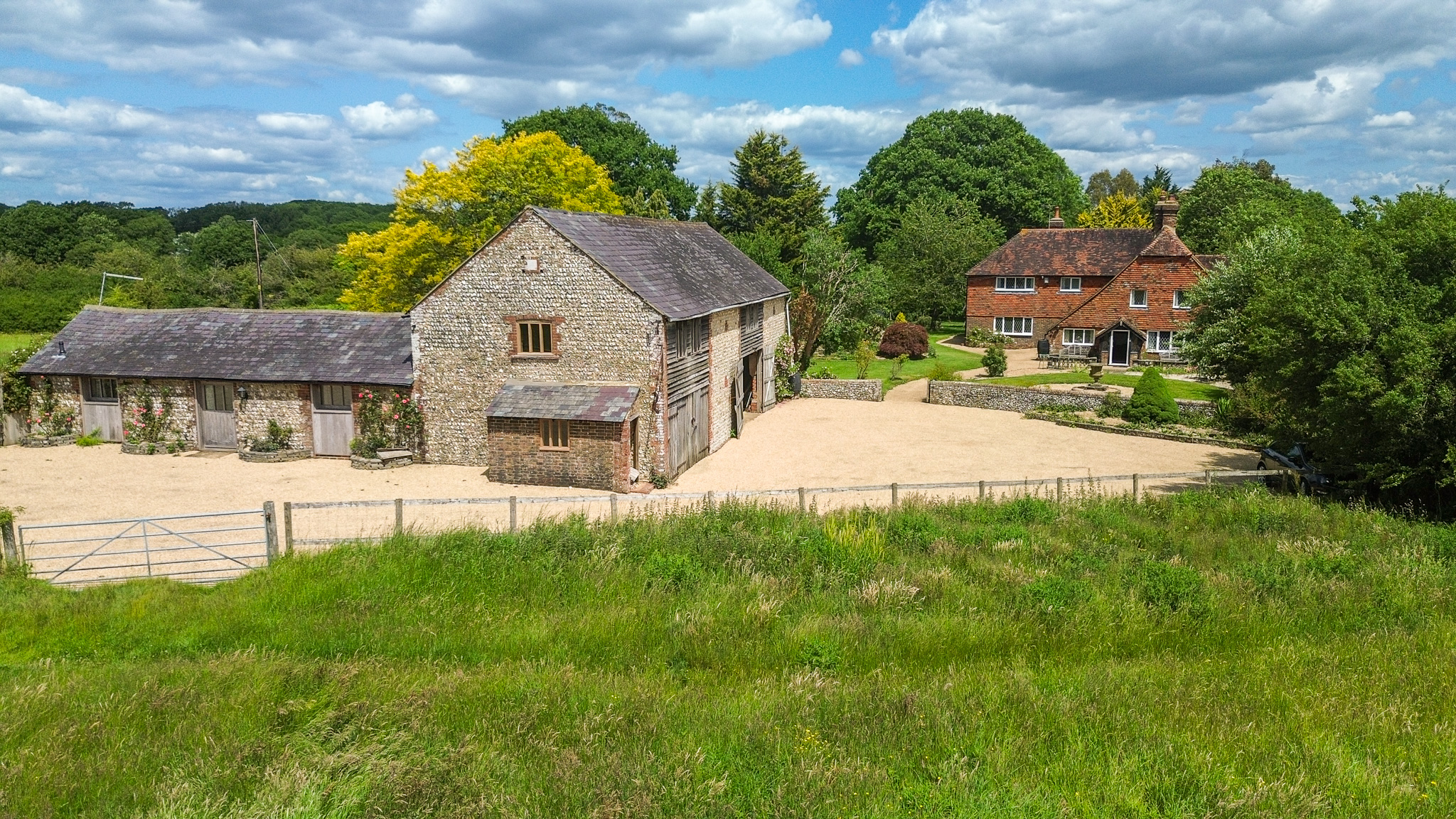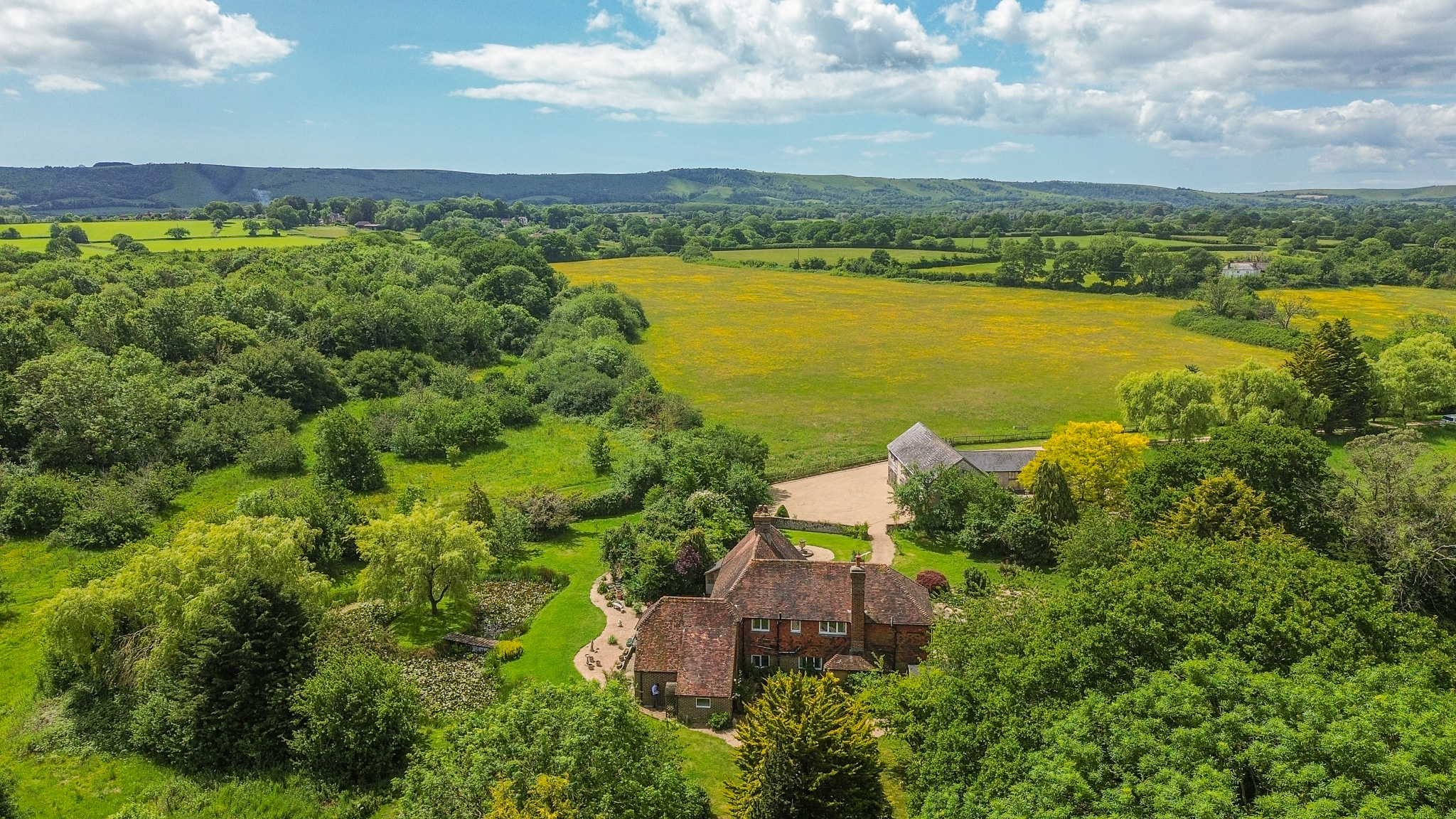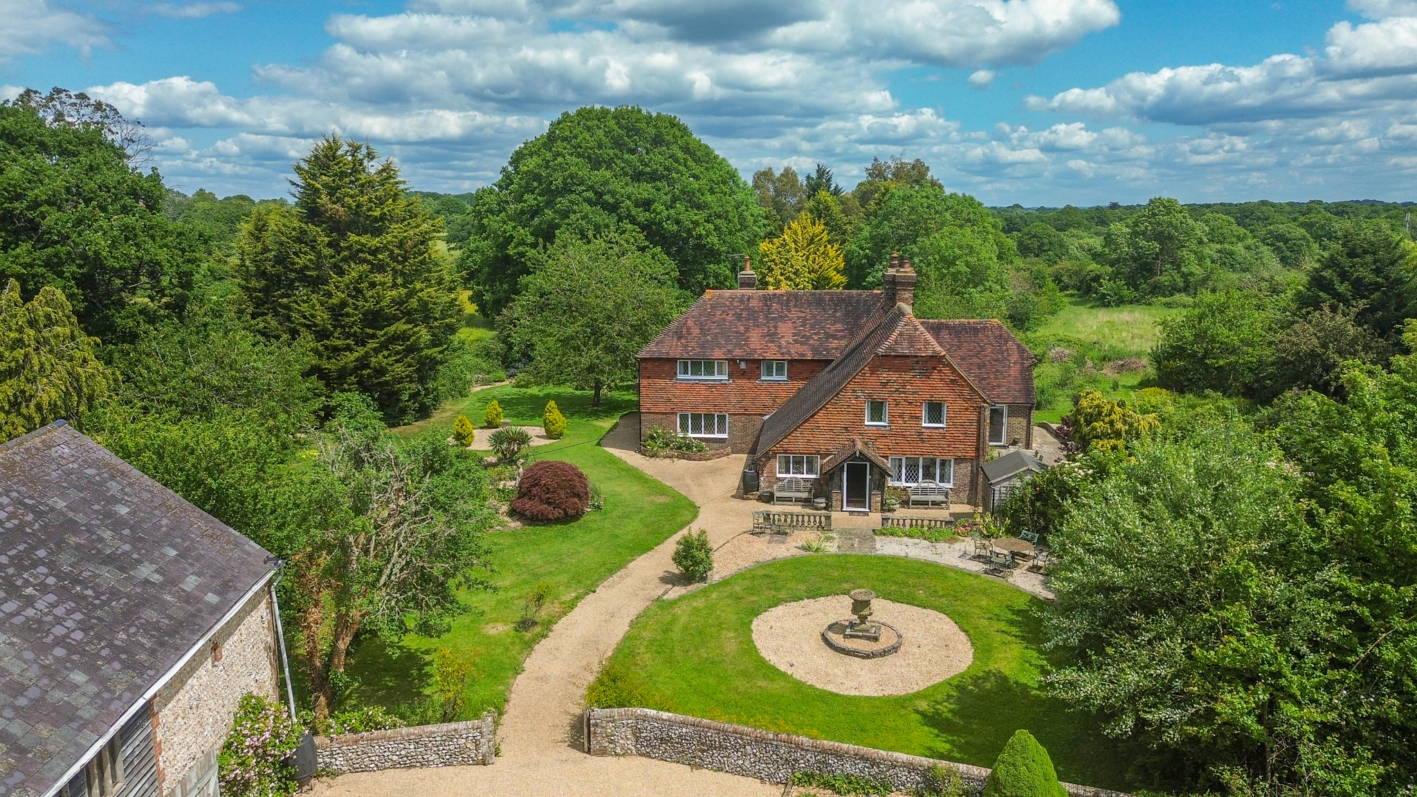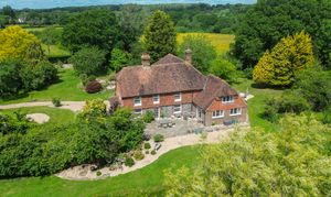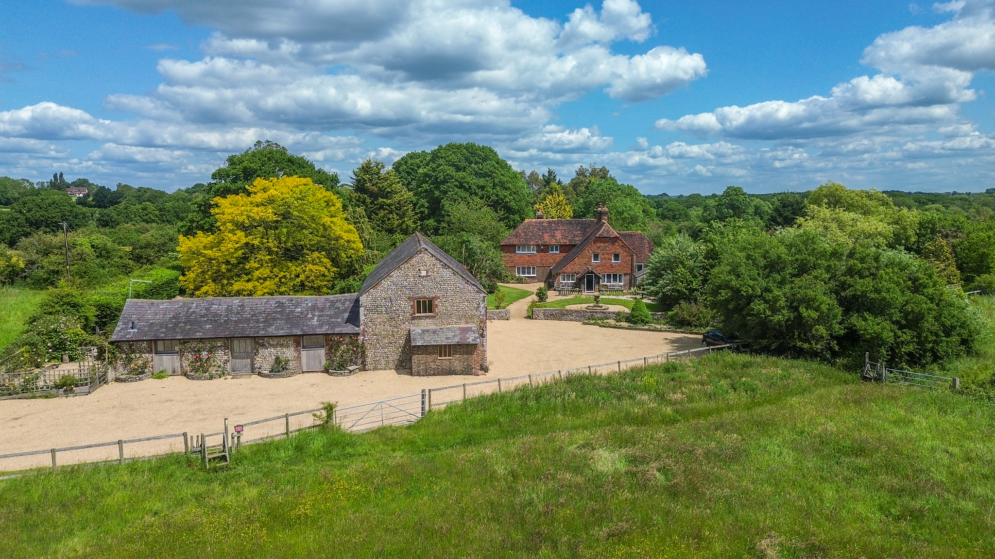 A 5 bedroom Grade II listed former hall house coming to the market for the first time since 1966 with numerous period features to include impressive Inglenook fireplaces. The oldest part dates from the 15th century with subsequent additions in the 1960’s and 1970’s. Situated at the end of an 250 m private tree lined drive and surrounded by it’s own grounds extending to just over 25 acres to include a 15 acre paddock with stunning views to the South Downs. A flint barn provides development opportunity S.T.P.P with a garage to one side and a 1 bedroom ground floor annexe.