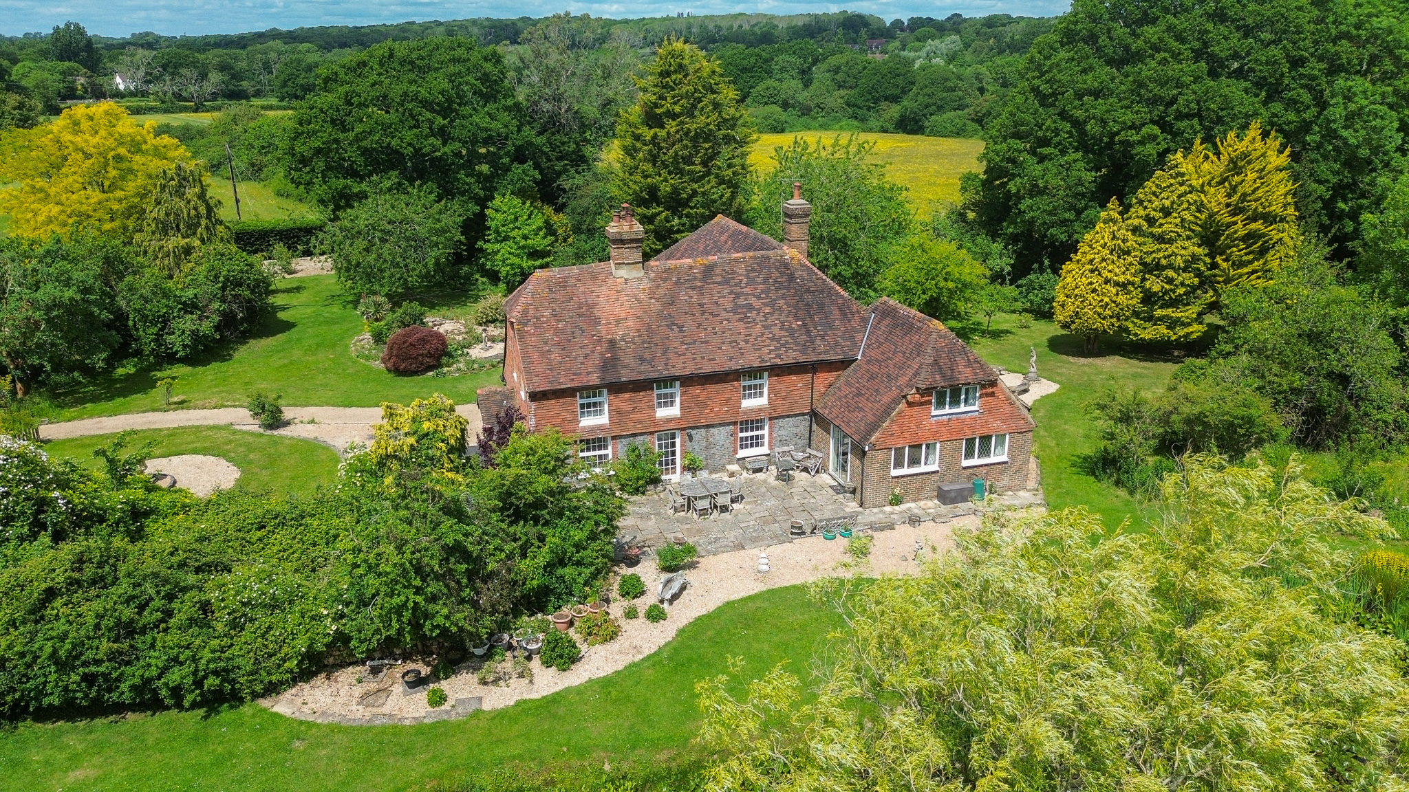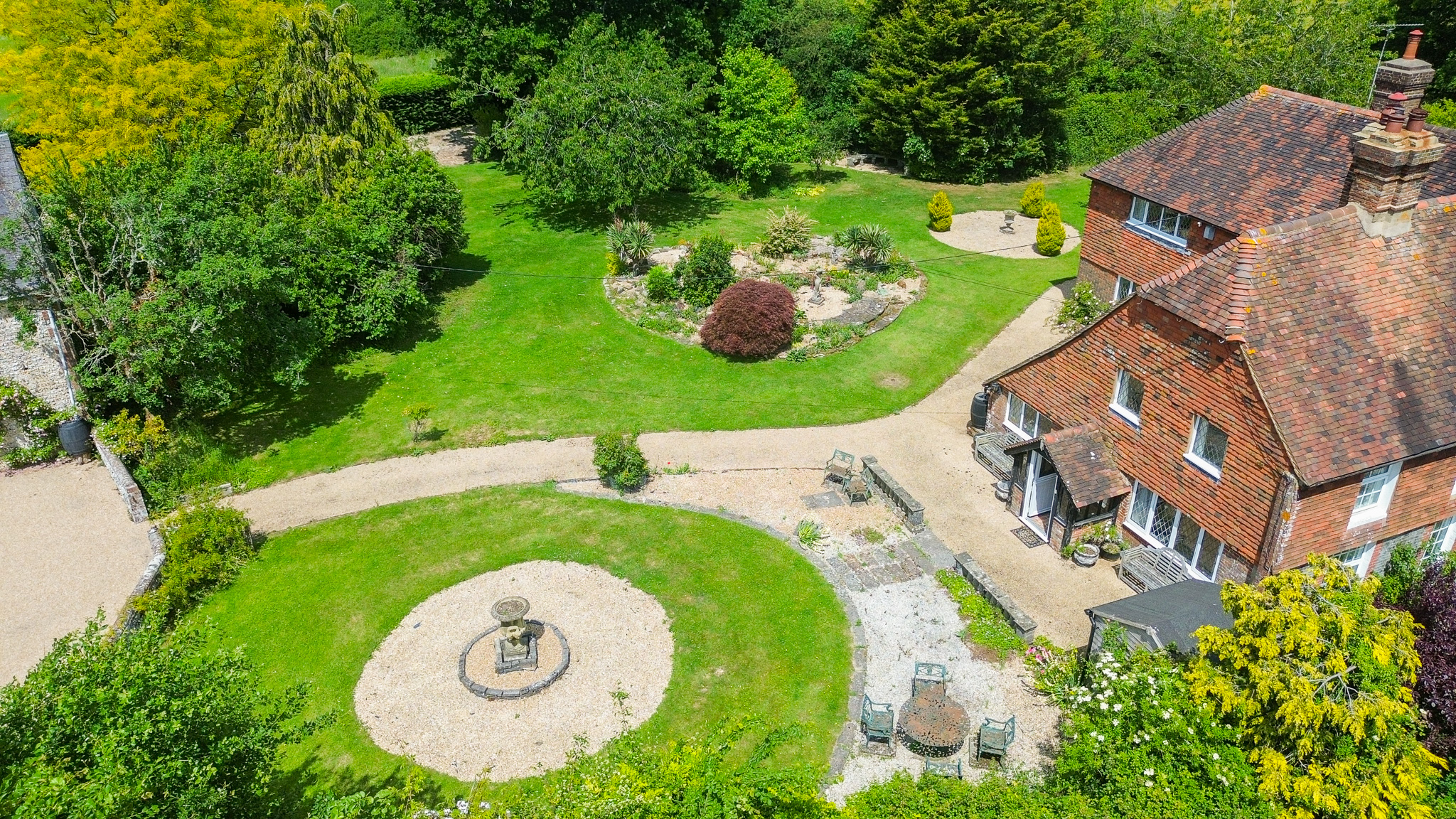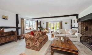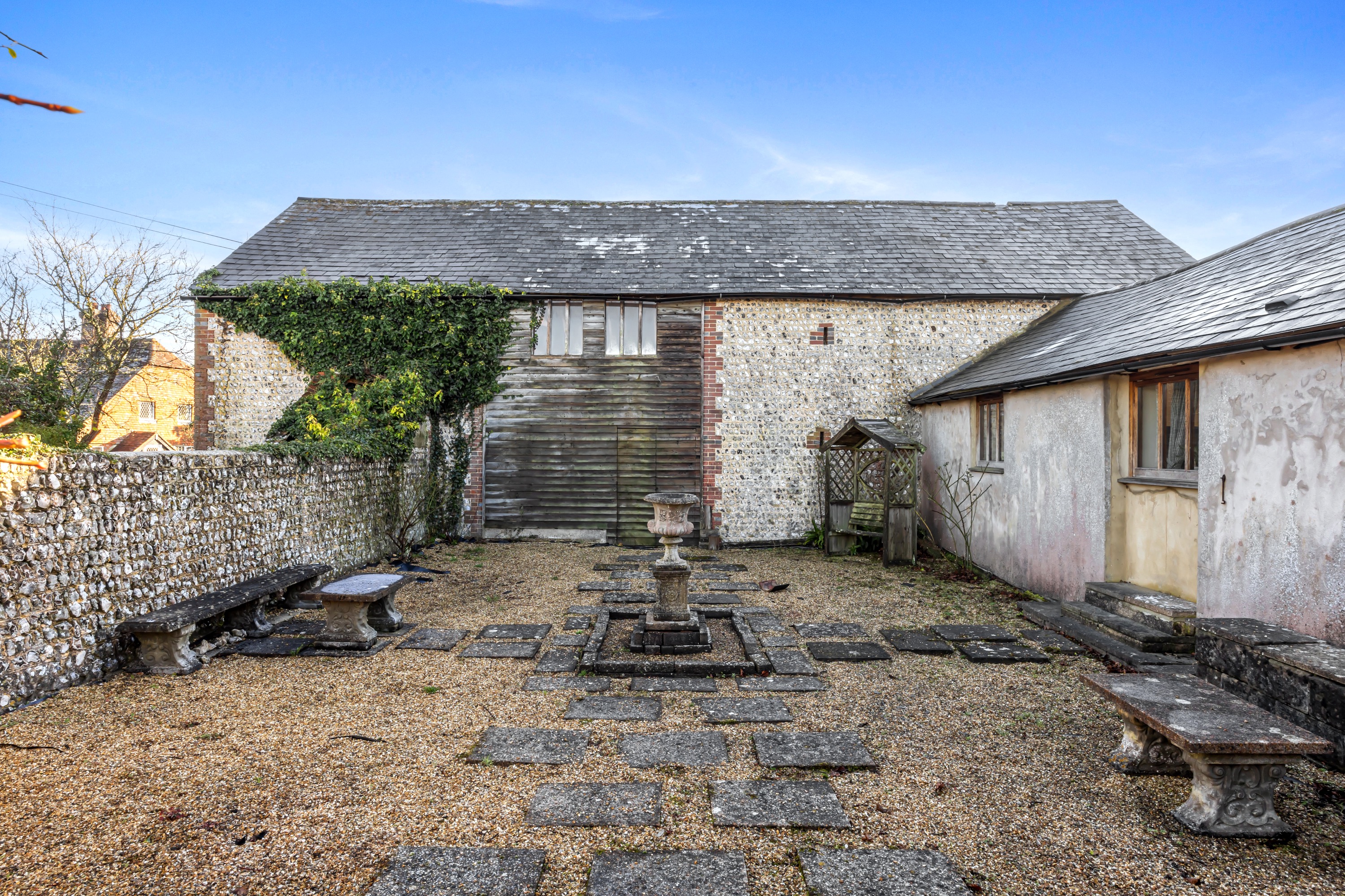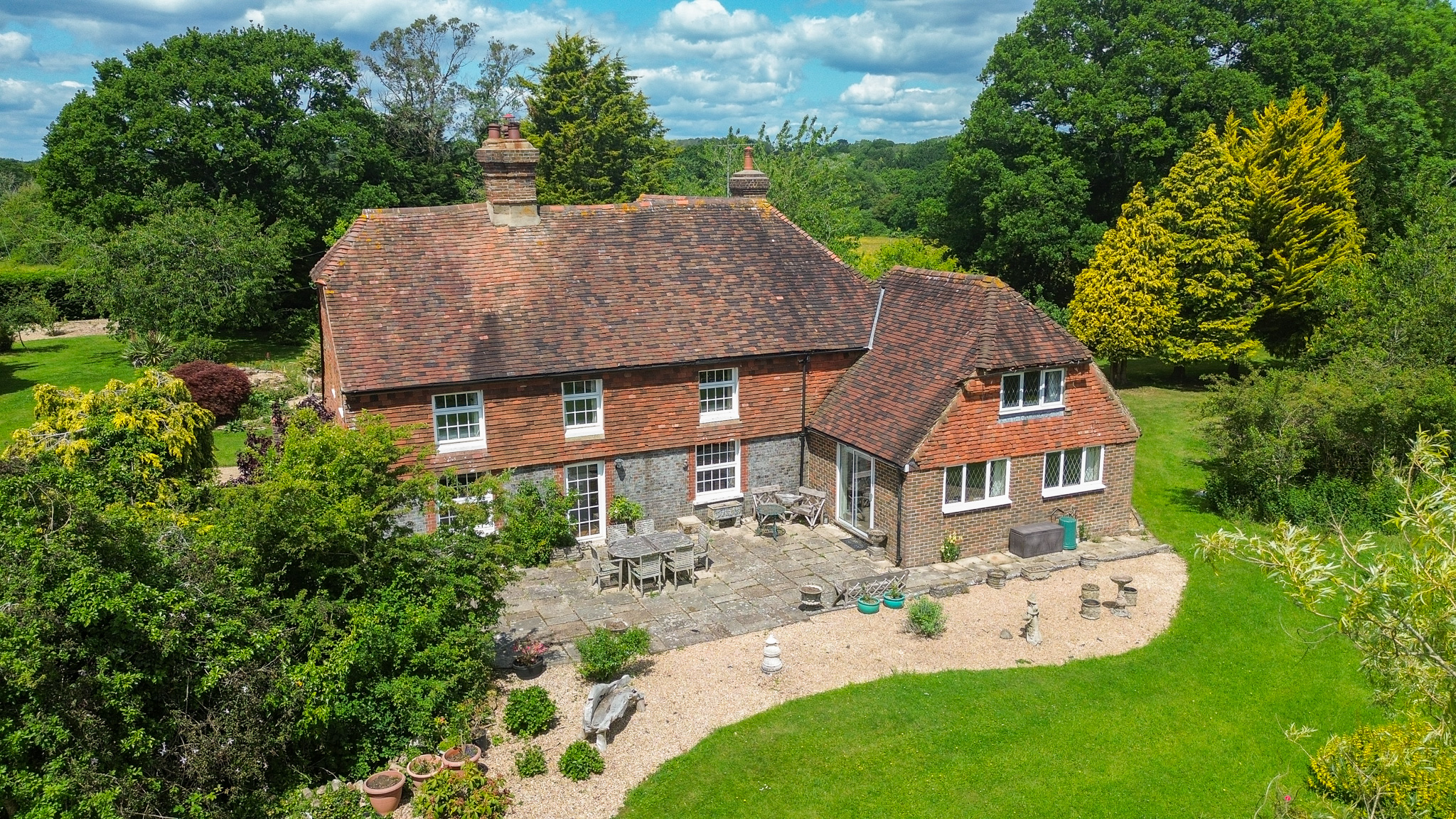 A 5 bedroom Grade II listed former hall house coming to the market for the first time since 1966 with numerous period features to include impressive Inglenook fireplaces. The oldest part dates from the 15th century with subsequent additions in the 1960’s and 1970’s. Situated at the end of an 250 m private tree lined drive and surrounded by it’s own grounds extending to just over 25 acres to include a 15 acre paddock with stunning views to the South Downs. A flint barn provides development opportunity S.T.P.P with a garage to one side and a 1 bedroom ground floor annexe.