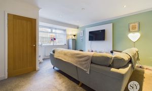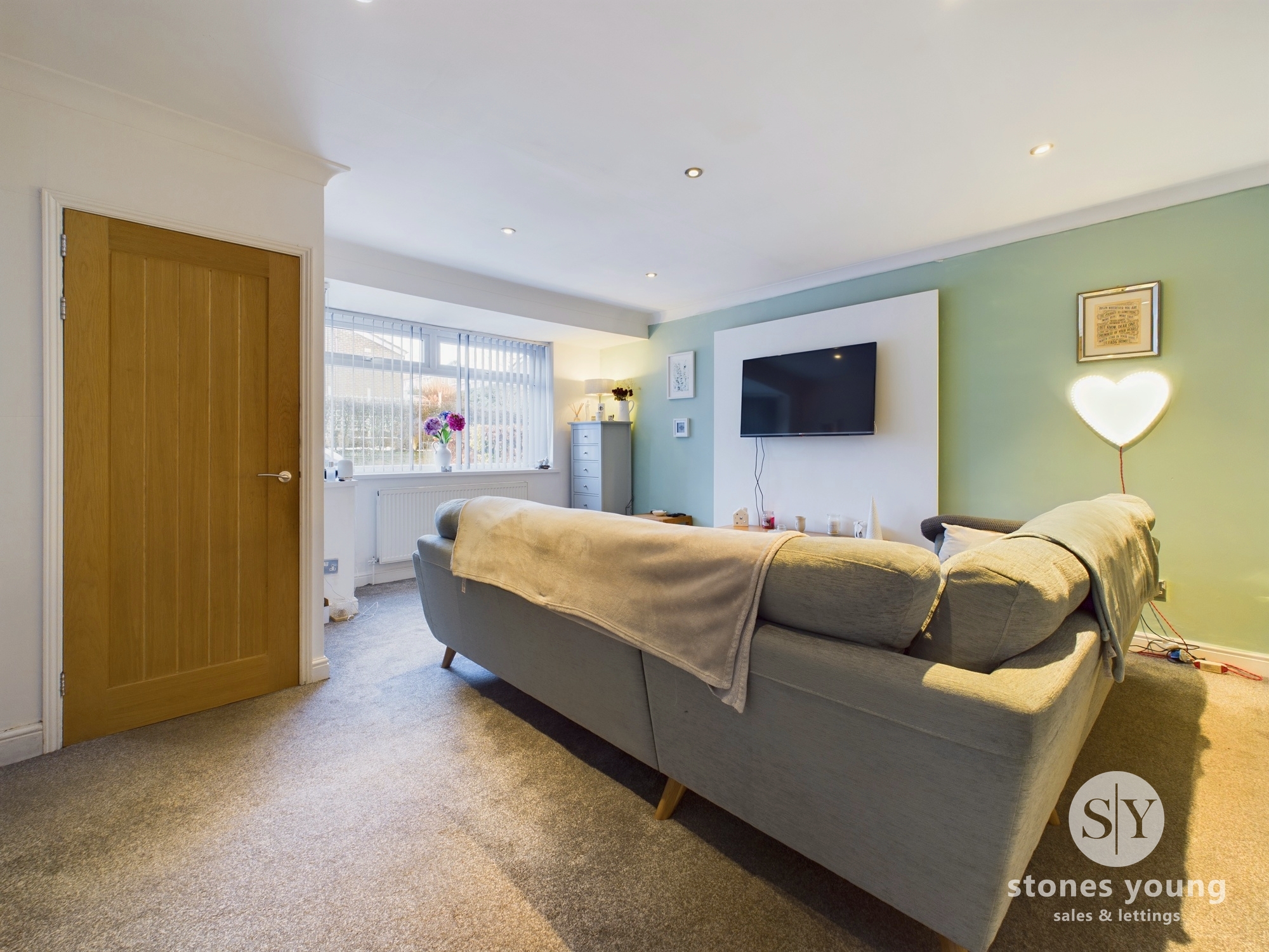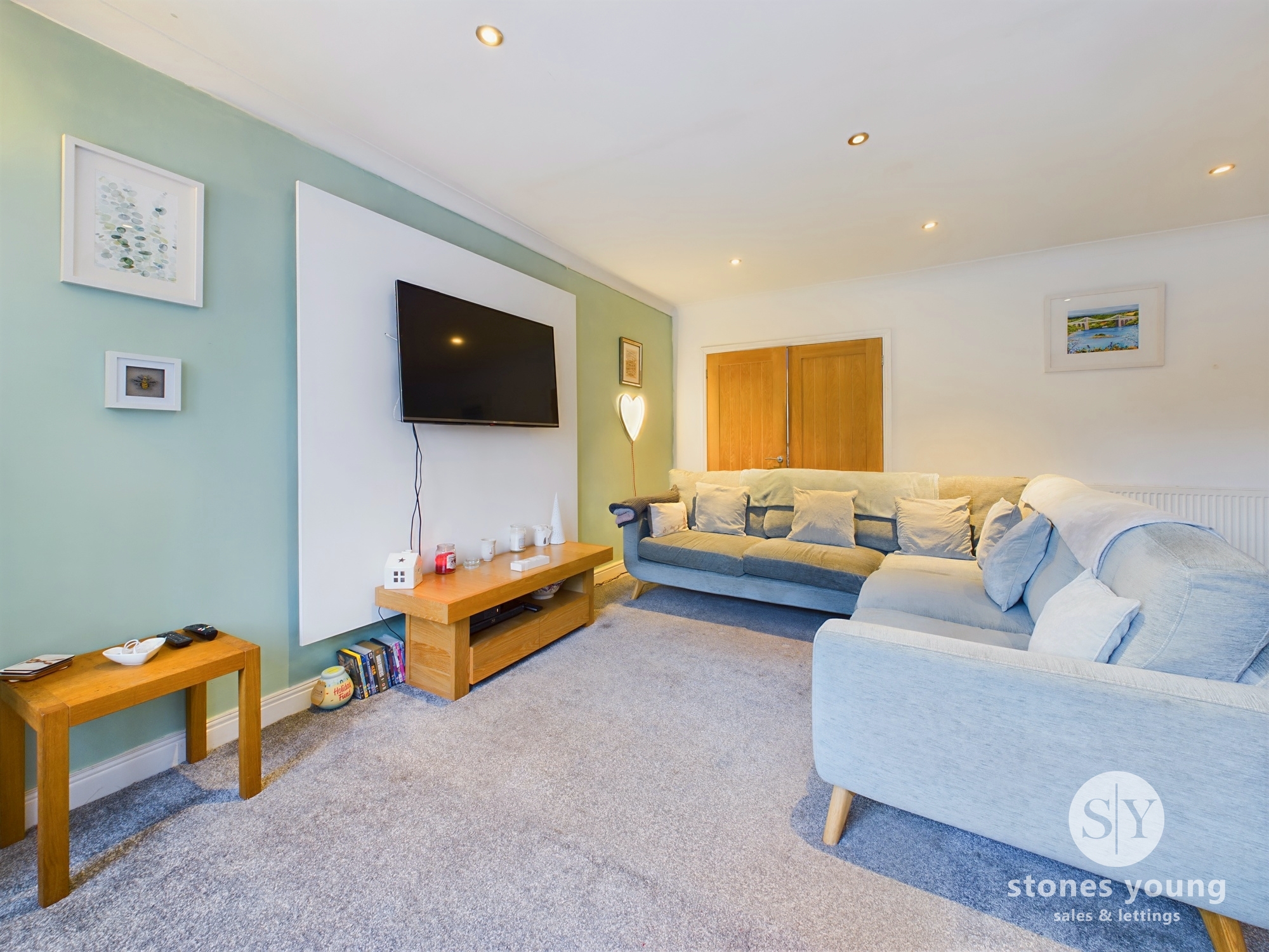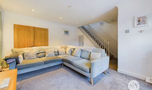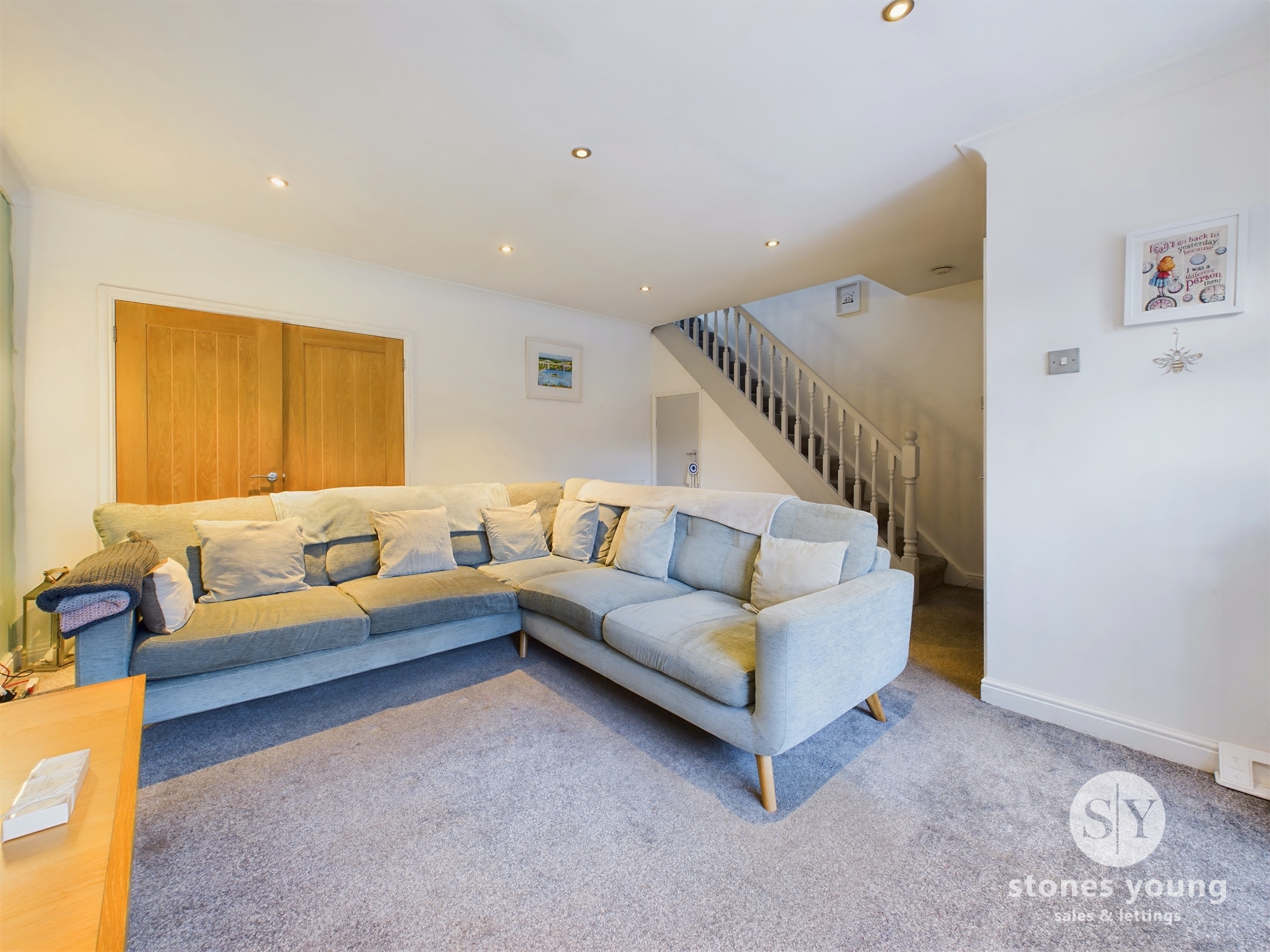 Carpet flooring, ceiling coving, ceiling spot lights, under stairs storage, stairs to first floor, double doors leading into the kitchen, double glazed uPVC window, x2 panel radiators.
