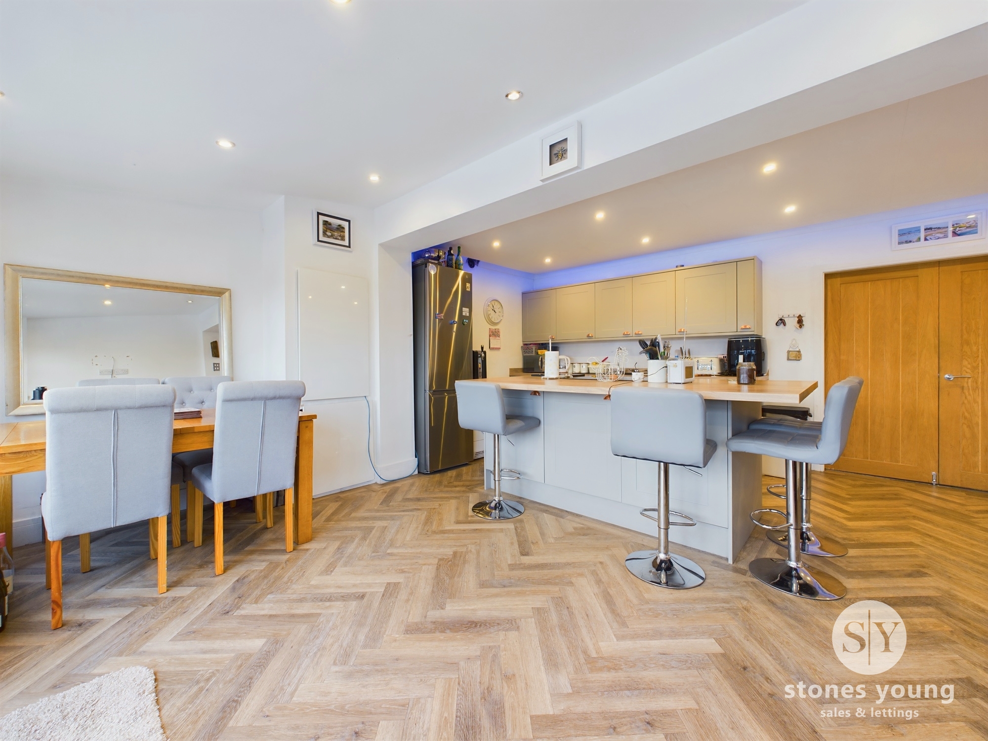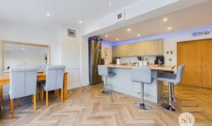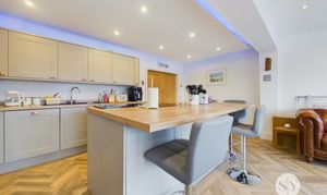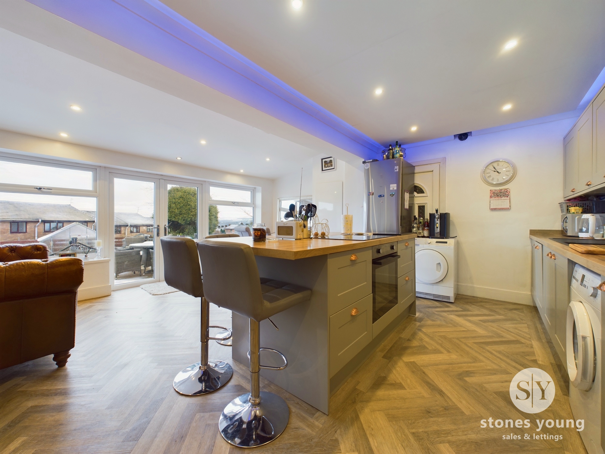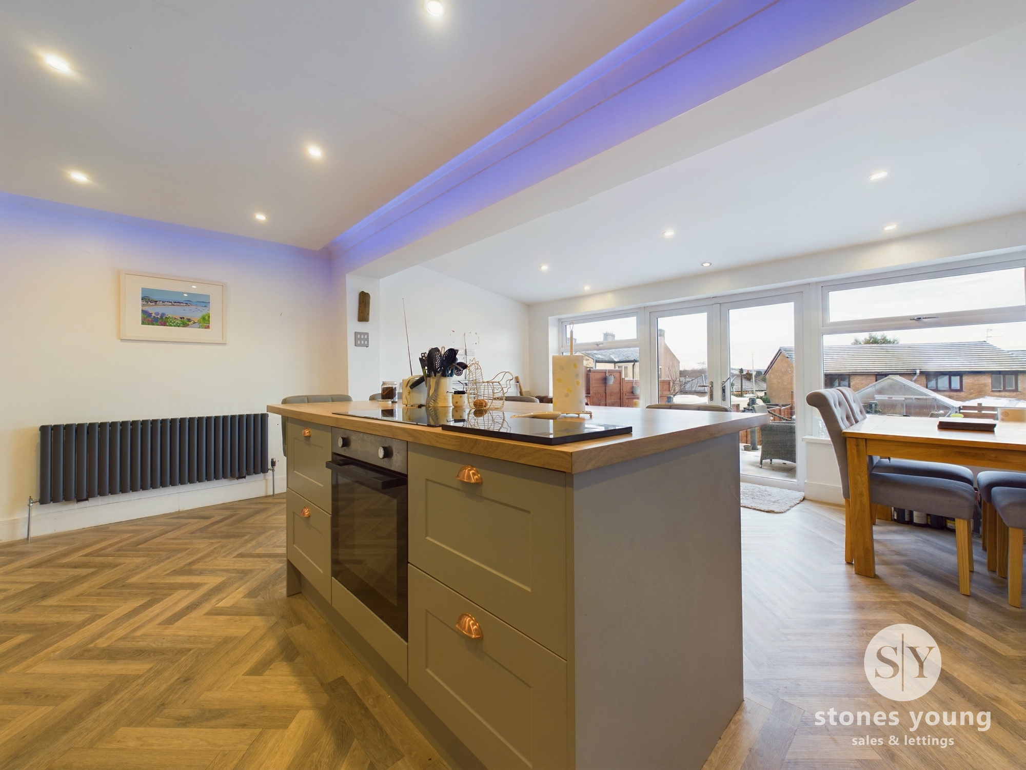 LVT flooring, fitted wall and base units with contrasting work surfaces, electric hob, electric oven, sinks and drainer, plumbed for washing machine, integral dishwasher, space for fridge freezer, ceiling spot lights, island with space for stools, space for settee and dining table, double glazed uPVC windows and French doors leading to the rear garden, panel radiator.