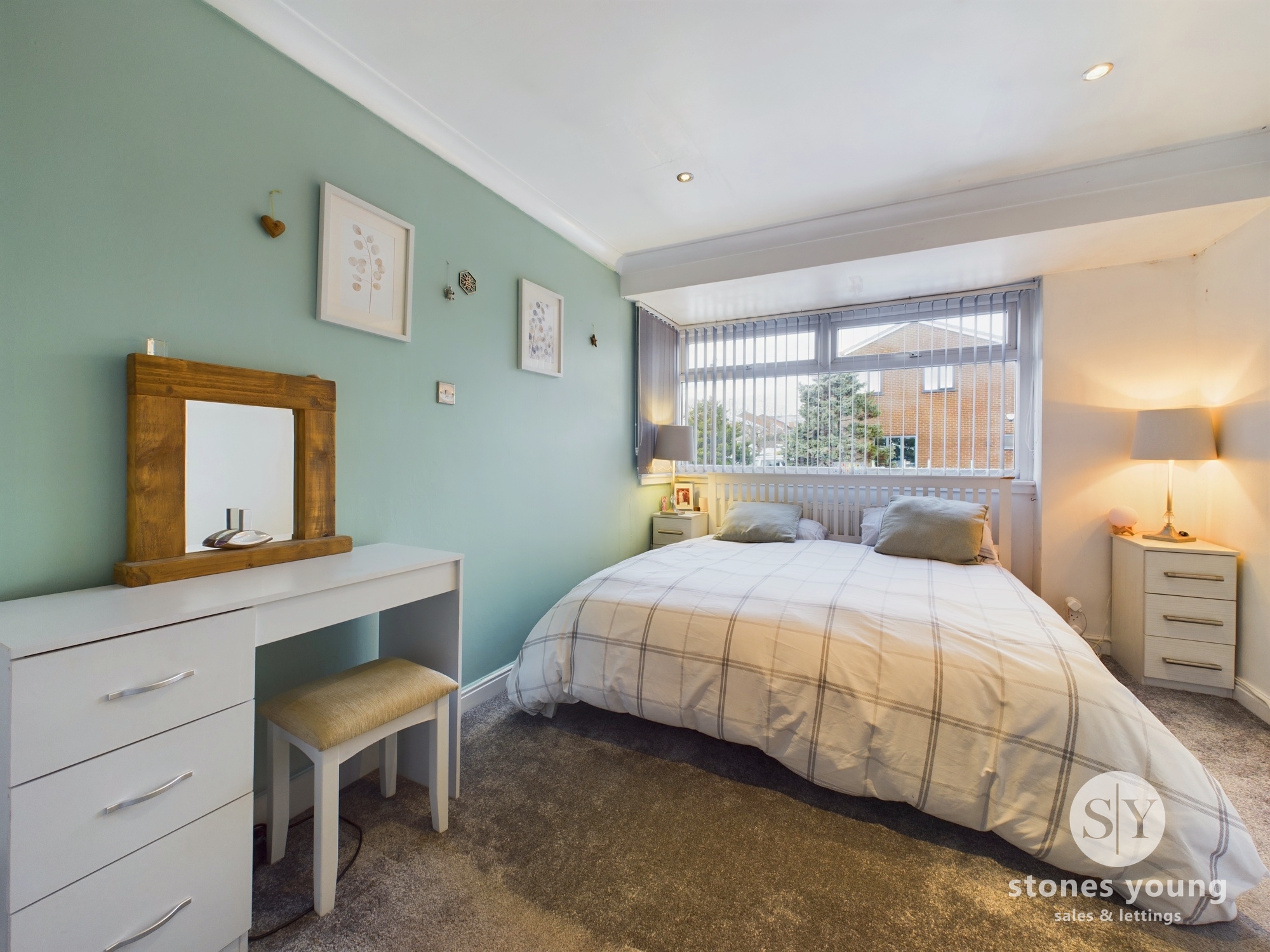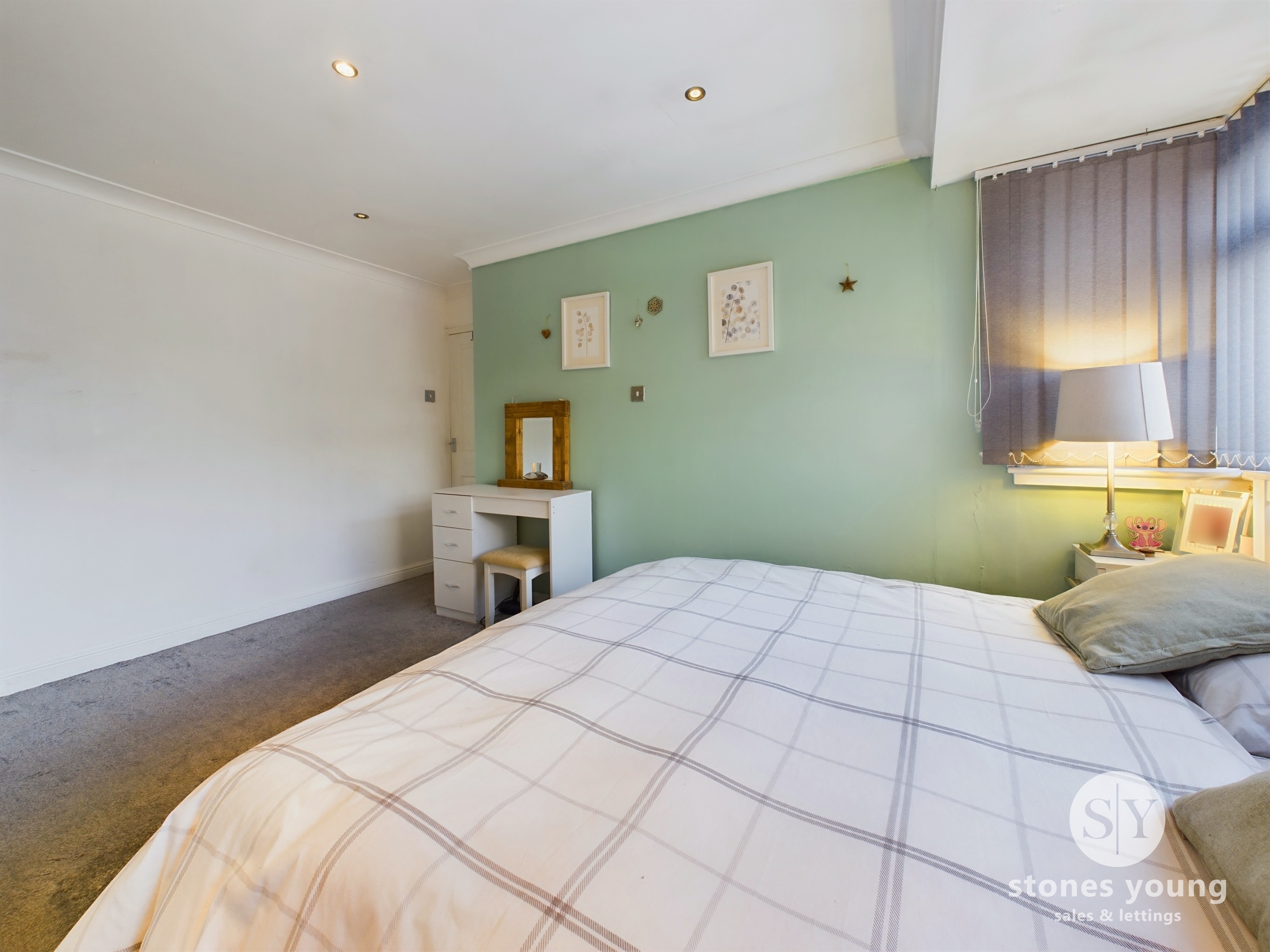 Double bedroom with carpet flooring, ceiling coving, ceiling spot lights, fitted wardrobes, double glazed uPVC window, panel radiator.