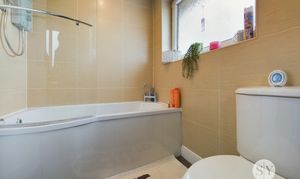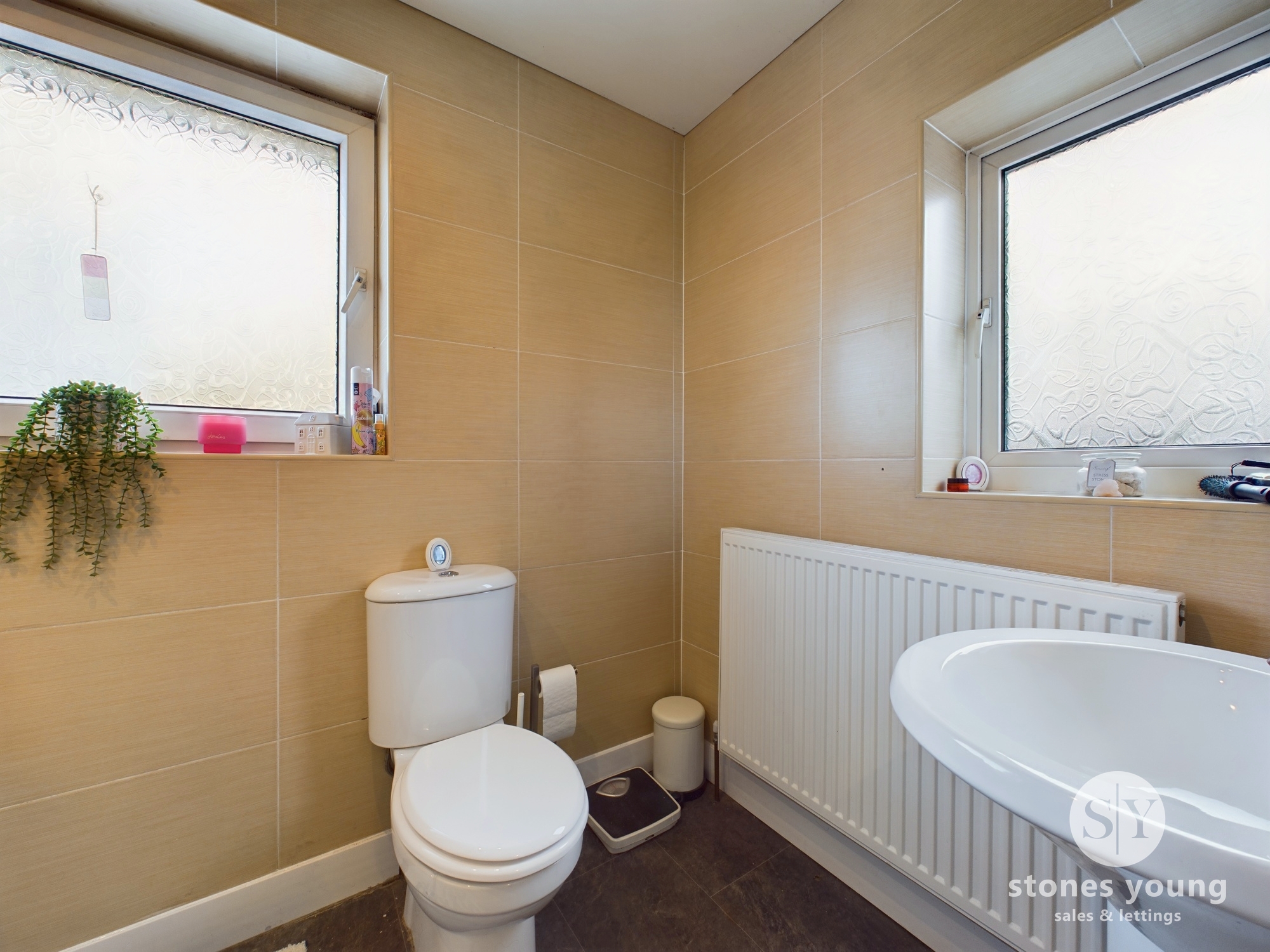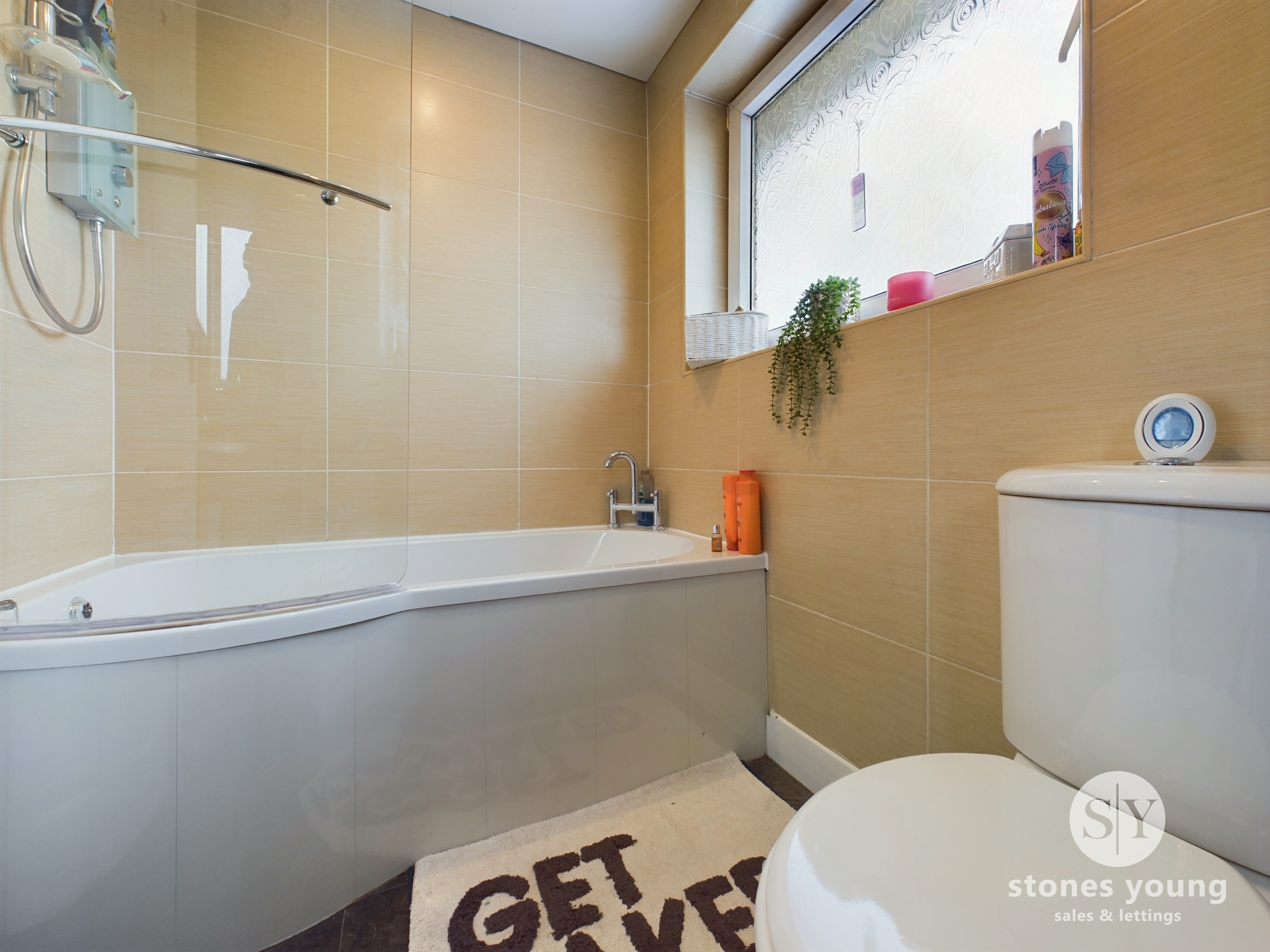 Vinyl flooring, three piece in white comprising of electric shower over bath, basin and wc, tiled floor to ceiling, ceiling spot lights, x2 frosted double glazed uPVC windows, panel radiator.