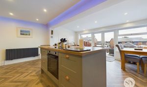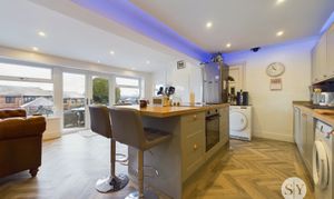 Step inside and be greeted by a generously proportioned lounge that offers a versatile space for relaxation and entertainment. The modern open-plan kitchen and dining area is a true highlight, featuring sleek finishes, an island for casual dining, and integrated appliances for the culinary enthusiast. With ample space for appliances and patio doors leading to the rear garden, this kitchen is the heart of the home, perfect for hosting gatherings and creating lasting memories.