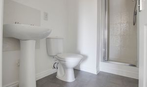 Three piece white suite comprising low level WC, pedestal wash hand basin and fitted shower with glass door and tiled splash backs. Extractor fan.