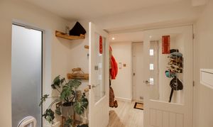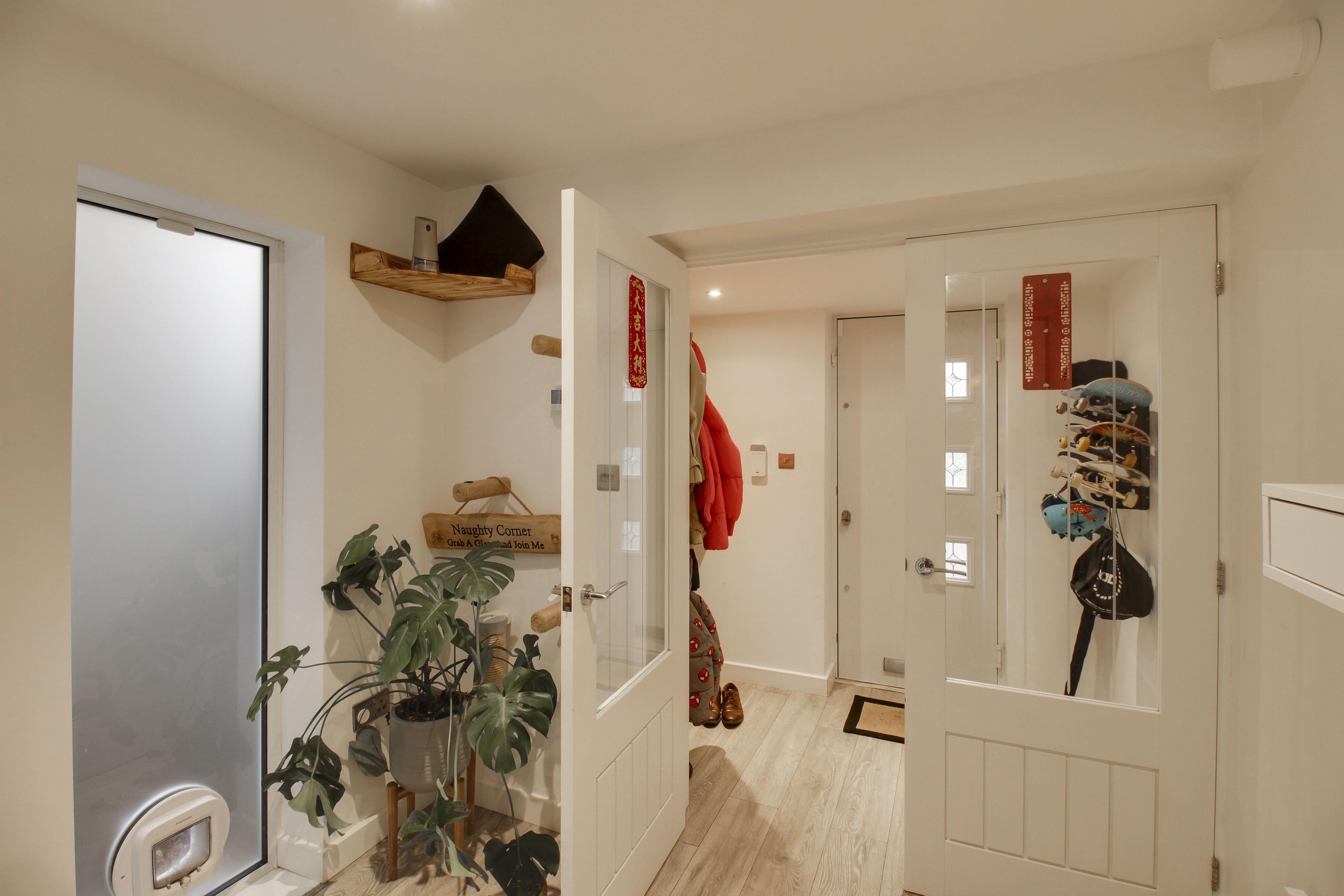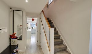 Composite entrance door leading to entrance porch. Glazed doors through to entrance hall. Stairs to first floor with storage cupboards under. Window to side with fitted cat flap. Wood flooring with underfloor heating. Door through to kitchen/dining/family room.