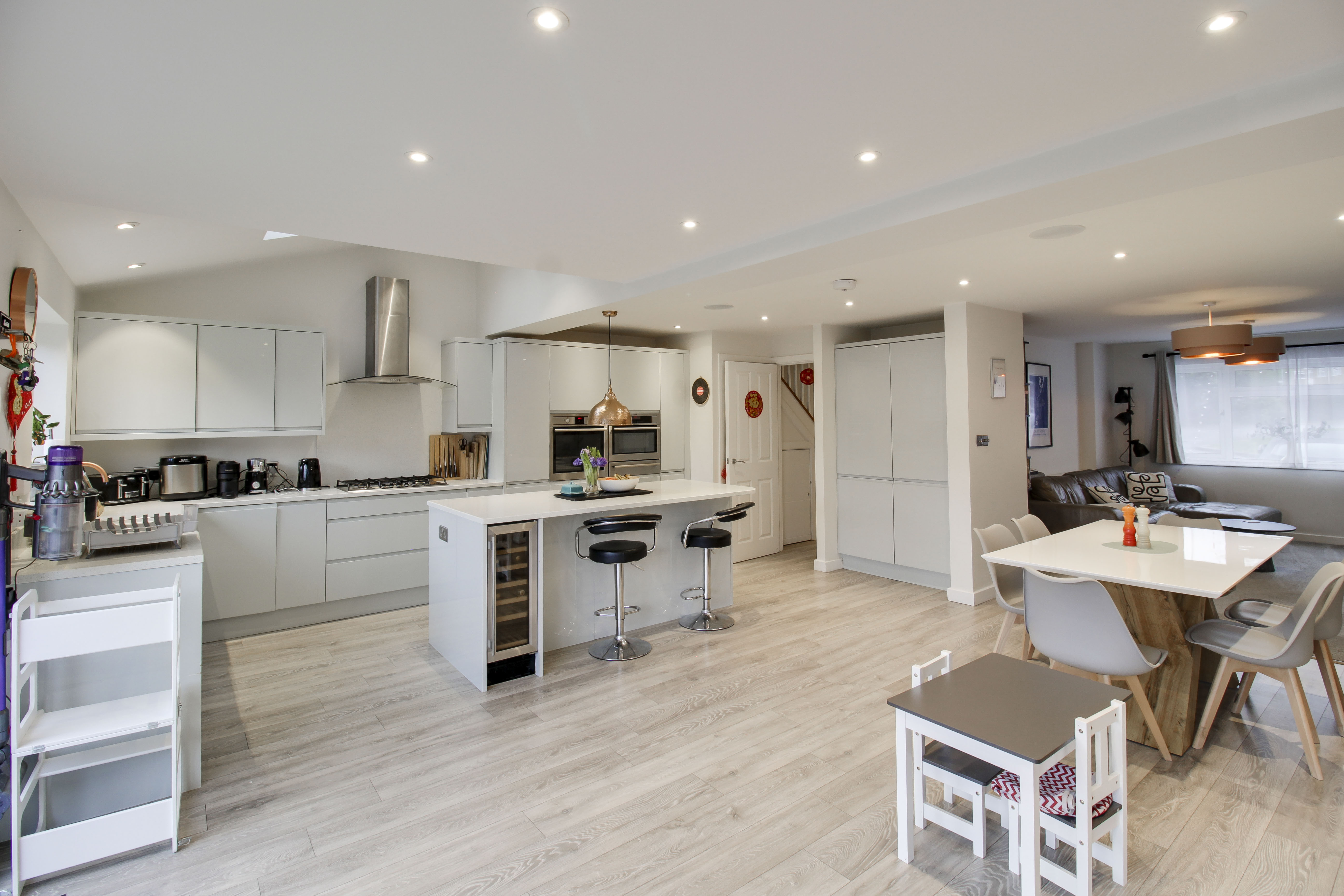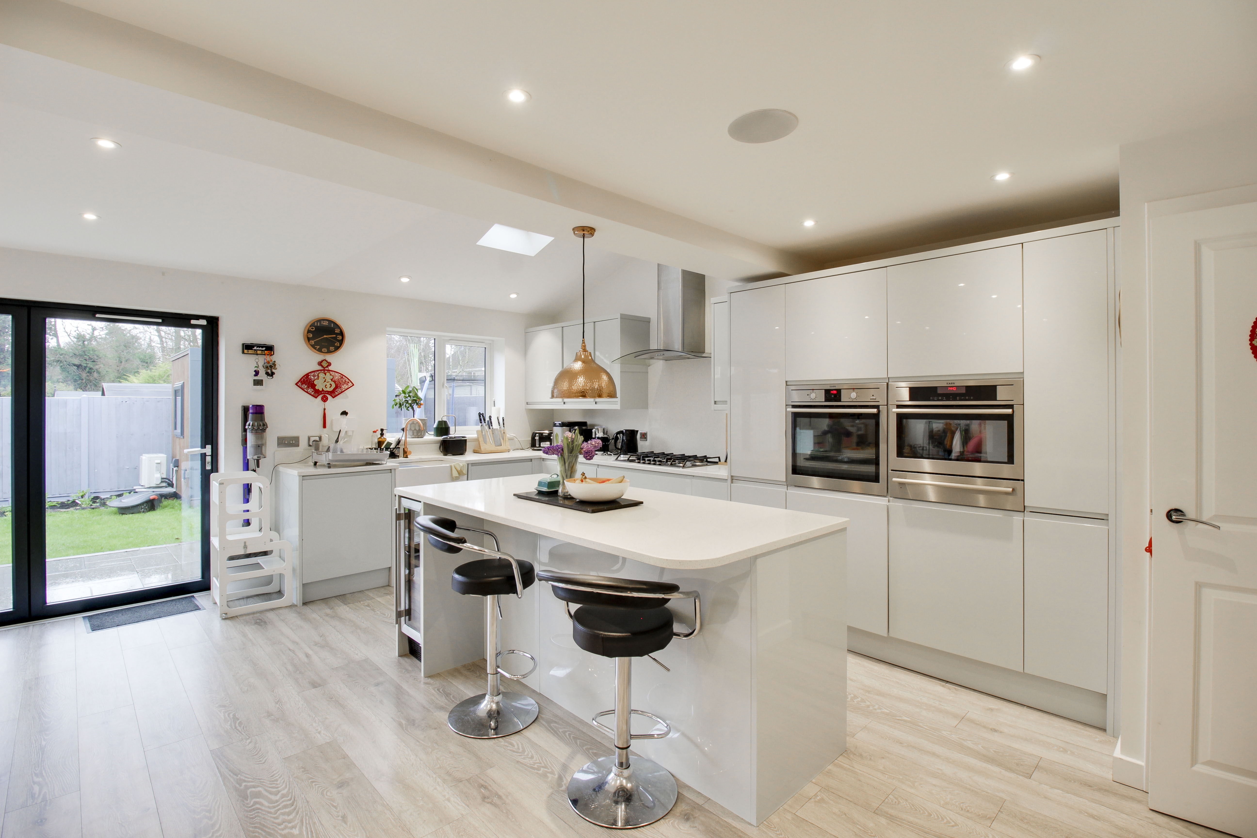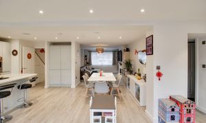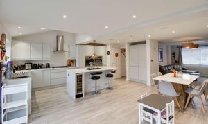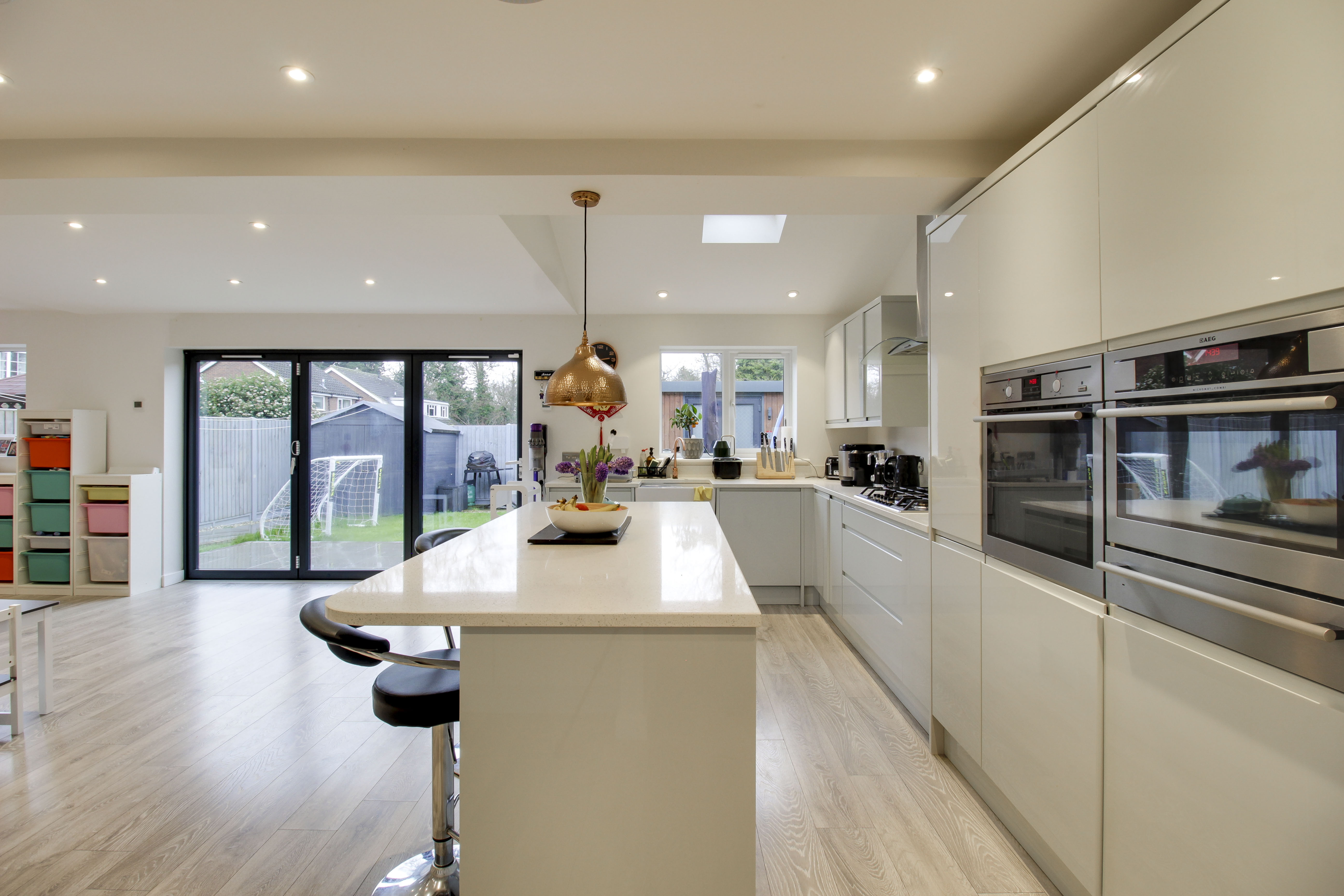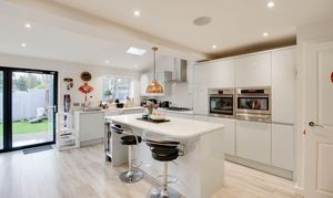 Refitted kitchen comprising Quartz worksurfaces with gloss handle less drawers and cupboards under. Wall mounted cupboards. Built in AEG oven, combi oven and warming drawer. Five ring gas hob with extractor fan over. Butler sink with mixer tap and Quartz splash backs. Built in fridge/freezer and dishwasher. Island with breakfast bar. UPVC window to rear. Wood flooring with underfloor heating. Bi-folding doors to rear garden. UPVC window to rear. Inset ceiling lights and ceiling speakers. Open plan through to living room. Door to WC and garage.