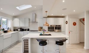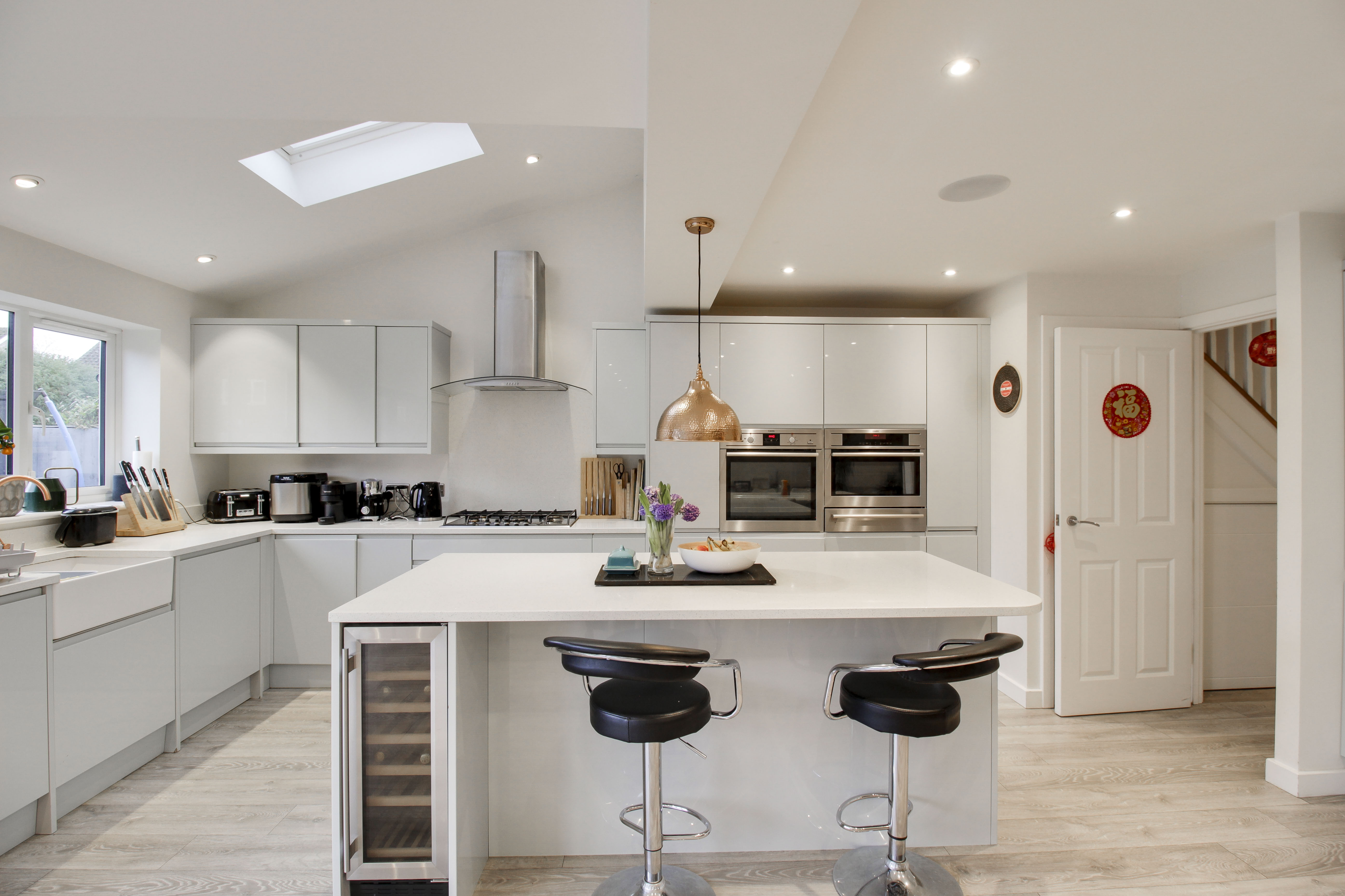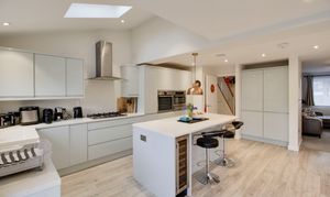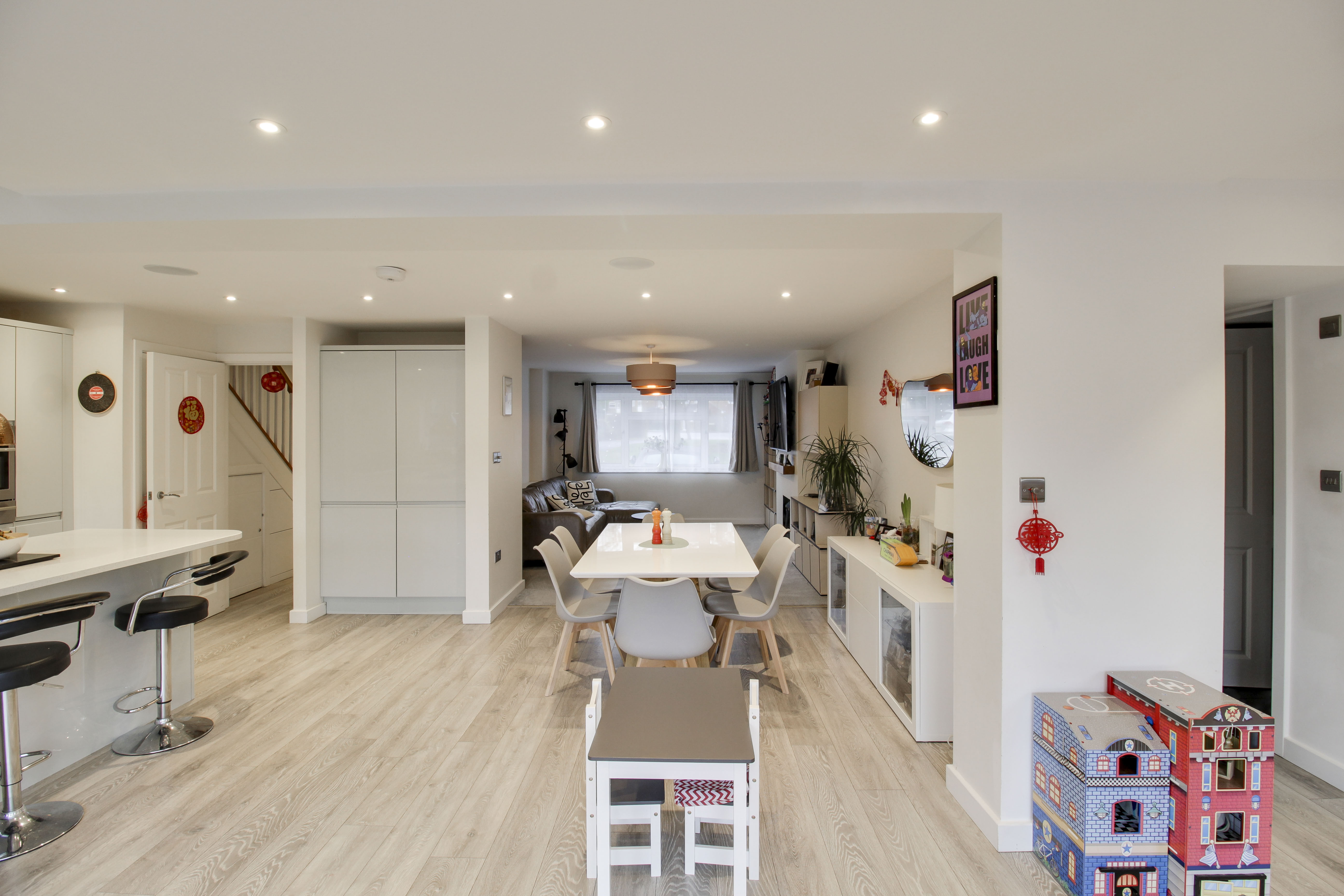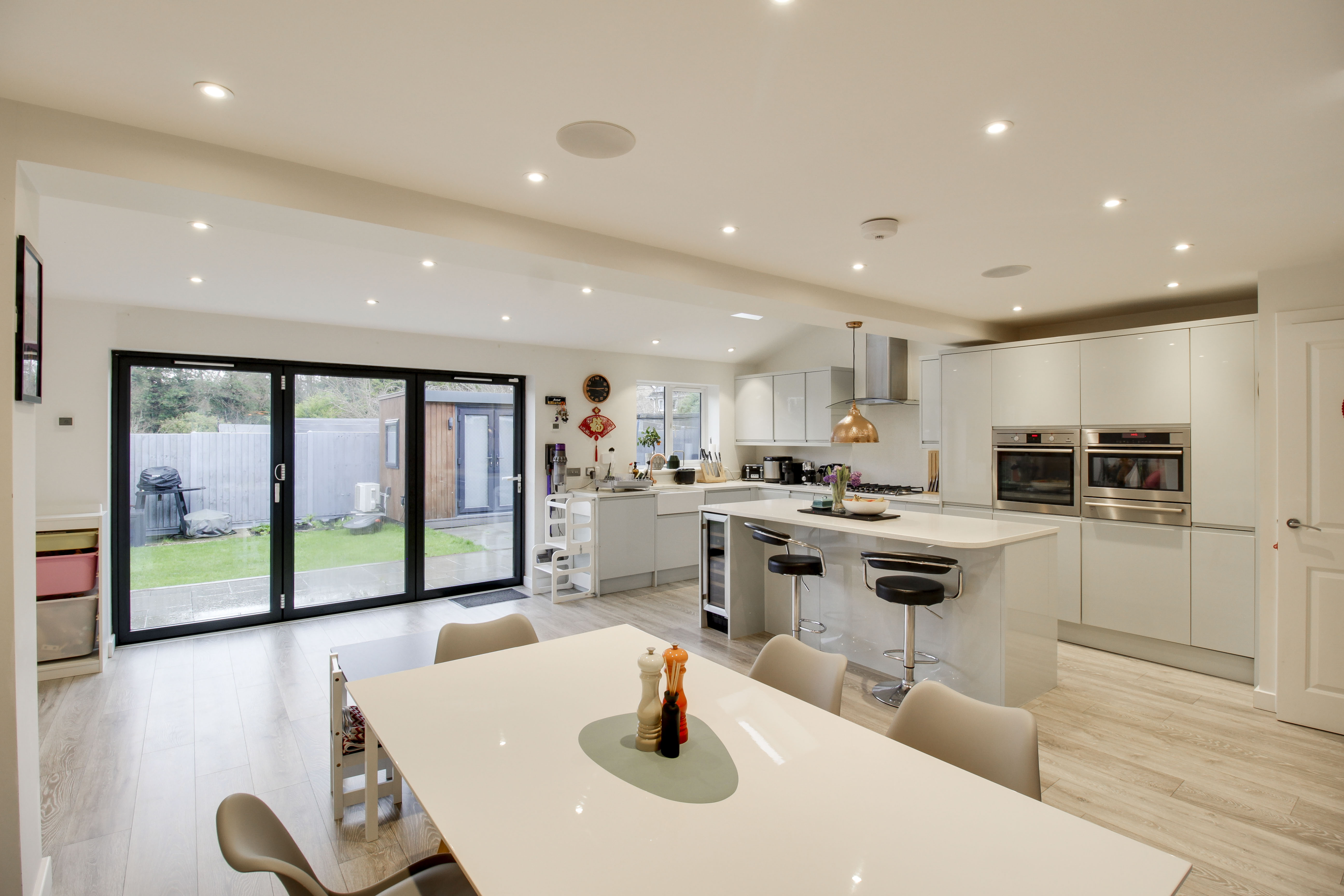 Refitted kitchen comprising Quartz worksurfaces with gloss handle less drawers and cupboards under. Wall mounted cupboards. Built in AEG oven, combi oven and warming drawer. Five ring gas hob with extractor fan over. Butler sink with mixer tap and Quartz splash backs. Built in fridge/freezer and dishwasher. Island with breakfast bar. UPVC window to rear. Wood flooring with underfloor heating. Bi-folding doors to rear garden. UPVC window to rear. Inset ceiling lights and ceiling speakers. Open plan through to living room. Door to WC and garage.