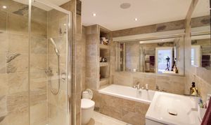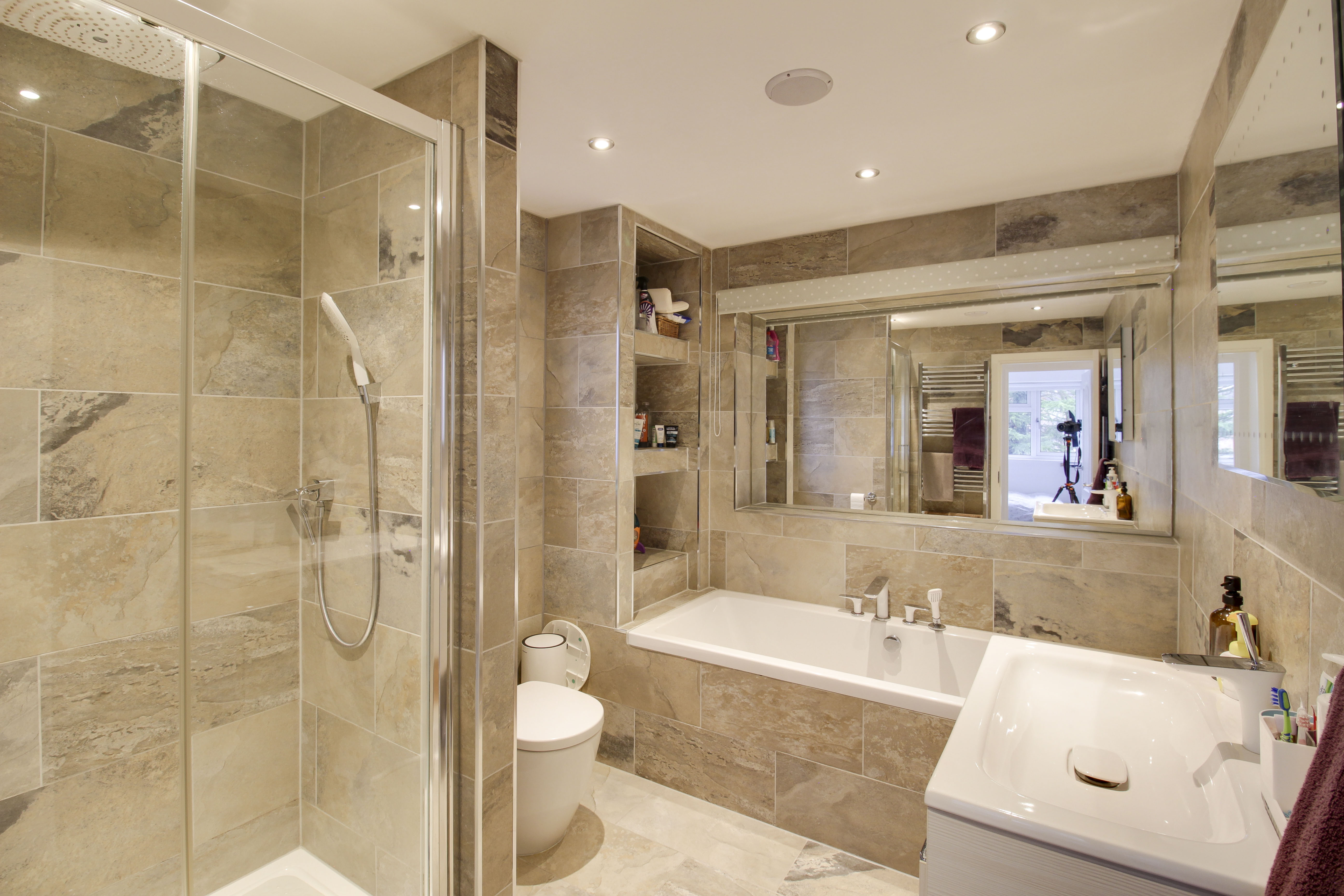 Refitted four piece suite comprising low level WC, wall mounted wash hand basin, fitted shower unit and separate bath. Fully tiled walls. UPVC window to side. Inset ceiling lights. Heated towel rail. Ceiling speaker.