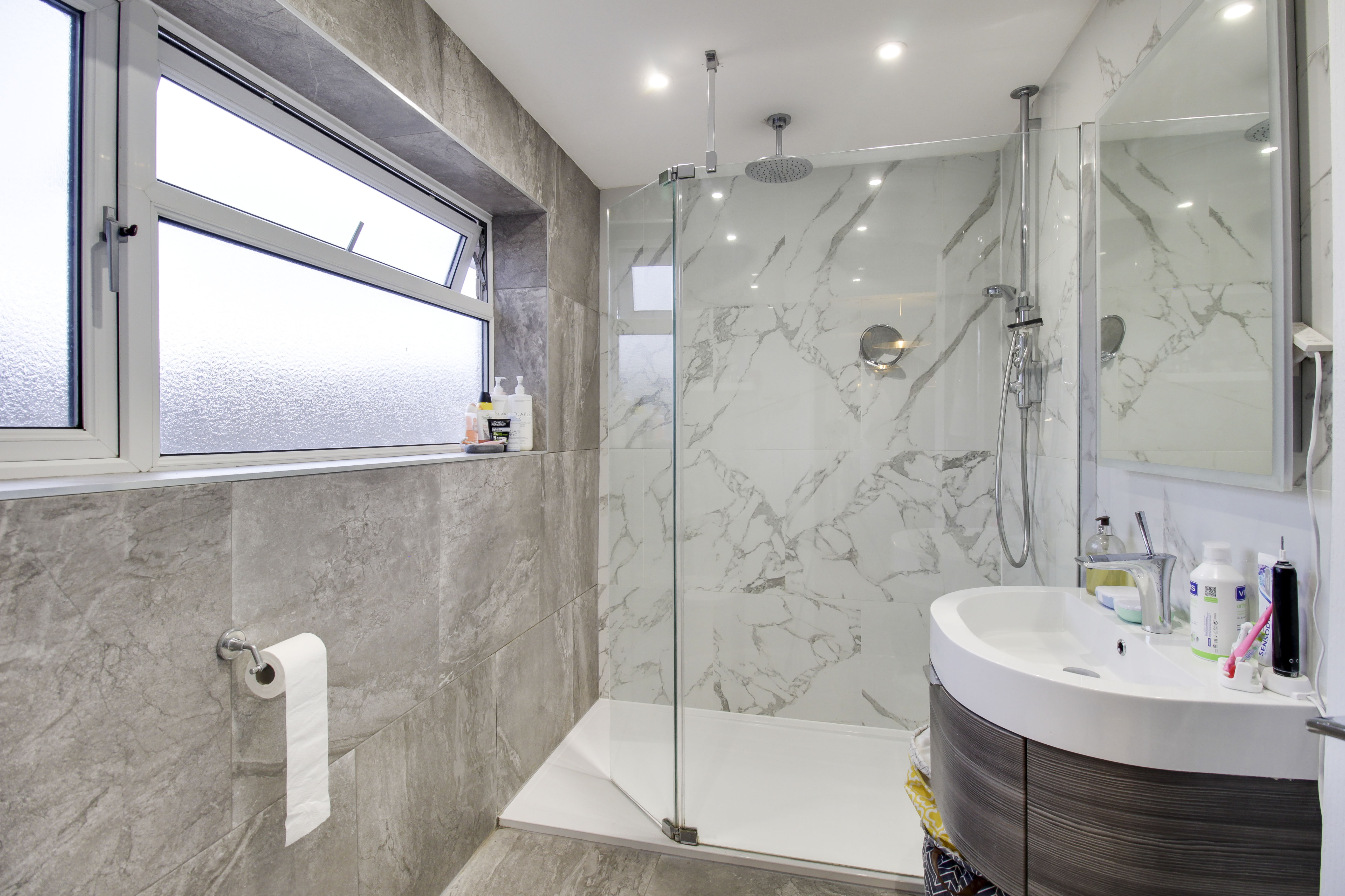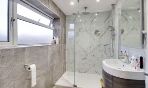 Refitted three piece suite comprising low level WC, wall mounted wash hand basin and fitted shower with fully tiled splash backs and glass screen. UPVC window to rear. Inset ceiling lights. Heated towel rail.