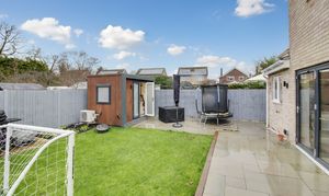 Enclosed rear garden mainly laid to lawn with large patio areas. Gated access to side. Timber storage shed. Outside tap. 3mx2m Insulated garden office with air conditioning and heating system.