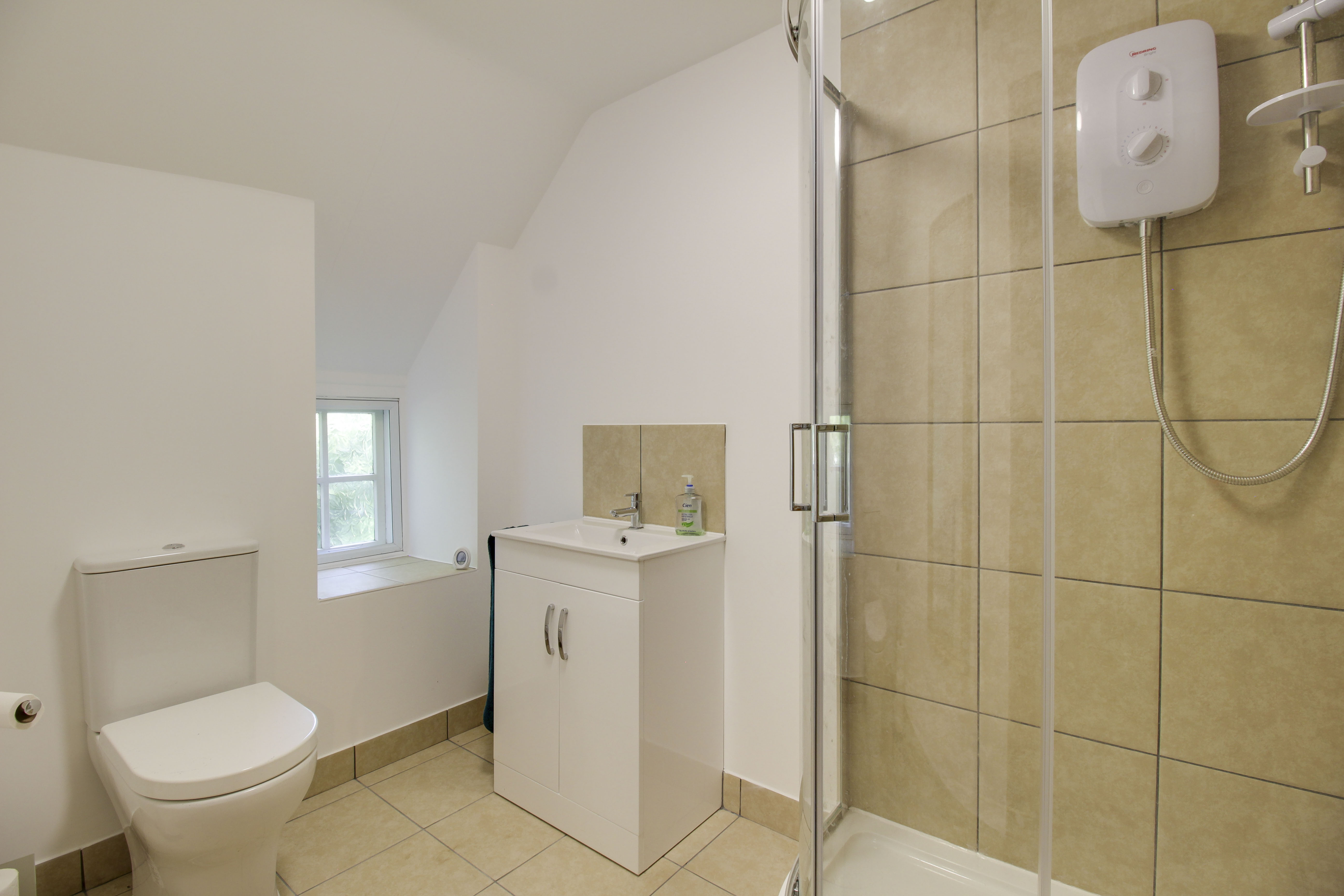 Refitted three piece white suite comprising low level WC, wash hand basin with vanity unit and fitted corner shower unit with glass screens and tiled splash back. Window to rear.