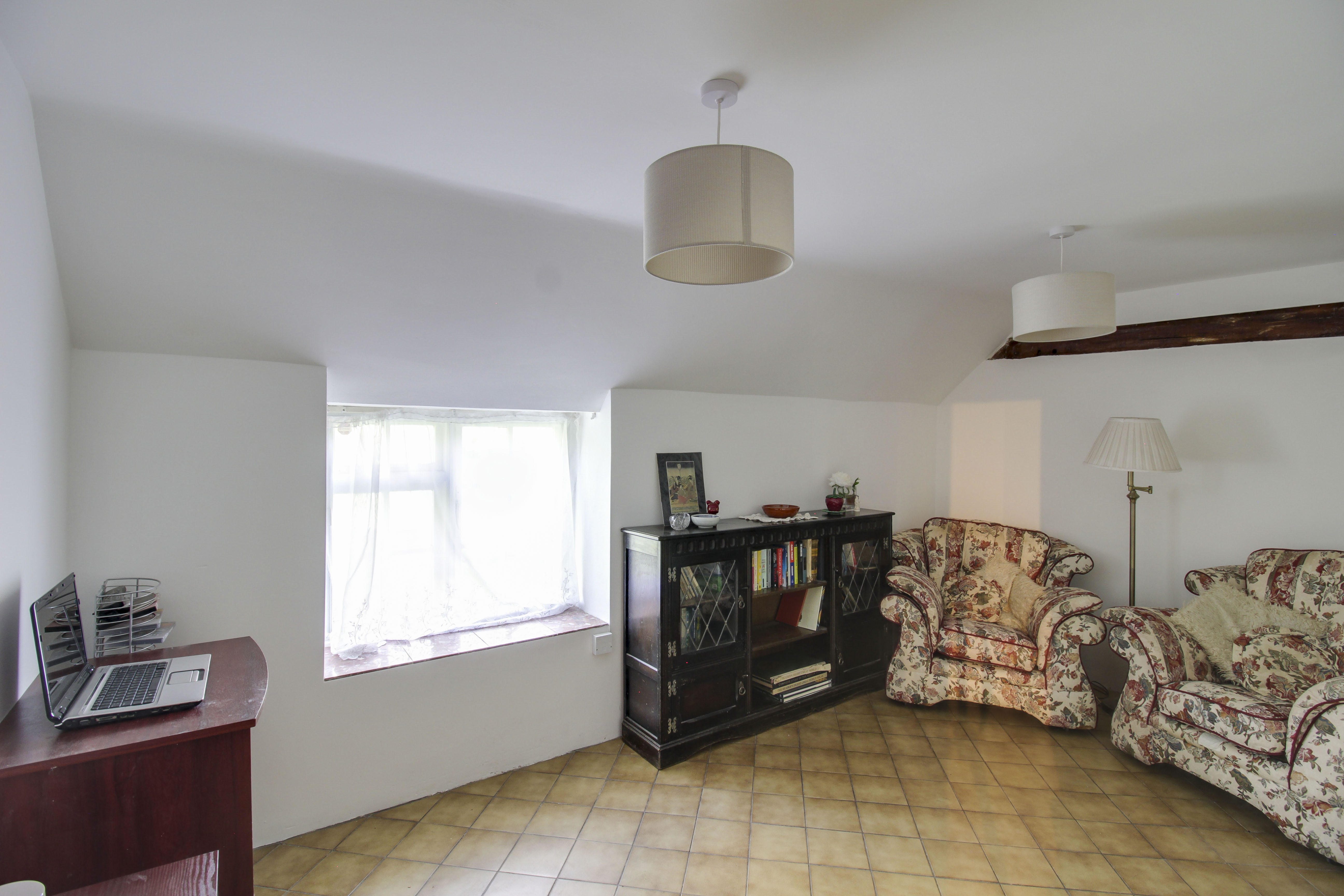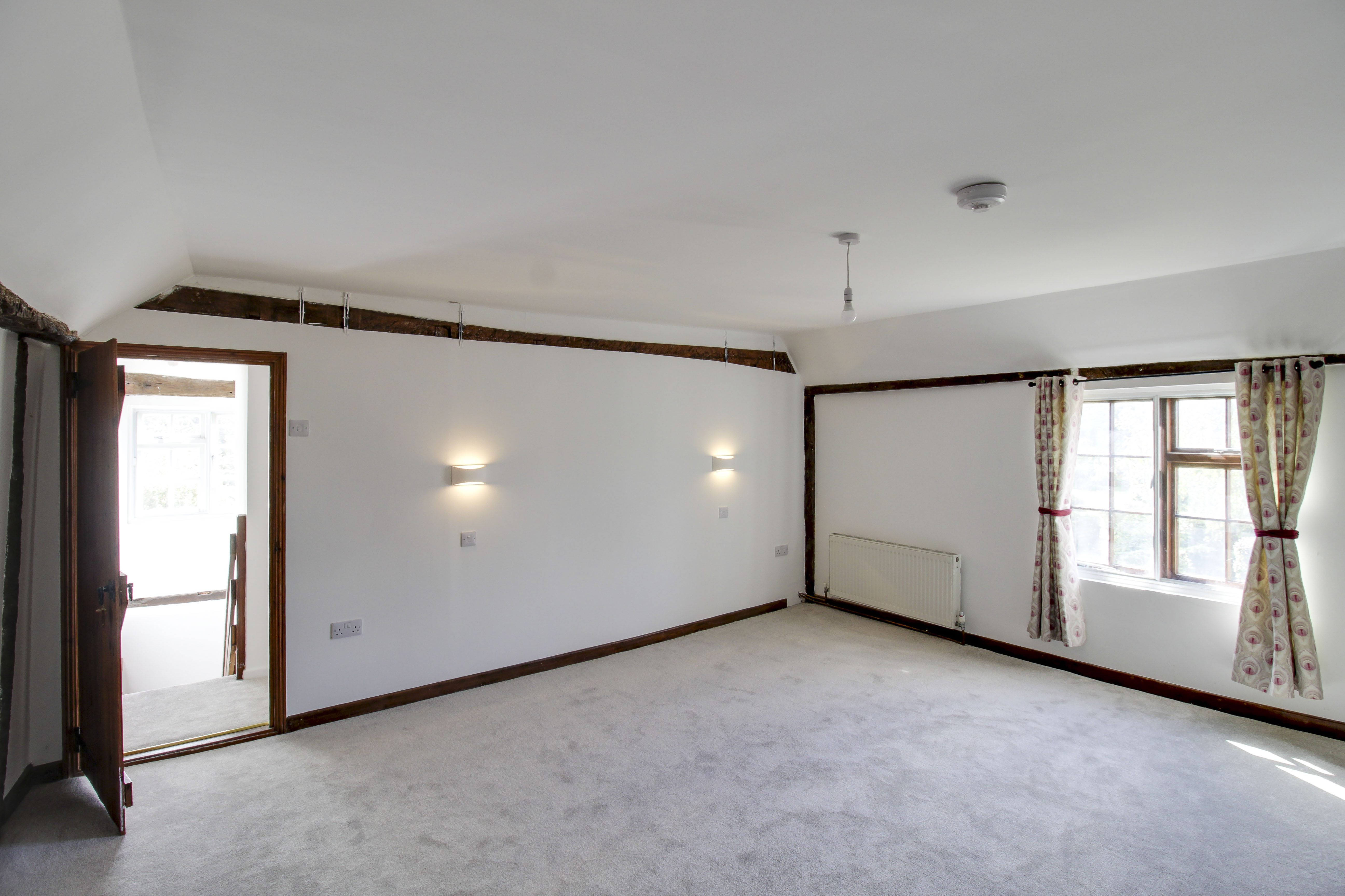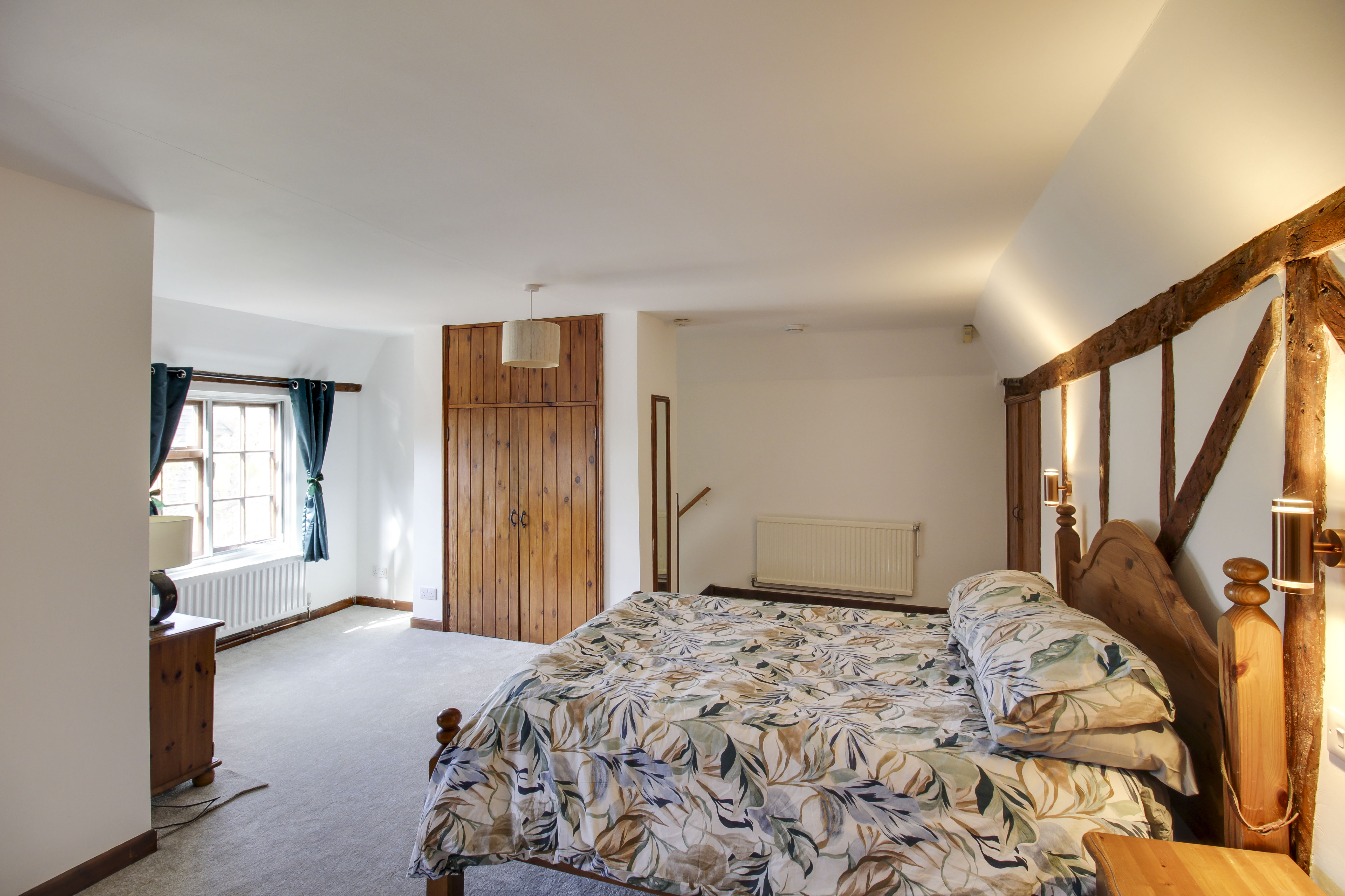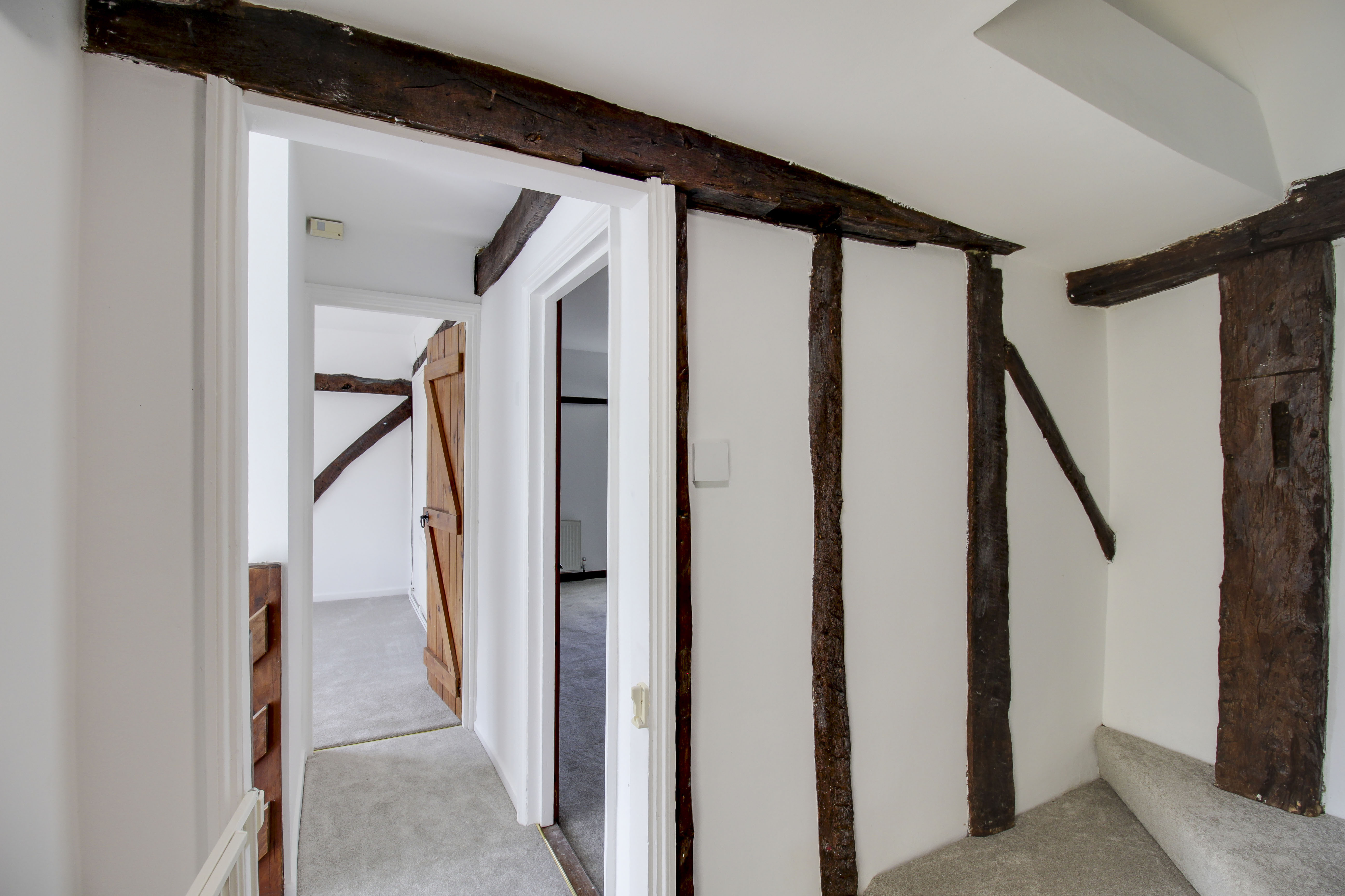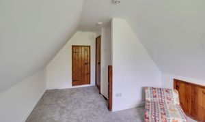 Stairs to bedroom five on the second floor with cupboard under. Doors to bedrooms two, three, four and bathroom. Window to side.