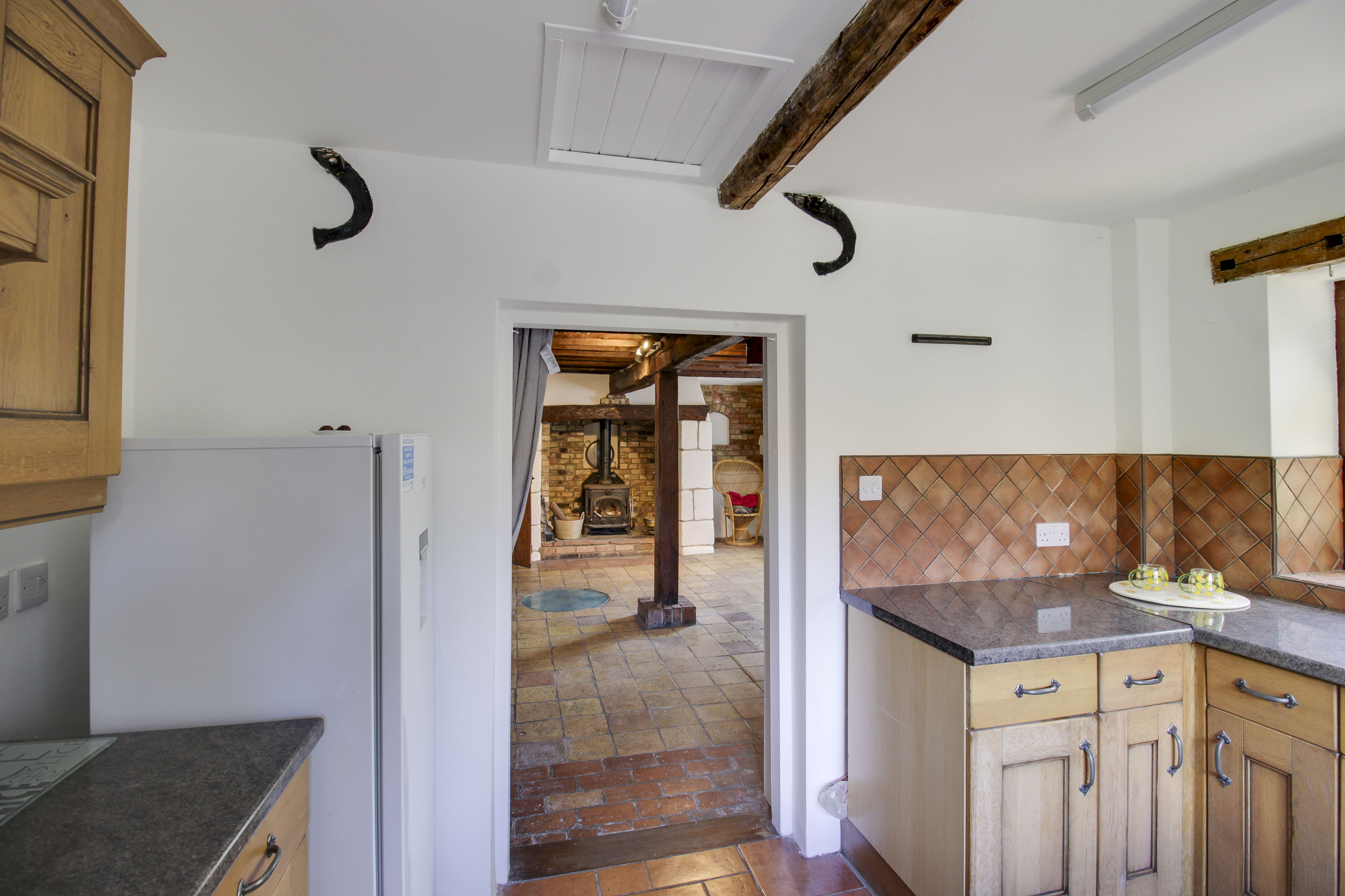 L-Shaped living and family room with large feature Inglenook fireplace with log burning stove. Three windows to the front aspect, window and door to side and additional two windows to rear. Stairs to first floor. Tilled floor. Feature exposed beams and exposed herringbone brickwork. Wall lighting.