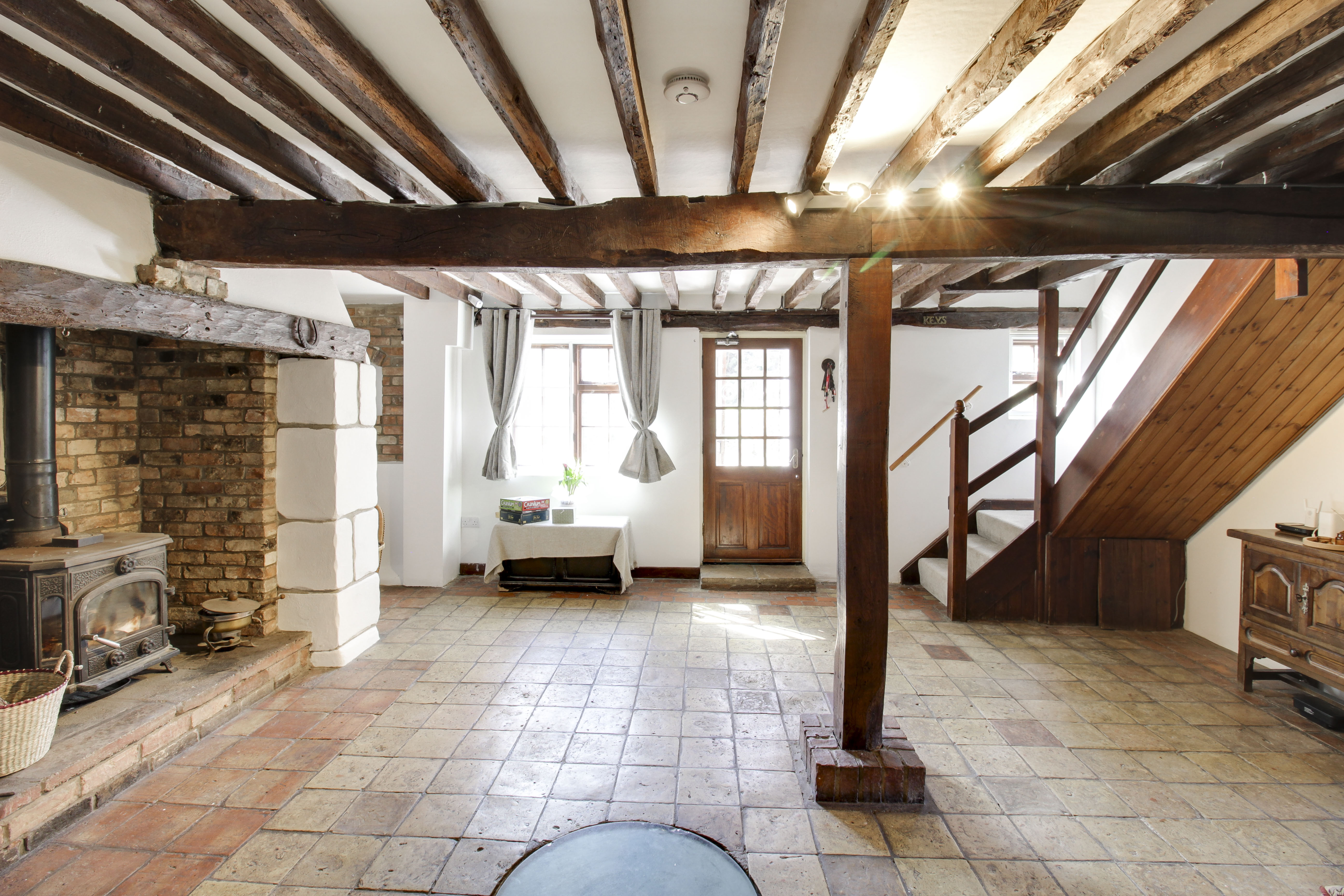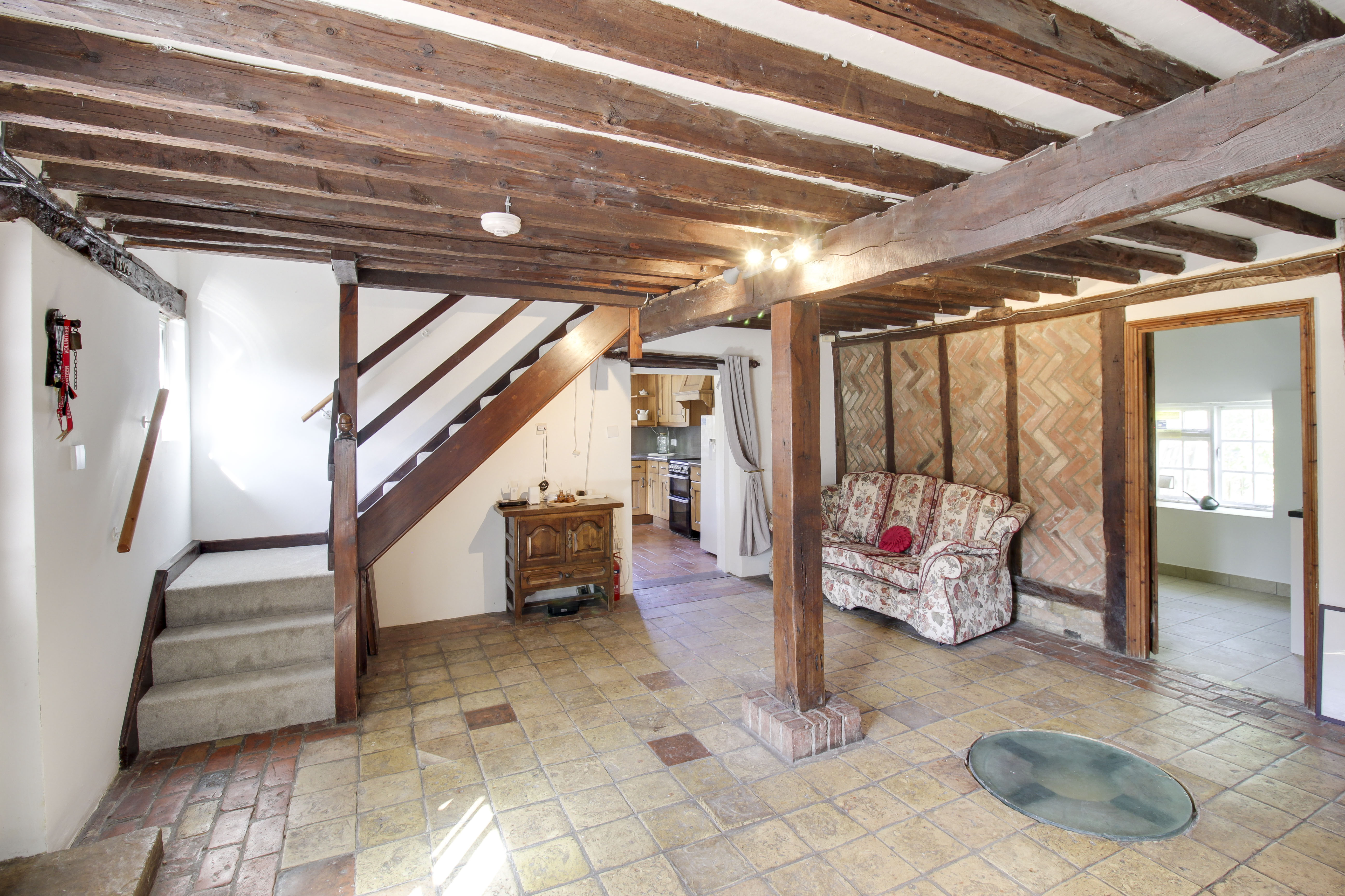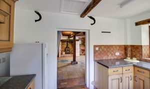 Inglenook fireplace with wood burning stove. The property has its own Well with feature lighting and glass cover. Exposed pillar and beams. Original stone flooring Stairs to Bedroom One on the first floor. Doors to kitchen, utility room and living room.